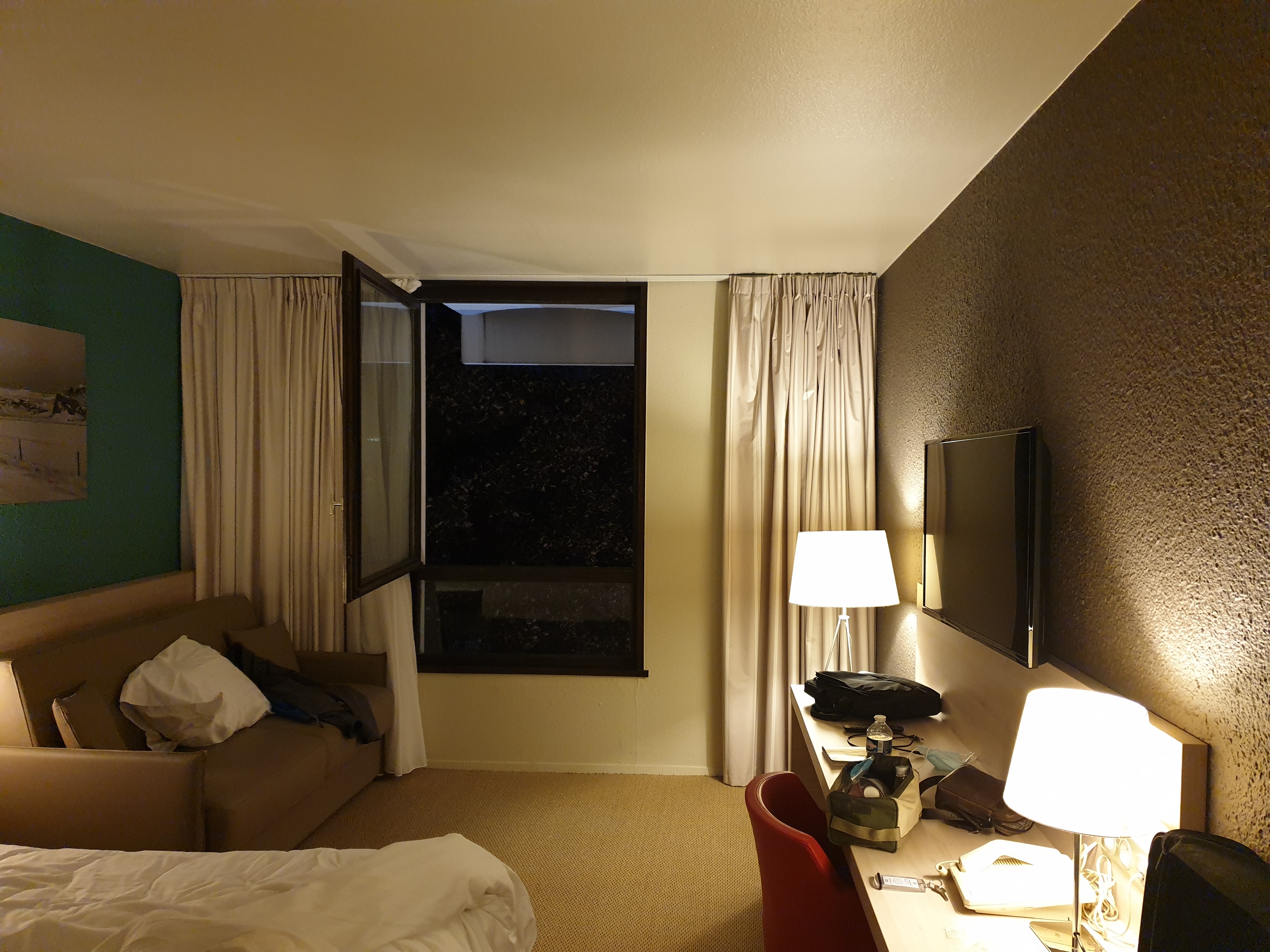 chambre spacieuse, besoin d'etre rafraichit, grand bureau pour travailler, manque frigo table top. resto de bonne facture, un second choix pour les soiree etapes serait un plus. petit dejeuner de bonne facture. grand parking pour se garer bon hotel dans son ensemble, ideal pour soiree etape