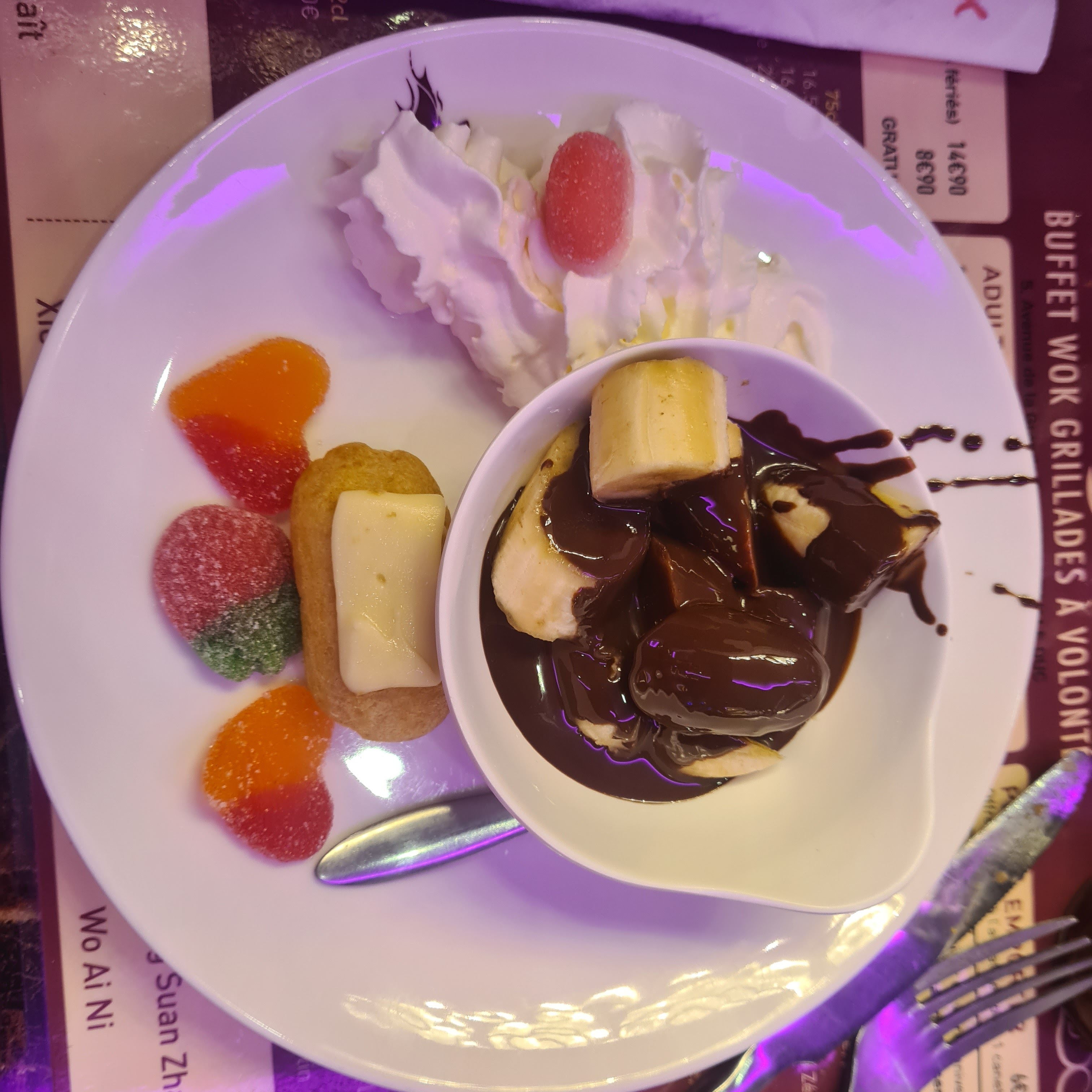 Expérience globalement satisfaisante pour un buffet à volonté asiatique, on sait ce que l'on recherche quand on va dans ce genre de restaurant et les attentes ne doivent pas être trop élevées. Addition assez chère pour deux : 50,80€ (le soir) avec un coca et un jus de litchi... Pas de chance, il y avait beaucoup d'enfants en bas âge (bruyants) mais ce n'est pas la faute du restaurant. Le choix est là, tant dans les entrées que les plats, mais des fautes d'orthographe sur les ardoises. Les rouleaux de printemps étaient très bons en revanche, bonne surprise ! L'îlot des desserts était le vrai bon point du repas : fontaine à chocolat, chantilly à volonté, bonbons et farandole de mini-desserts.