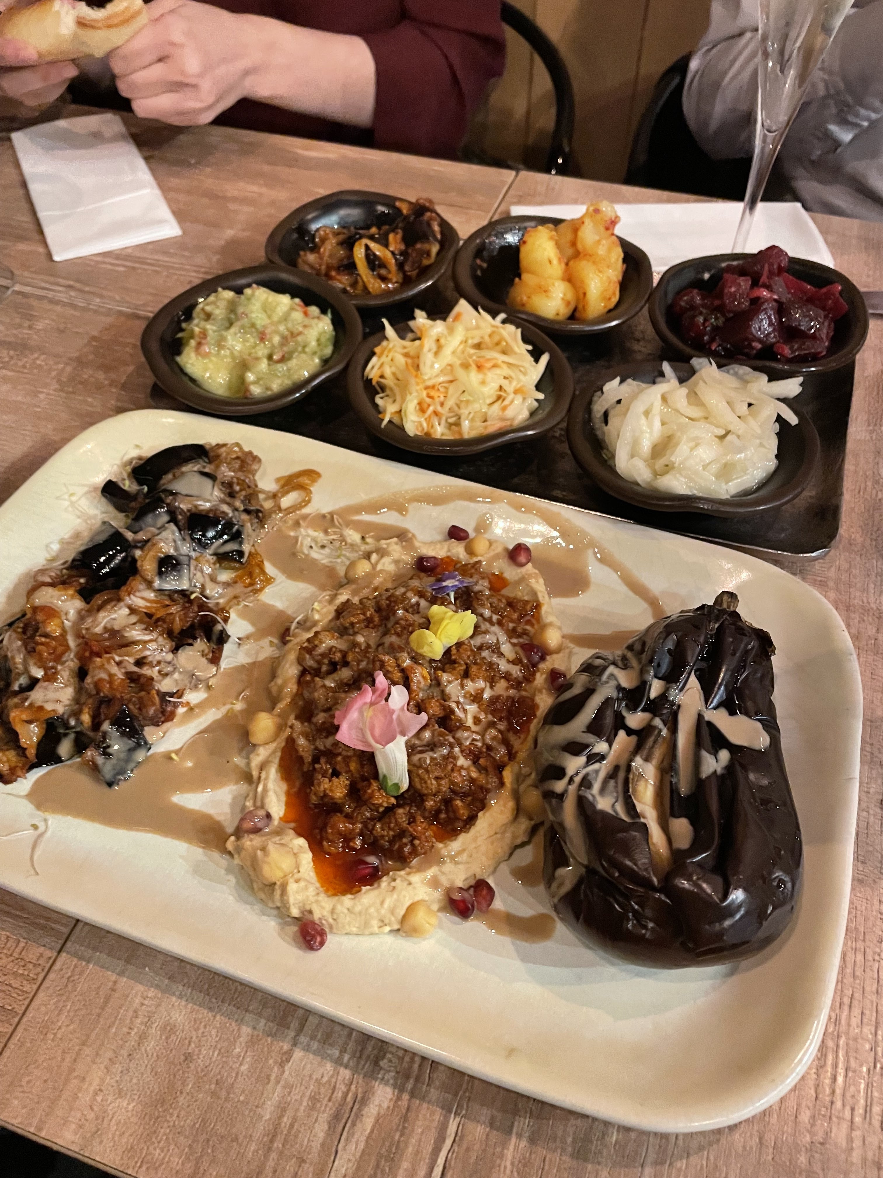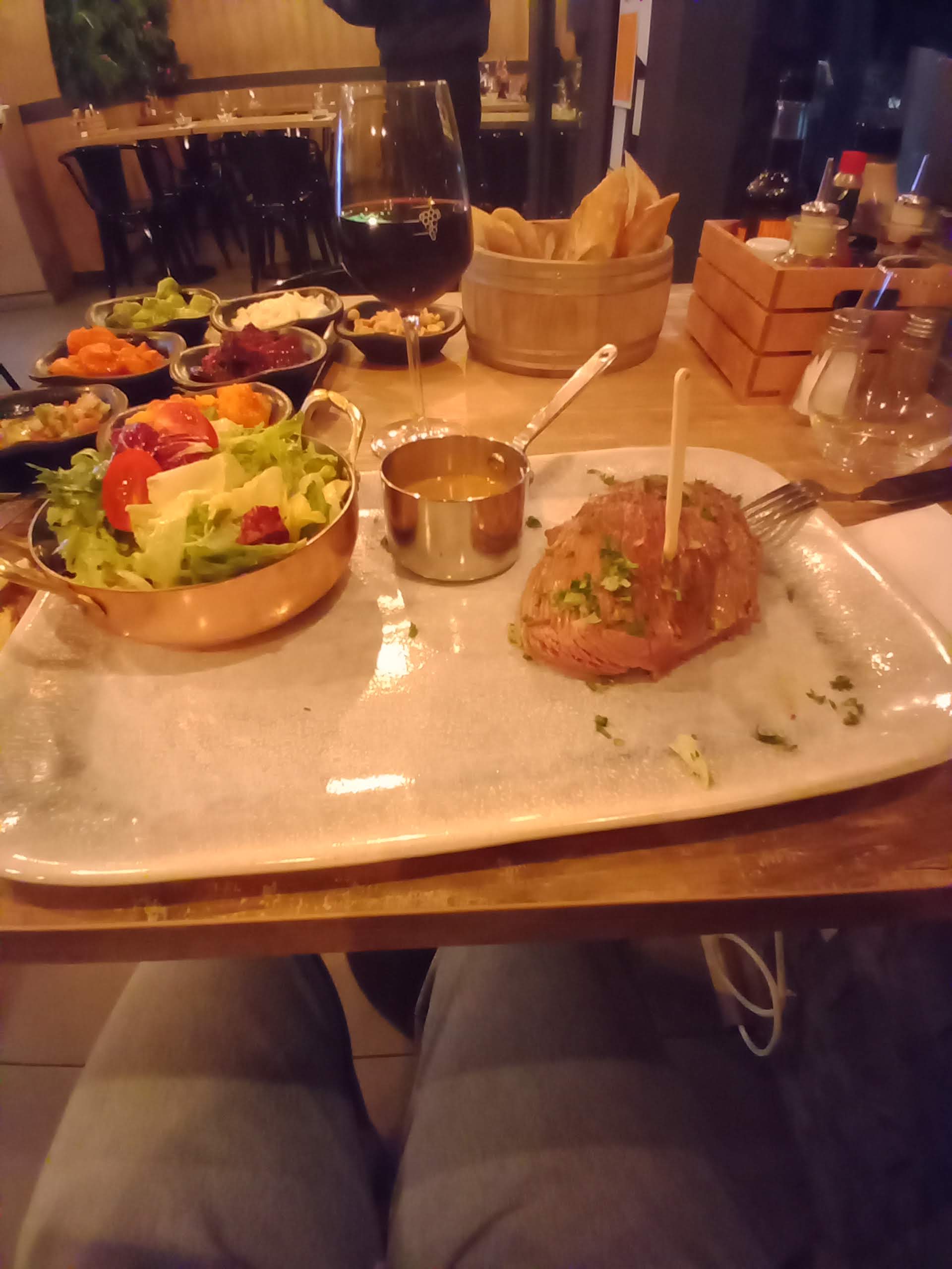 Pas eu le temps de manger la kemia que les plats étaient déjà sur la table. On a donc jonglé avec les deux en même temps .. pas top A part ça, bon service même si un peu speed. Repas copieux, frais, mais trop gras, travaillé et assaisonné à mon goût. J'ai pris une salade landaise, et j'avais du mal à sentir la saveur des viandes. Le dessert : fondant au chocolat très coulant, avec boule de glace et fraise chantilly + coulis Moyen .. le restaurant semble pourtant avoir très bonne réputation, je n'ai peut être pas bien fais mon choix sur la carte, dommage