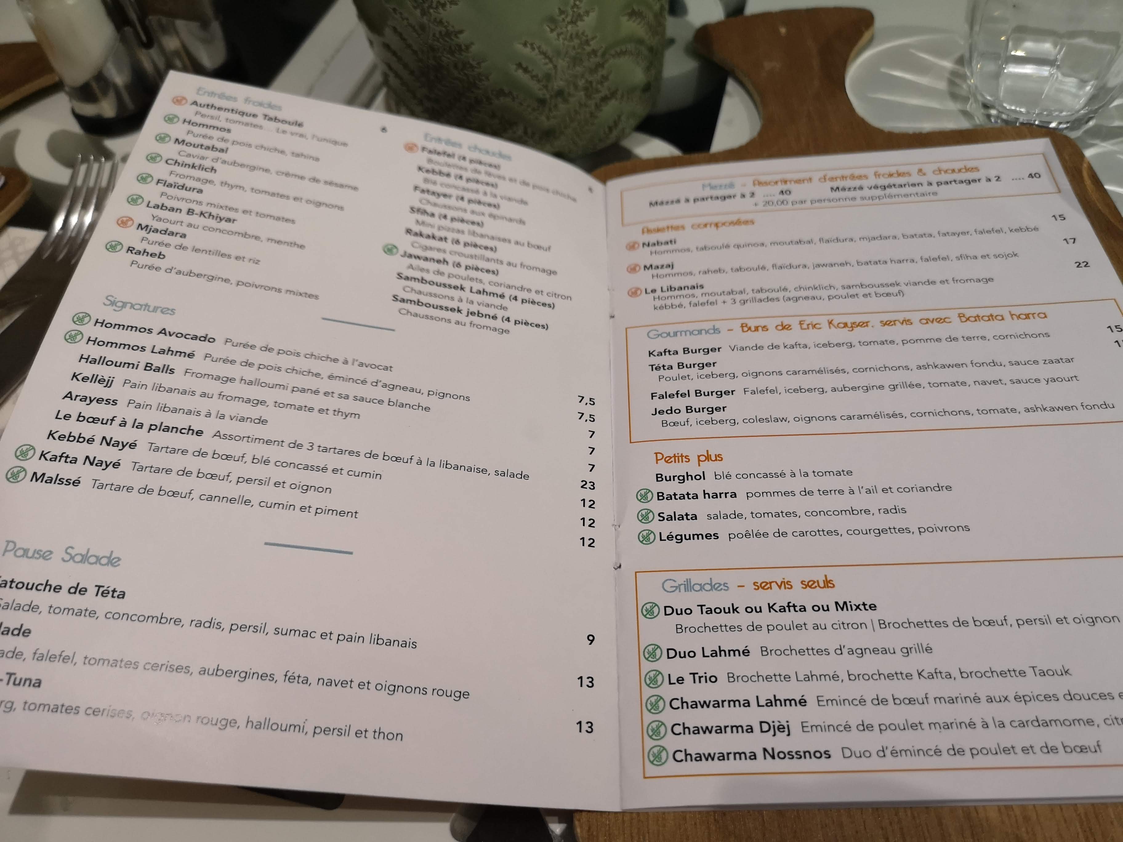 Delicieux. Beaucoup de choix. Grande terrasse et aérée. Personnel gentil et de bons conseils. J ai adore les houmous classiques et à l agneau. La biere a la sauge est originale et delicieuse. Les petits gateaux font une bonne fin de repas.