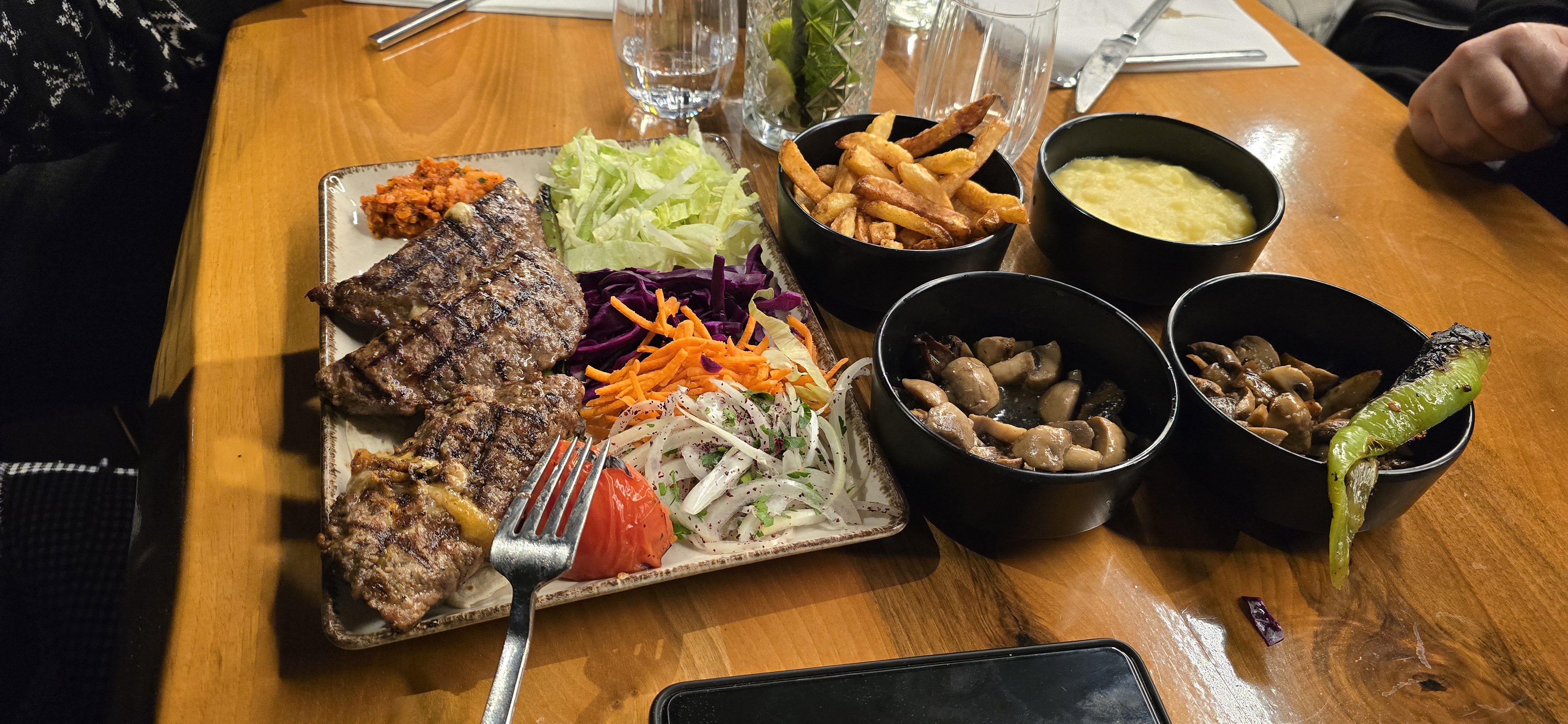 Je déconseille ce restaurant. Tout d’abord, l’attente pour la prise de commande était plutôt longue, malgré la seule présence de deux familles déjà servies et présentes dans la salle ce soir là. Après la prise de commande, aucun condiment, ni pain et ni eau ne nous a été servis. Ensuite, pour ce qui est de la cuisine, la viande est correcte, mais on a regretté l’absence de sauces pour accompagner les viandes, et aussi de pain. Nous avions commandé des mini kebabs, on s’est retrouvé avec des tacos. Nous l’avons signalé, mais la serveuse nous a dit que « si si ce sont des kebabs ». Connaissant bien la gastronomie turque, je n’ai jamais vu des kebabs servis dans des tortillas…Et même pour des tacos, la galette tortilla est censée être passée au four pour les rendre dures et croustillantes. Et bien pour nous c’était des galettes molles. Les portions sont maigres, on avait encore faim en sortant du restaurant et pourtant on avait pris pour deux personnes un menu à 50€ (mix de viandes avec accompagnements) et on n’est pas de gros mangeurs. Nous ne reviendrons plus.