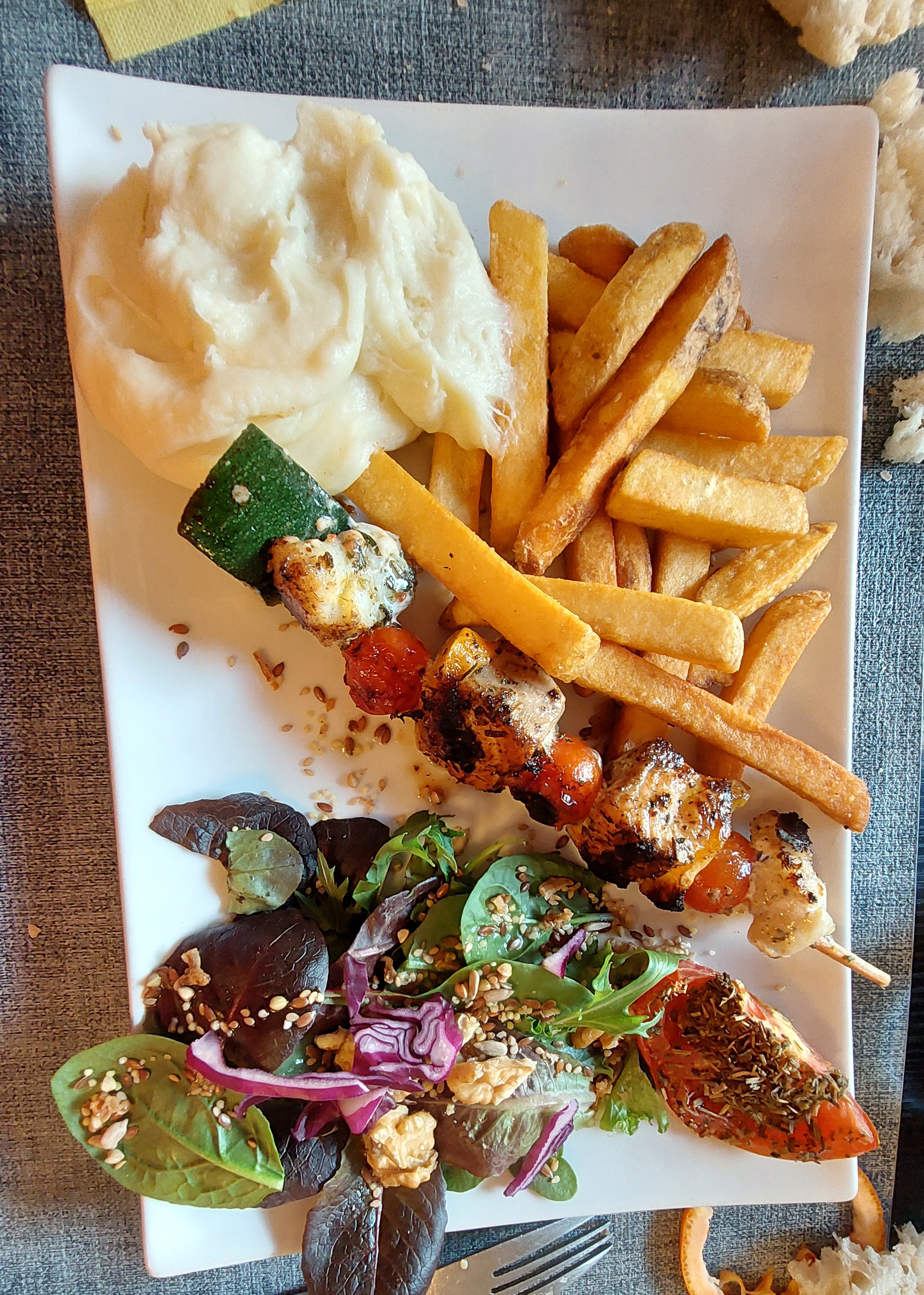Repas servi rapidement, mais pâtes froides et sèche par endroit, carbonara pas bonne. Sur un autre plats les frites sont plutôt des pommes frites ( molle ) et le yaourt au fruits frais est très acide. Sinon le service est bien.