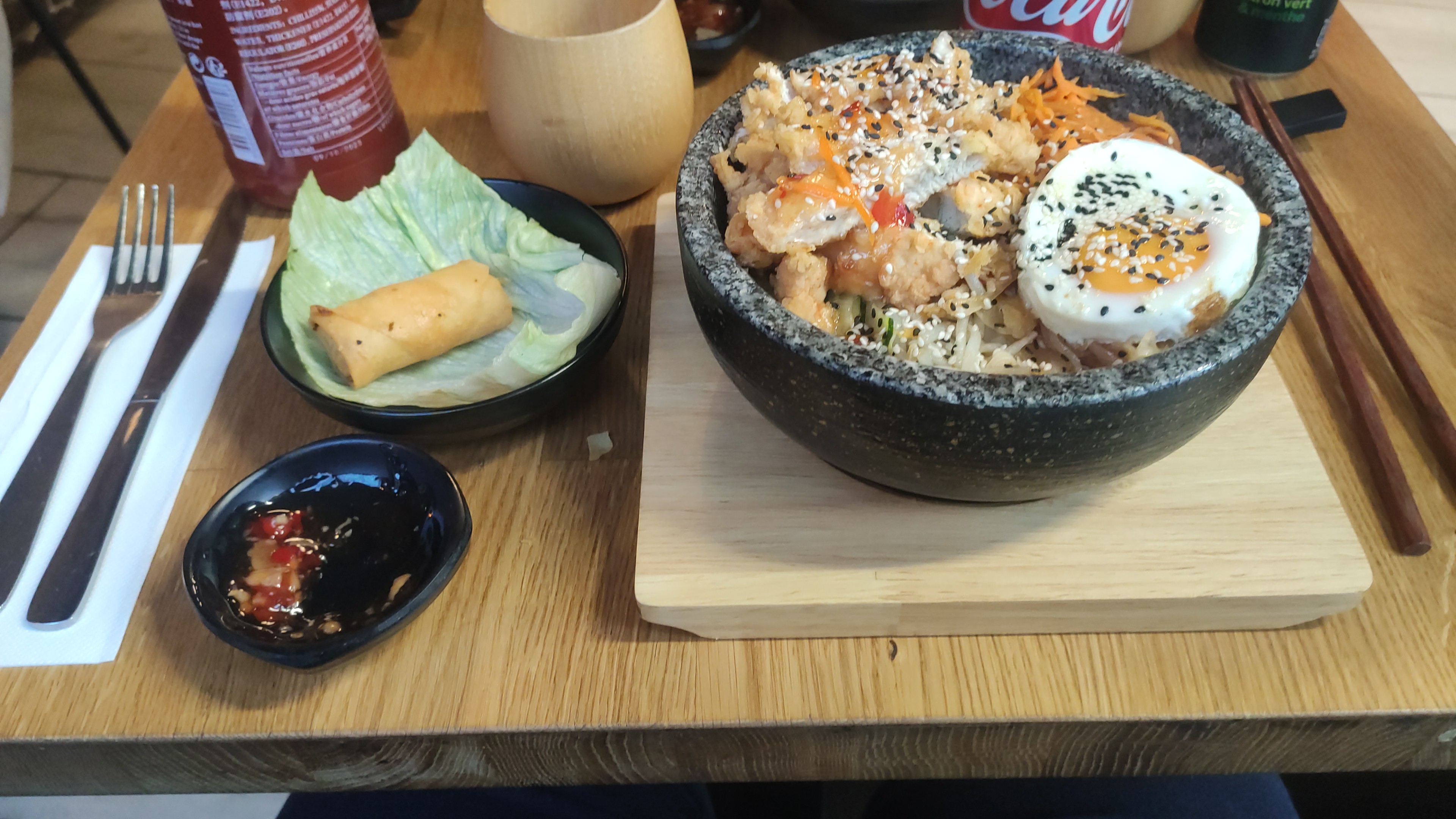 Très déçue, Pas de goût dans les plats, bimbimbap au bœuf pas frais (il sentait assez fort), bimbimbap au poulet saté bien sec. Seul bon point, les plats sont super chargés.