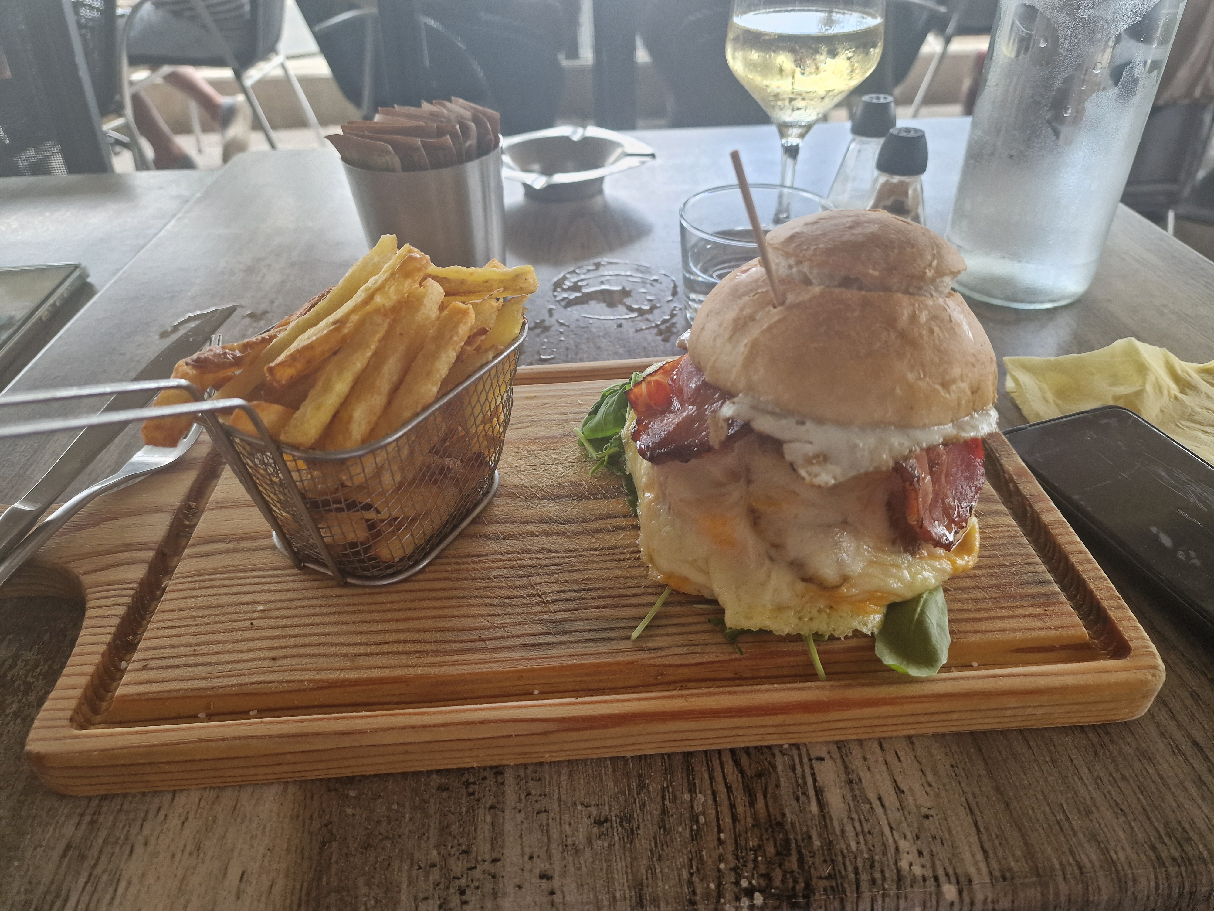 Grispy burgers excellent (jamais mangé un burger aussi bon) . L’originalité : tremper ses frites dans le jaune d’œuf directement dans le pain du burger ! Spritz généreux et cadre au top !