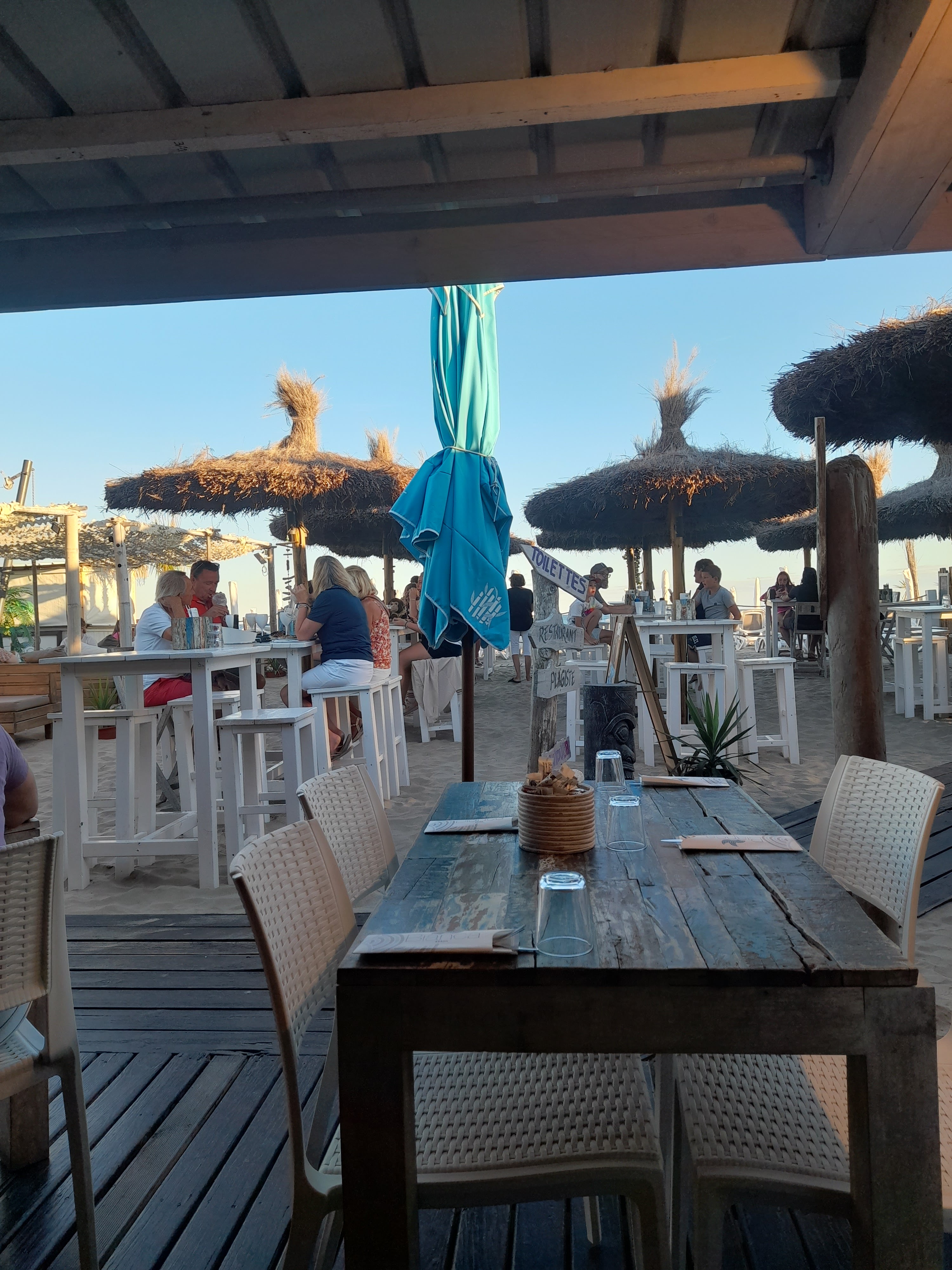 Nous sommes venus le soir du feu d’artifice. À peine assis déjà dérangés par les enfants qui courent et jouent dans le sable et une table de 7 ivrognes qui hurlaient. Seule une serveuse a été sympa et souriante contrairement aux autres a qui ça arracherait la gueule un peu de politesse et je ne parle pas du plagiste qui hurle sur ses clients qui marchent dans le sable qu’il a visiblement aspiré avec soin! Et lors de payé passe au milieu de tout le monde en courant et jouant des coudes en lâchant des « attention urgent! » pour récupérer un verre d’eau. La cuisine, service froid, je n’ai rien dis parce qu’on avait déjà bien attendu. Je déguste mes palourdes fades et sans goût qui m’ont laissé un beau mal de ventre tout comme la dorade à 2 autres personnes de la table. Et les cafés ont été visiblement importés du Pérou le soir même. 20 minutes pour 5 expressos. Bref, si vous avez des gosses intenables et que vous aimez la musiques moyenne avec un dj aussi fade que les palourdes, c’est parfait.