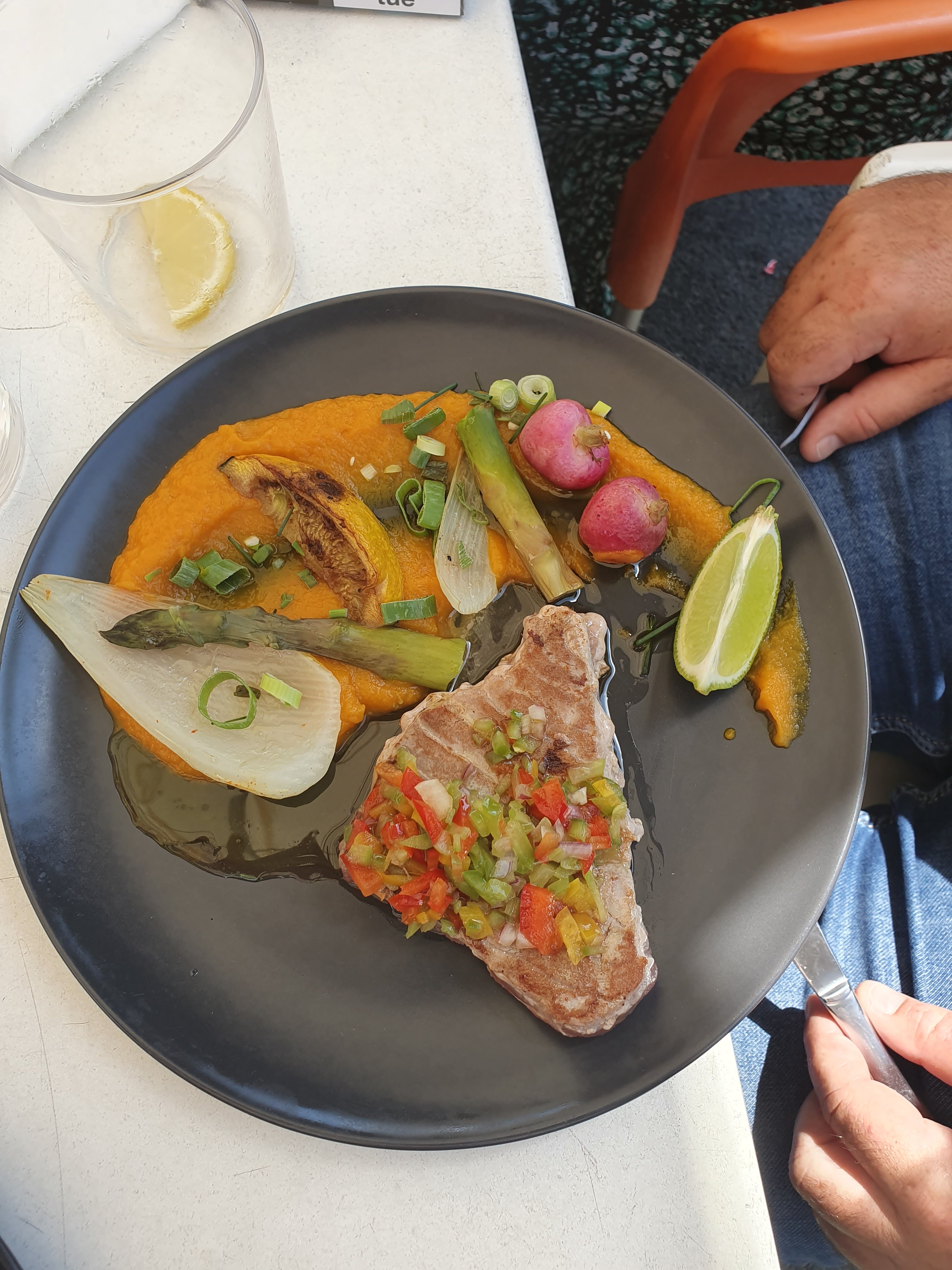 Lieu bien aménagé et ambiance sympa. Le problème est au niveau des plats de poisson ou viande qui sont bien préparés et présentés mais avec très peu d'accompagnement... Du coup cela ressemble presque à des entrées qu'à des assiettes copieuses... Pour le prix (16 ou 17€ le plat) On reste sur sa faim ...