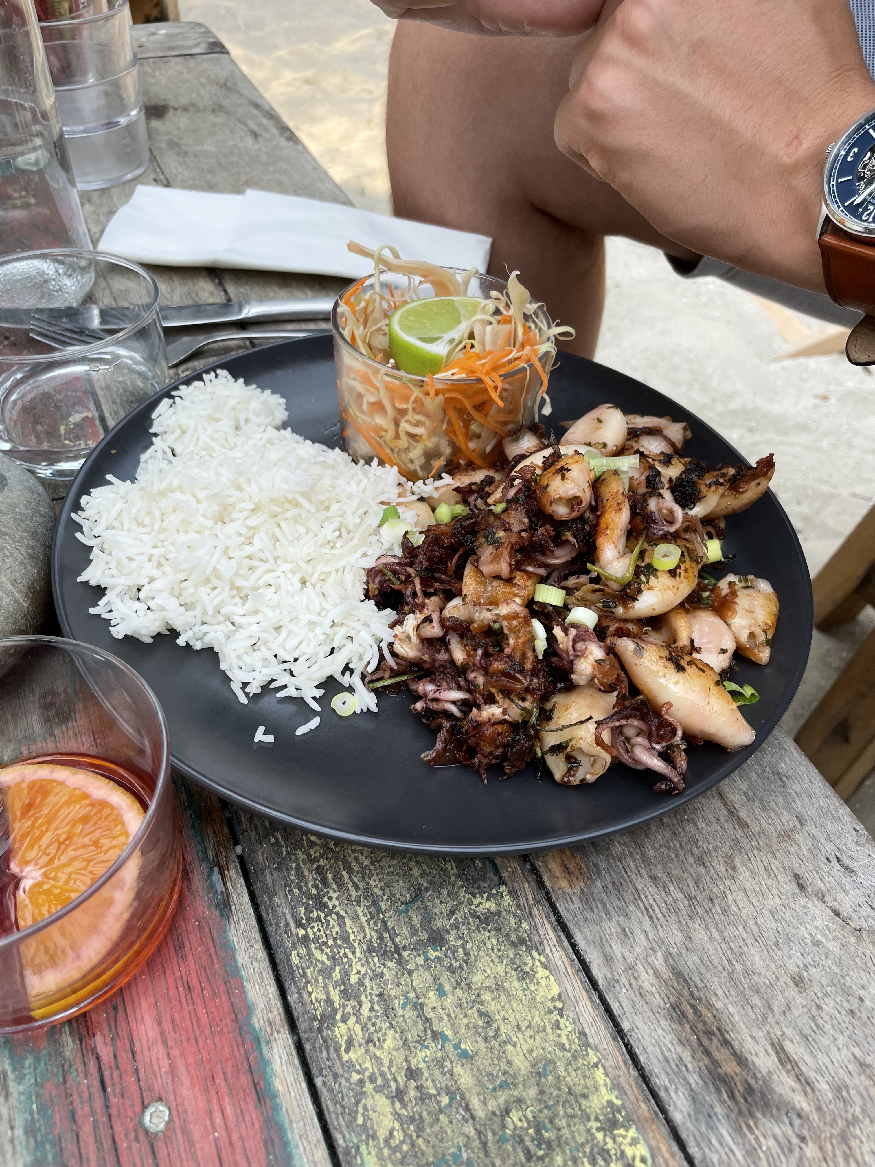 Ambiance tranquille, très bien mangé avec les pieds dans le sable sur des petites tables. Belle vue sur l océan. A faire si vous passez dans les coins