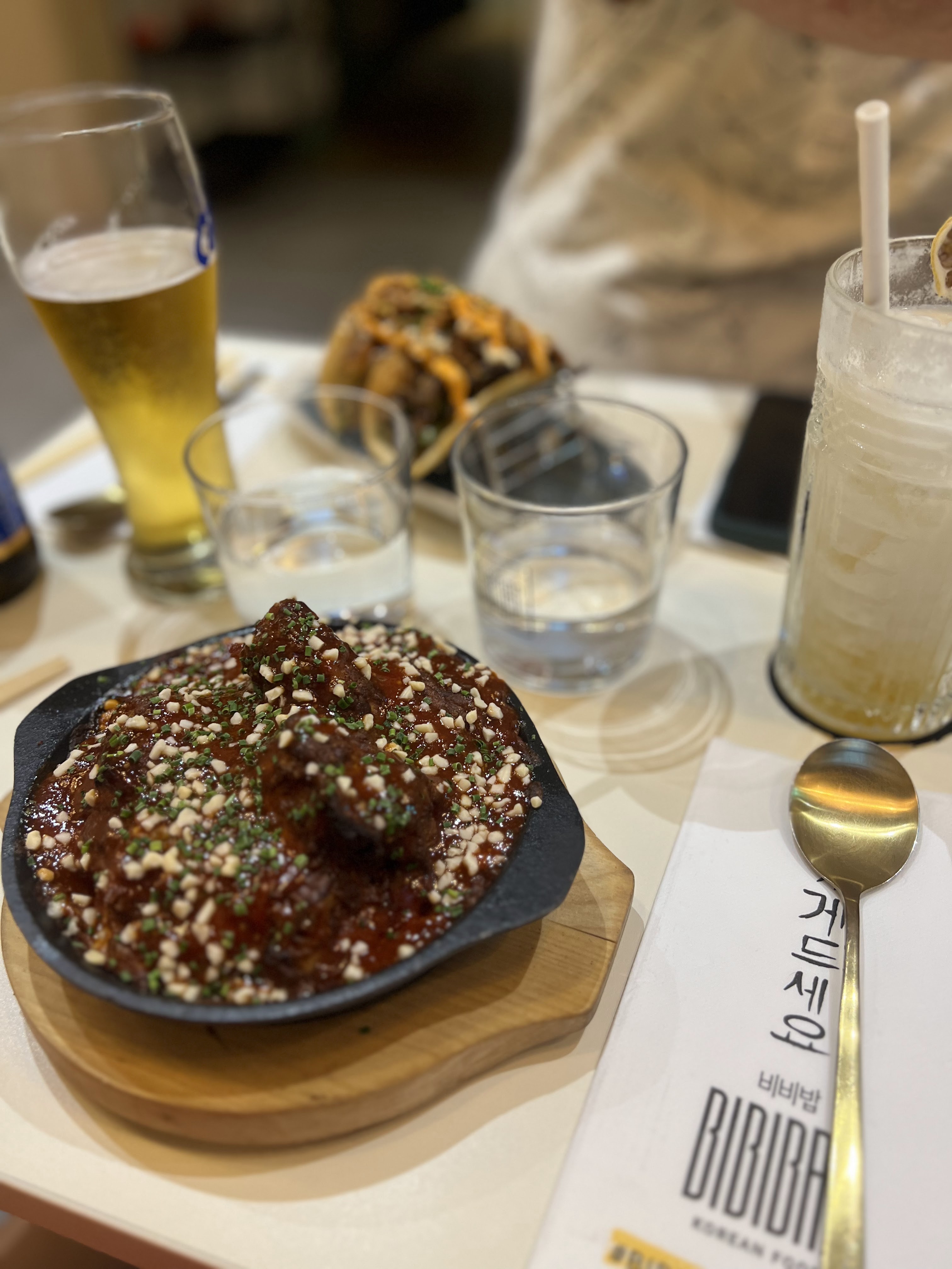 D'abord le service, être jeune et élancée ne dispense pas de sourire, ni d'avoir un minimum d'amabilité pour répondre aux questions sans avoir l'air superbement agacé. Nous avons pris en entrée partagée un dak gangjung très bon. Cela augurait bien. En plat un bibibap gangjung et un chiken deopbap spicy. Et la déception, leur mérite est d'être très copieux, beaucoup de riz d'une belle couleur rouge mais pas très gouteux, un peu de légumes pas terribles, la viande bonne et aromatisée. Bon, nous avons laissé nos bols à moitié plein en picorant principalement la viande.