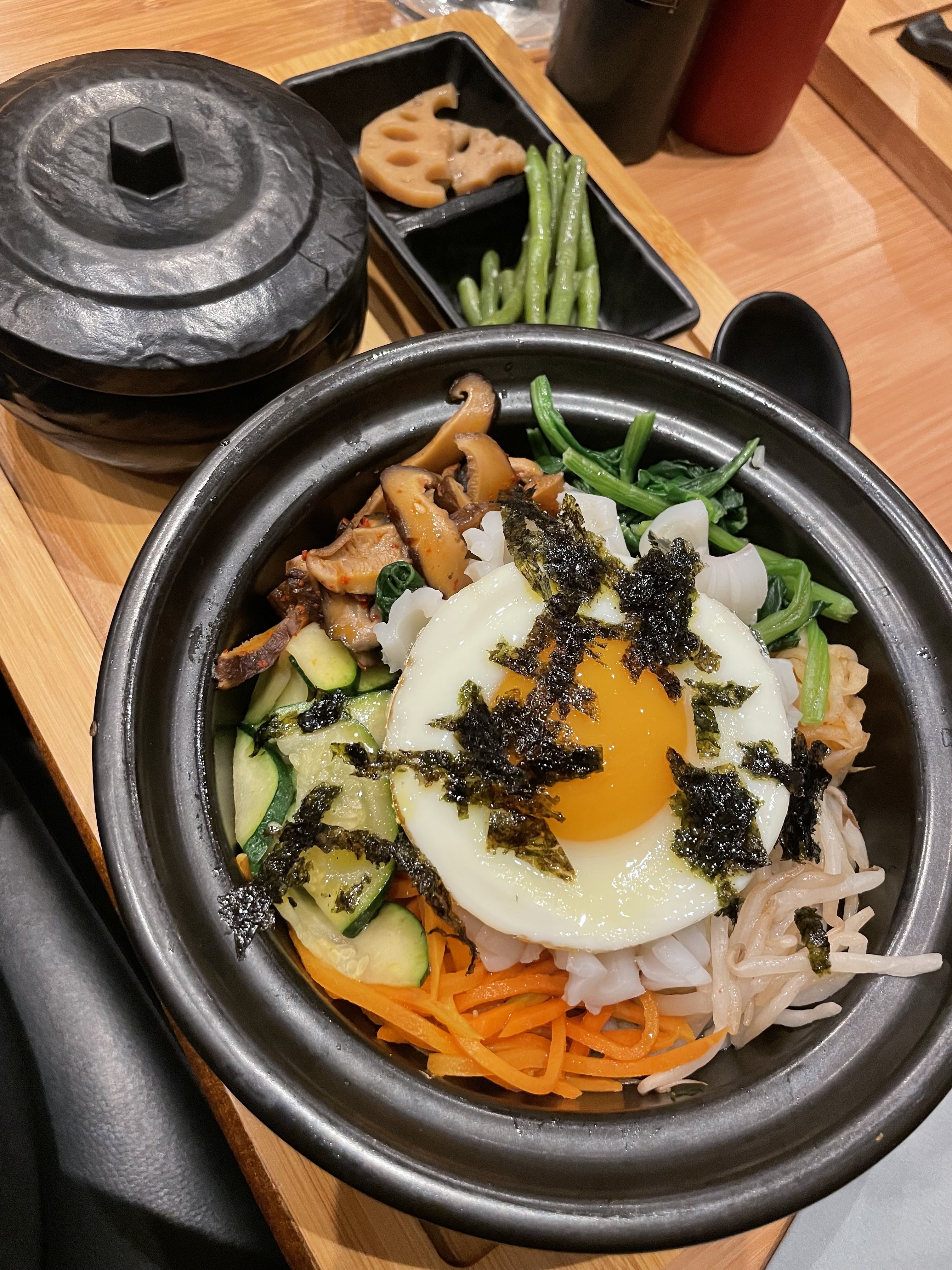 Bibimpap copieux et plein de saveurs, les gyozas aux légumes sont délicieux aussi, petite terrasse sympa devant.