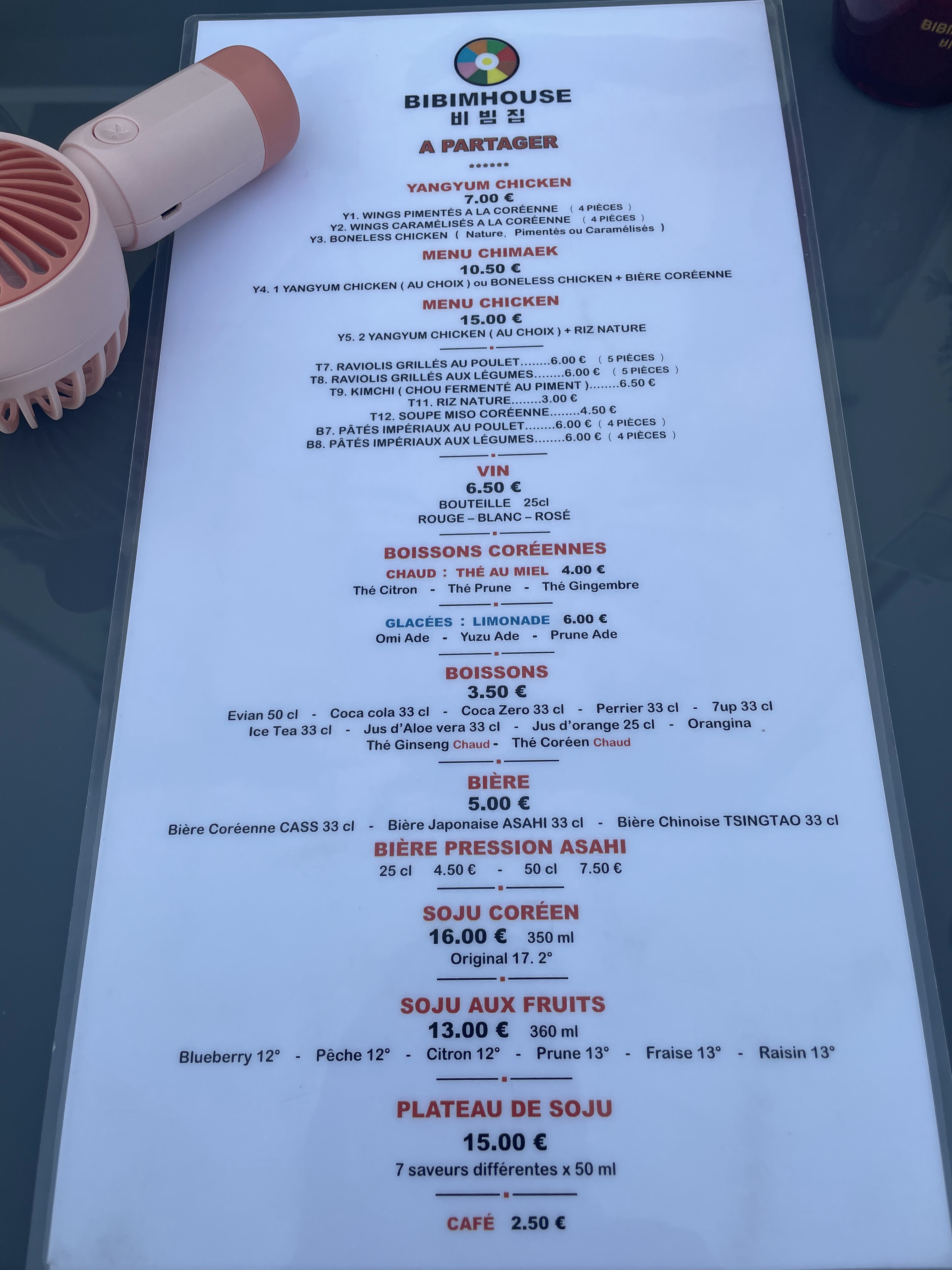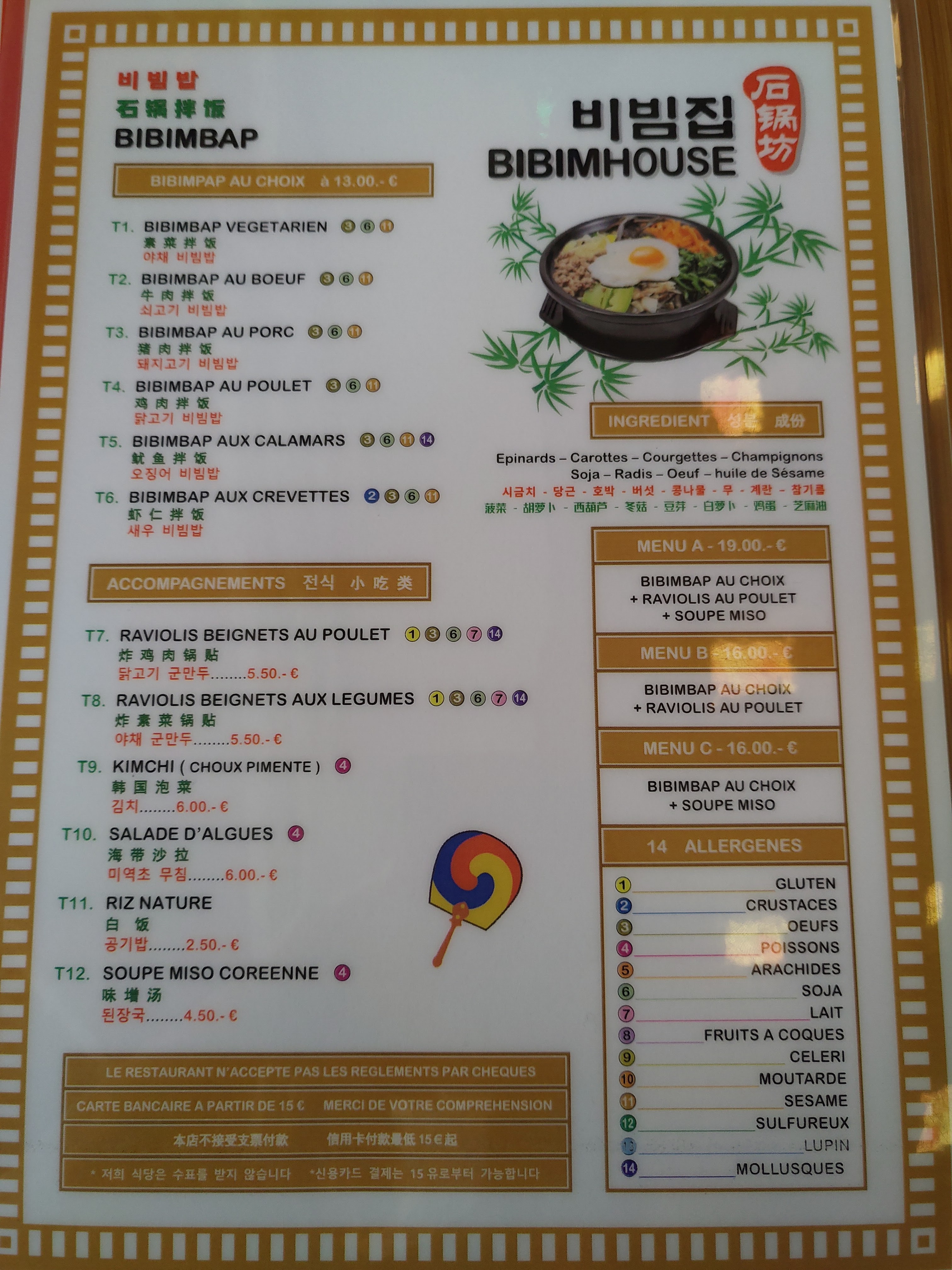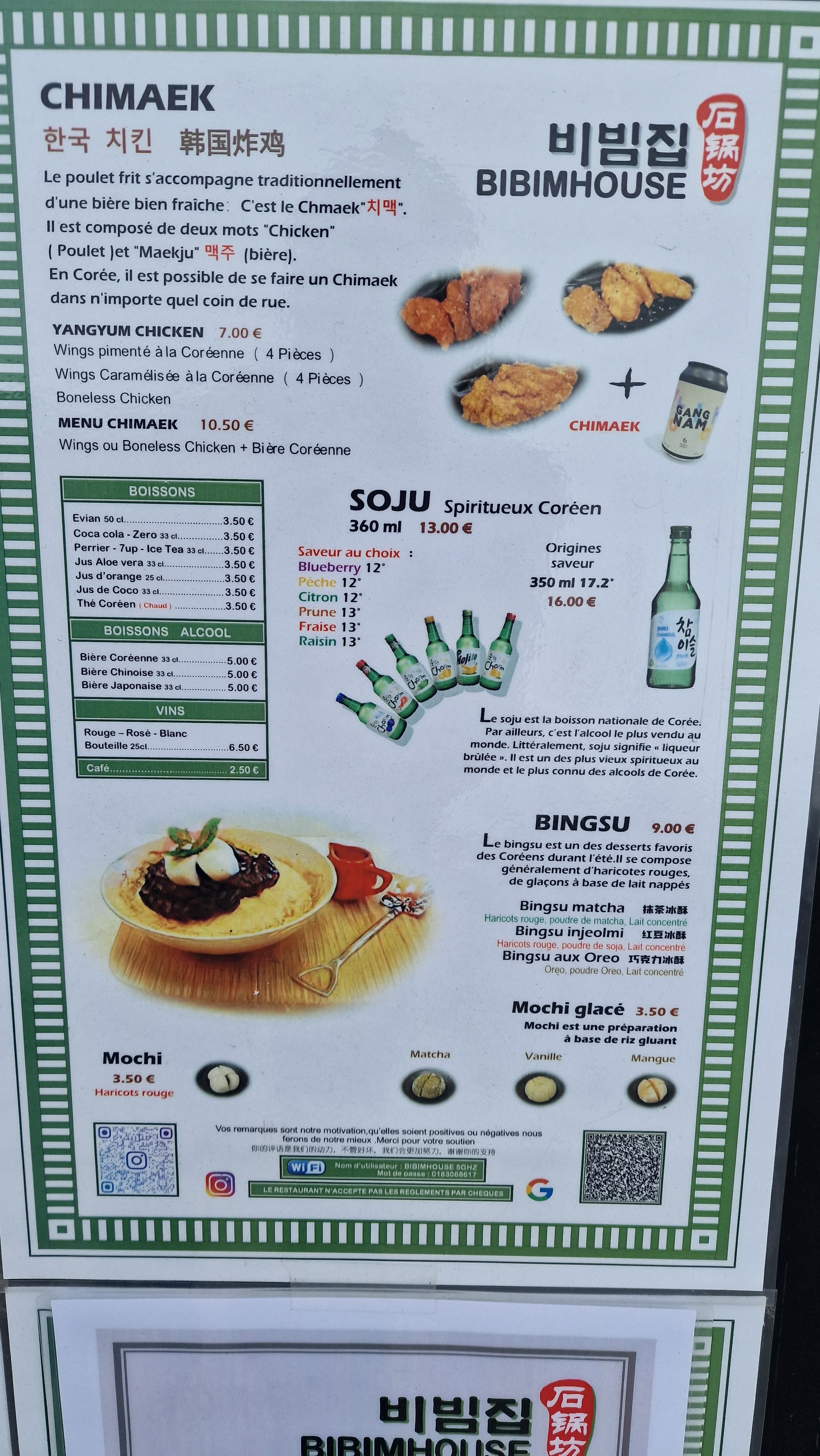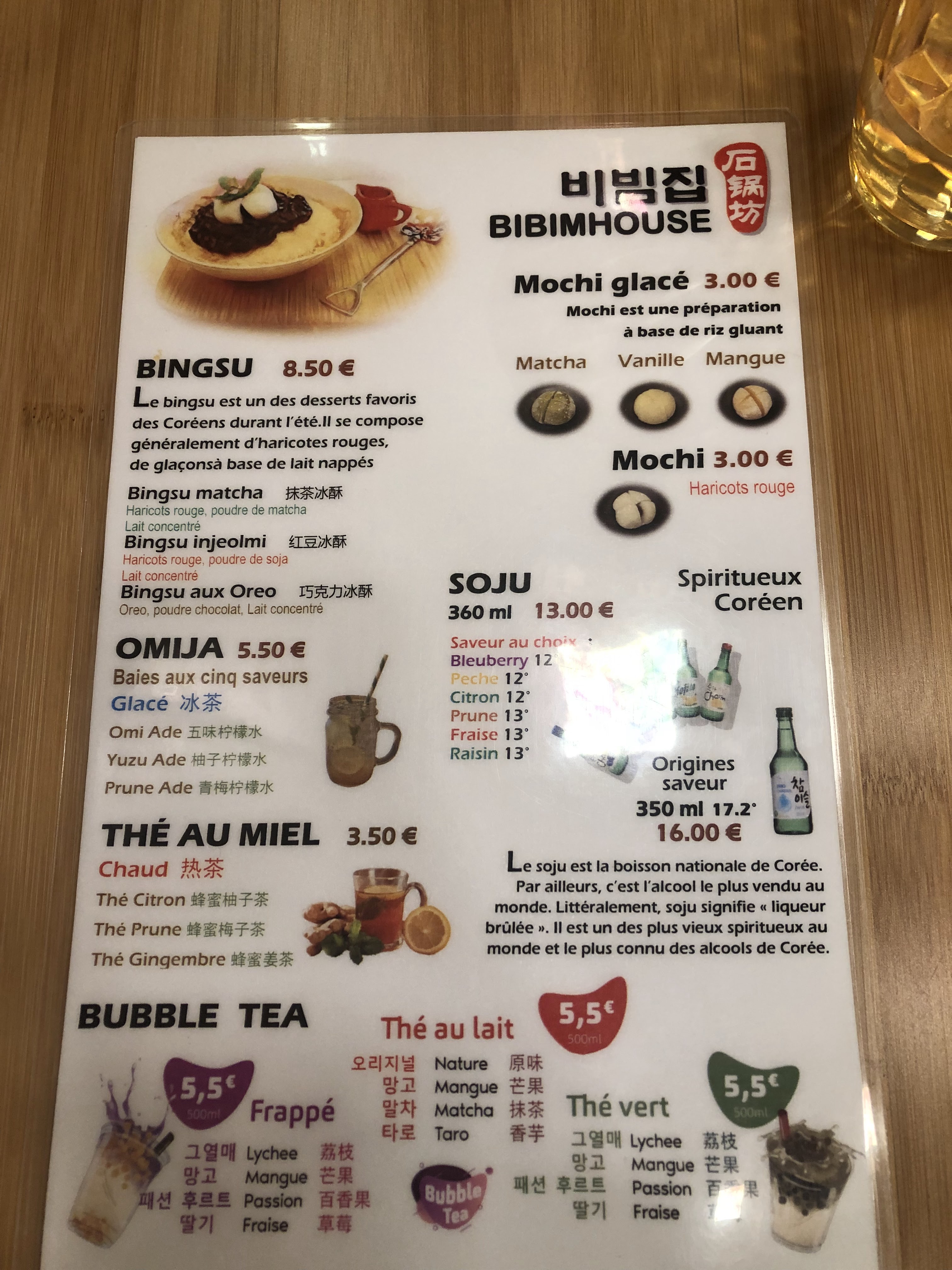 Restaurant coréen ayant pour spécialité le Bibimbap (avec le dessous qui croustille ☺). Une carte assez restreinte mais très claire et suffisante (plusieurs choix de Bibimbap, 3 choix de poulet frits et plusieurs choix de marmites). Par contre un grand choix de boissons (je recommande les omija, des limonades aromatisées mais assez sucrées, 6e par contre). Plusieurs desserts dont 3 choix de bingsu (glace râpée avec des toppings, très frais ❄). La nourriture est vraiment bonne et les Bibimbaps sont copieux. On a adoré le riz croustillant des Bibimbaps ! Prix raisonnables (14e le Bibimbap, 17 à 20e en menu, 9e le bingsu) et service rapide et attentif ! 🌸