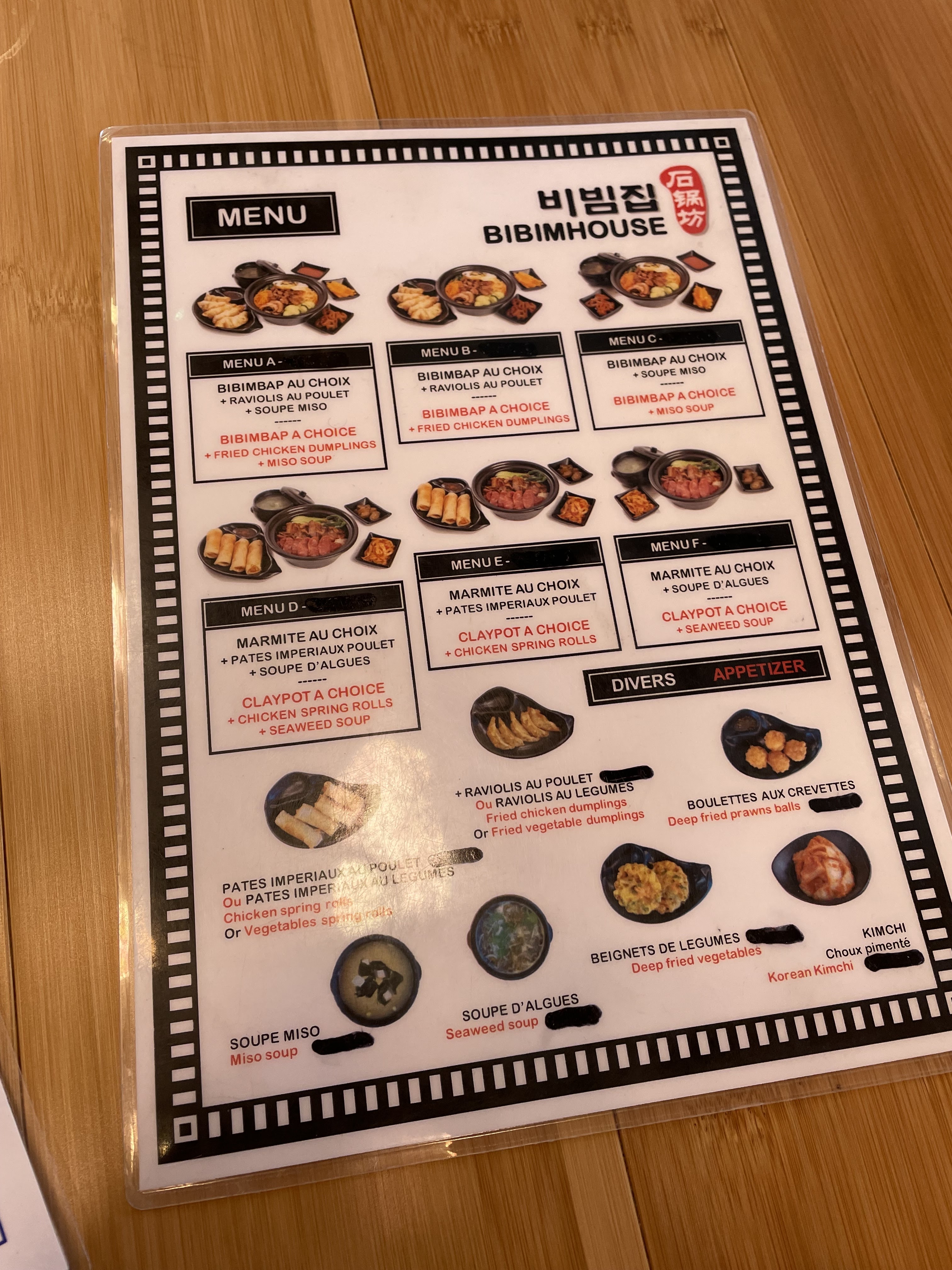 - Menu qui se focalise vraiment que sur ce qu’on aime - Cadre épuré et propre - Les bibimbaps sont très croustillants au fond mais sont un peu sec - Leur marmite de riz accompagné de leur sauce maison fut une bonne surprise - Pas de kimchi en accompagnement