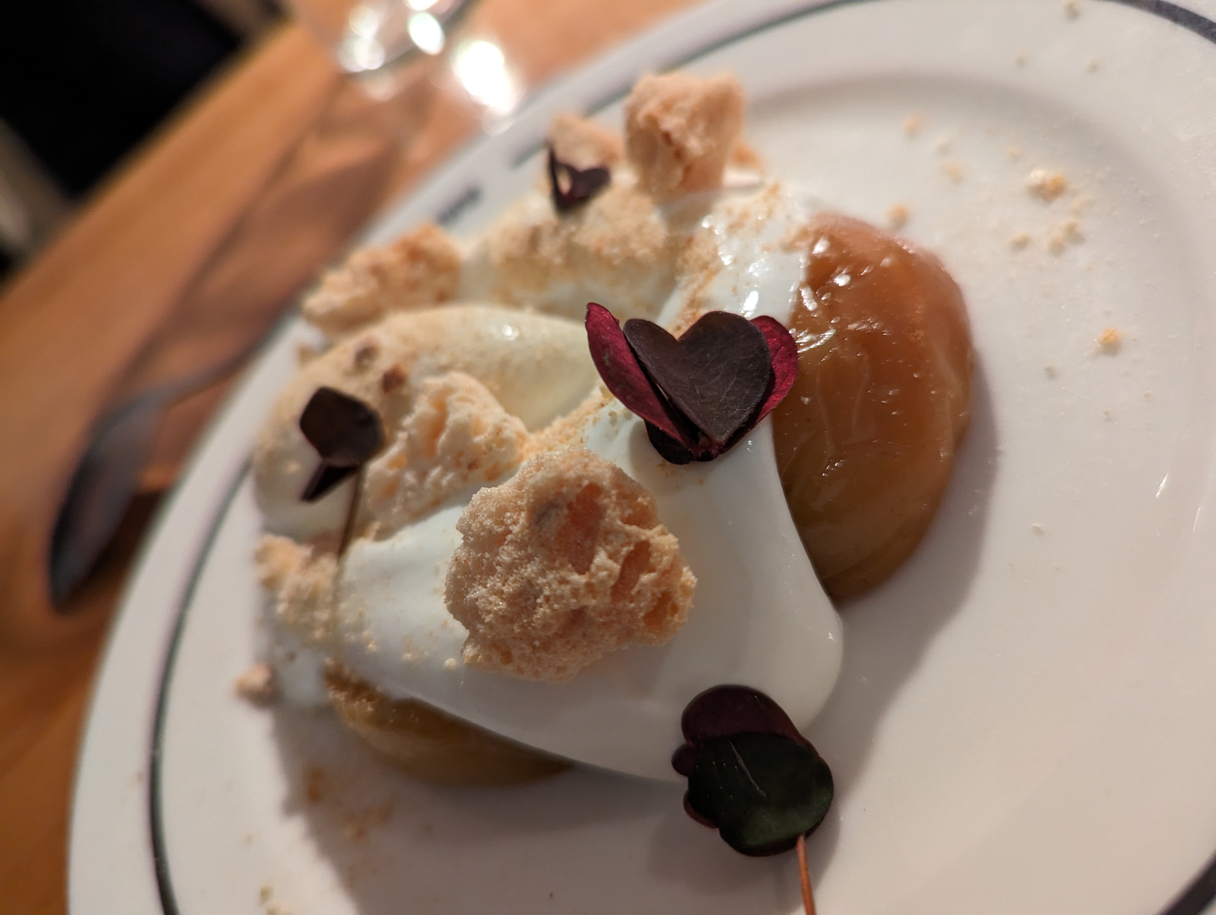Quelque peu surpris... Dommage je m'attendais à un repas super hors du commun....top chef quoi... Entrée poireau mousse et tomme râpée, plat langue de boeuf en guise de pièce de boeuf.. 3 sur 4 n'ont pas aimé et pas de plat de secours, on m'a apporté le même plat sans langue avec des pleurotes...Pour info la langue de boeuf fait partie des abats rouges. On nous a demandé s'il y avait des choses que l'on n'aimait pas... Oui champignon et il y en avait dans le dessert !!!! La surprise n'était pas là ni le goût d'ailleurs... Trop cher pour ce qu'il y avait dans l'assiette...