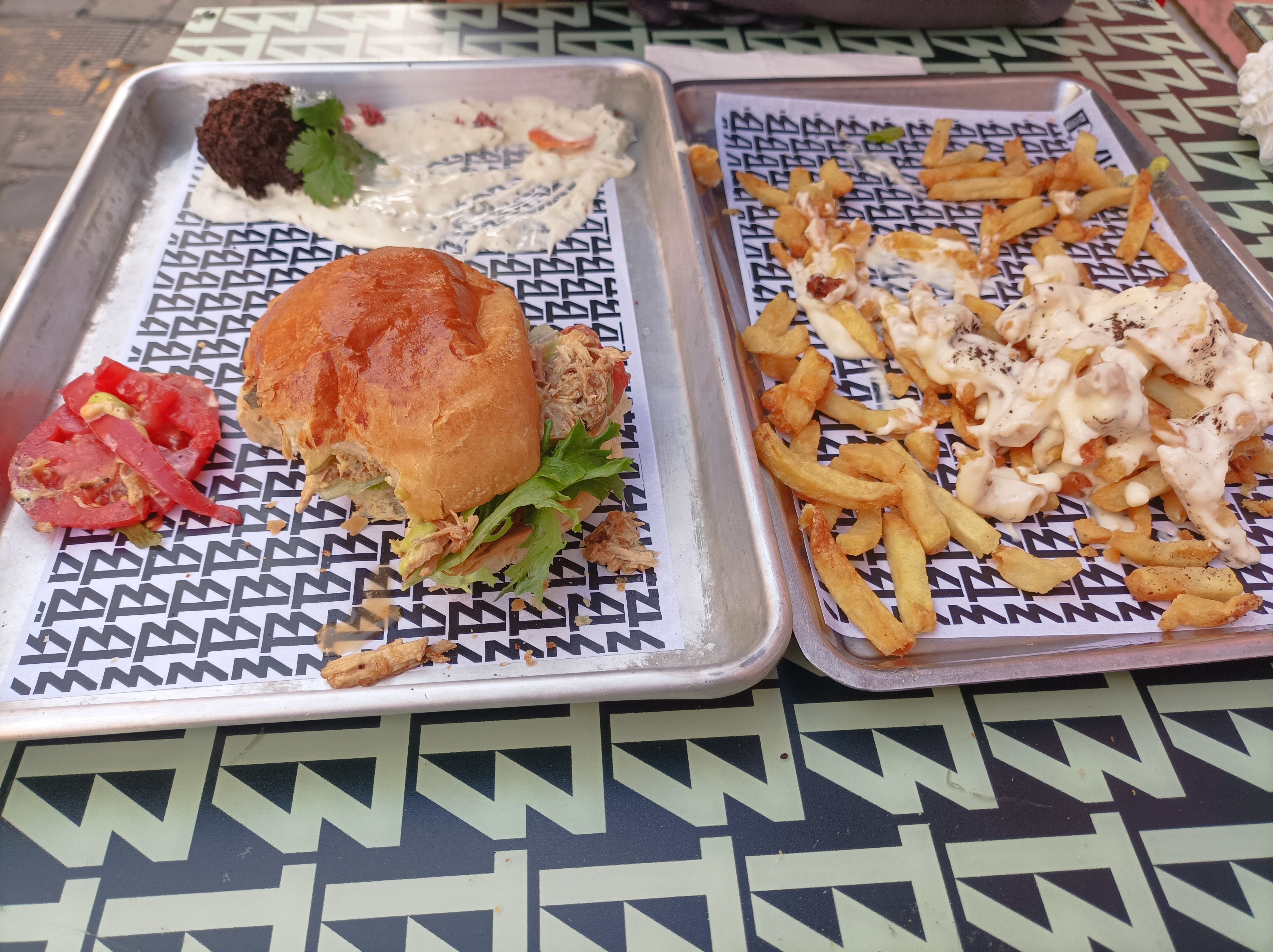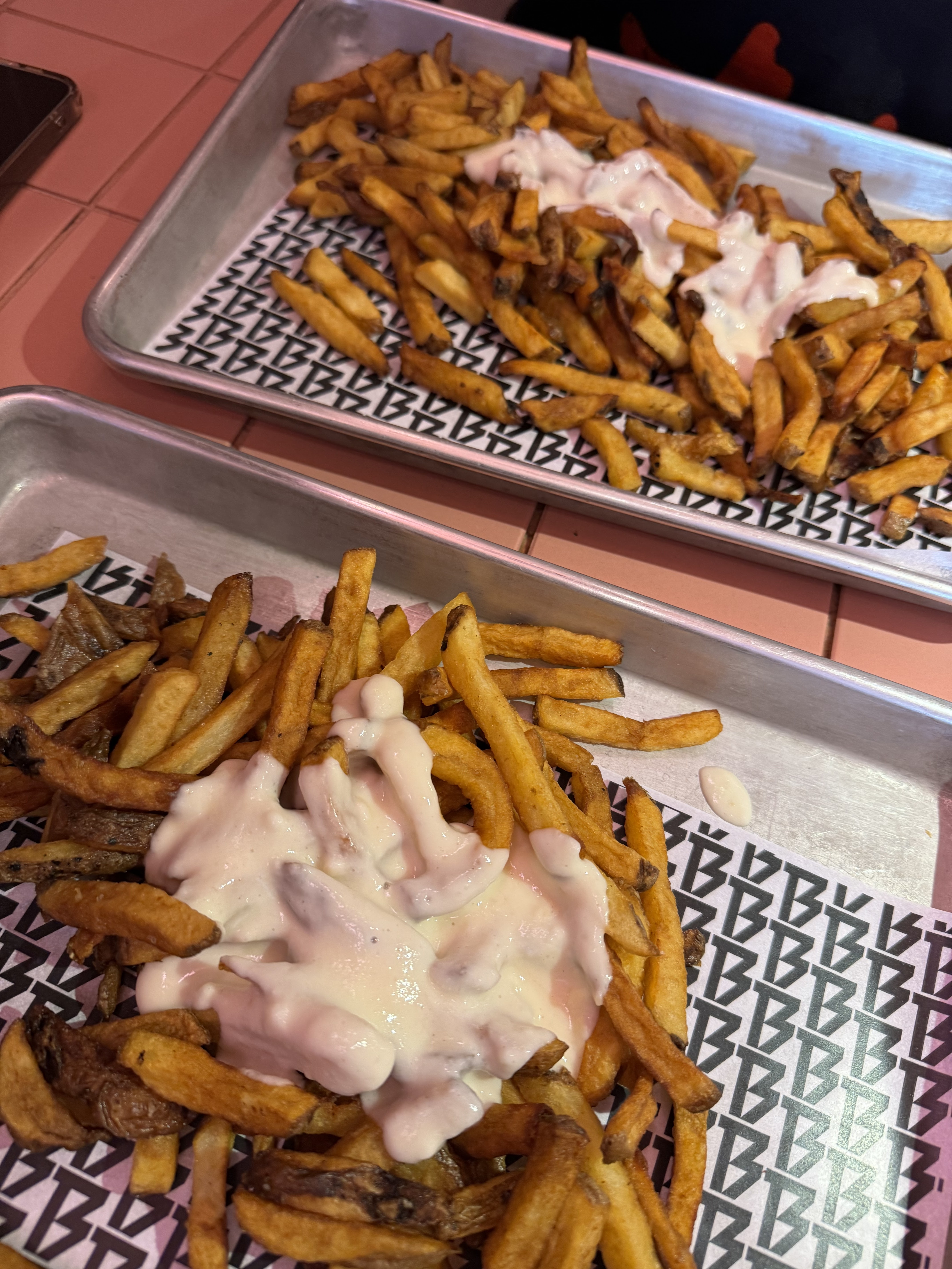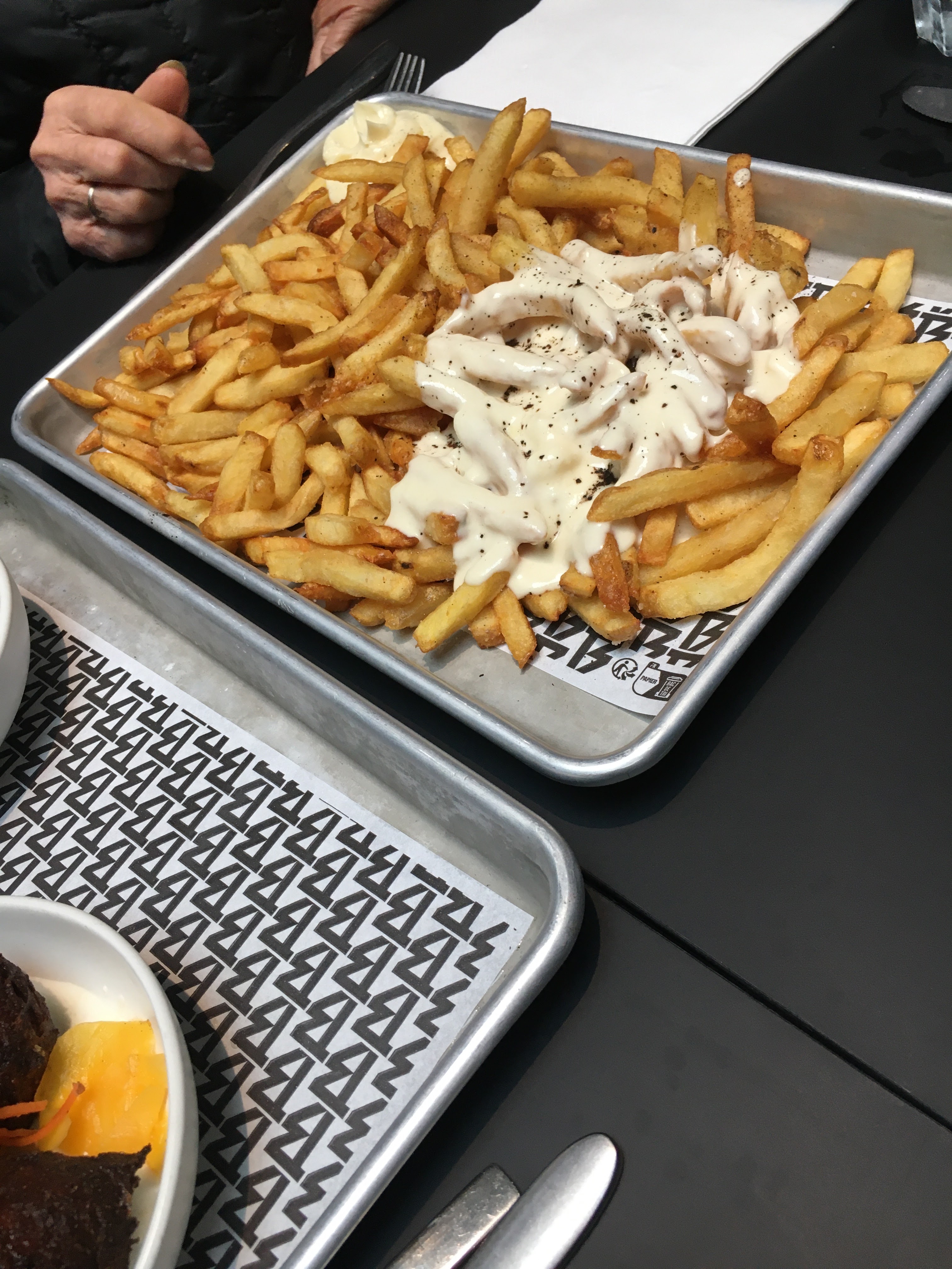 Très bonnes frites, que ce soit au maroilles ou même avec la sauce piquante, peut-être même les meilleurs que j'ai mangés dans un restaurant. Et la glace au lait était excellente aussi. En revanche le buns le viande effilochée confit... Moi qui déteste les mélanges sucrés salés, je ne trouve pas ça normal que sur la carte il ne soit pas mentionné qu'il allait être blindé de betterave et surtout de confiture fruit rouge... Sinon j'aurais pris autre chose. La viande était bonne mais c'était simplement du poulet effiloché, je n'ai pas trouvé le côté confit. Le hot dog était bon mais encore une fois ces mélanges sucrés salés sans prévenir quoi... Et les bancs style lycée américain aussi, ce n'était vraiment pas pratique, autant prendre des bancs normaux avec des tabourets. Je reviendrai sans doute mais uniquement pour vos frites.