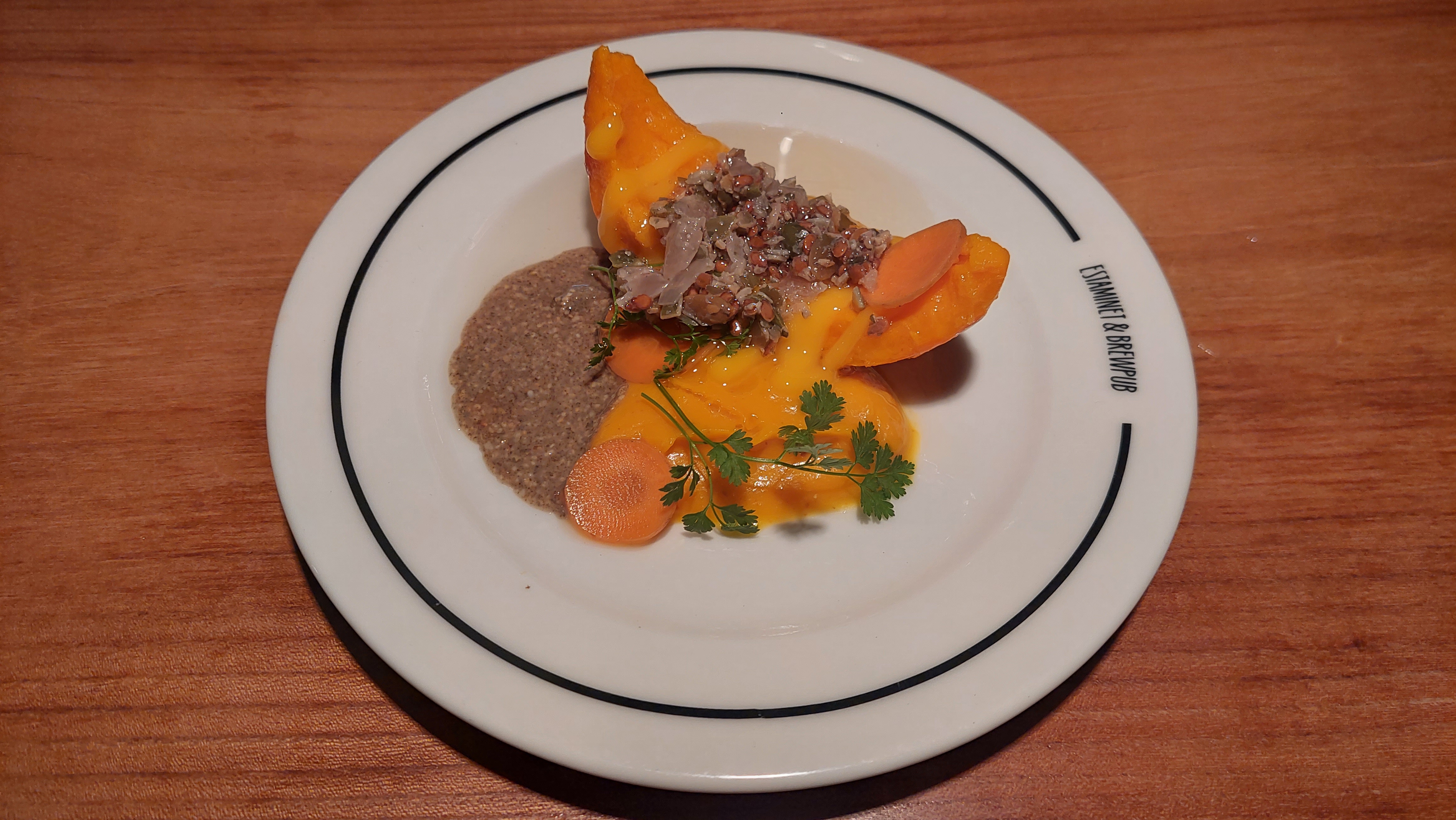 Déjeuner à l’estaminet à l’étage. Menu 3 plats entrée plat dessert et cocktail sans alcool. Une découverte culinaire aussi intéressante qu’agréable !