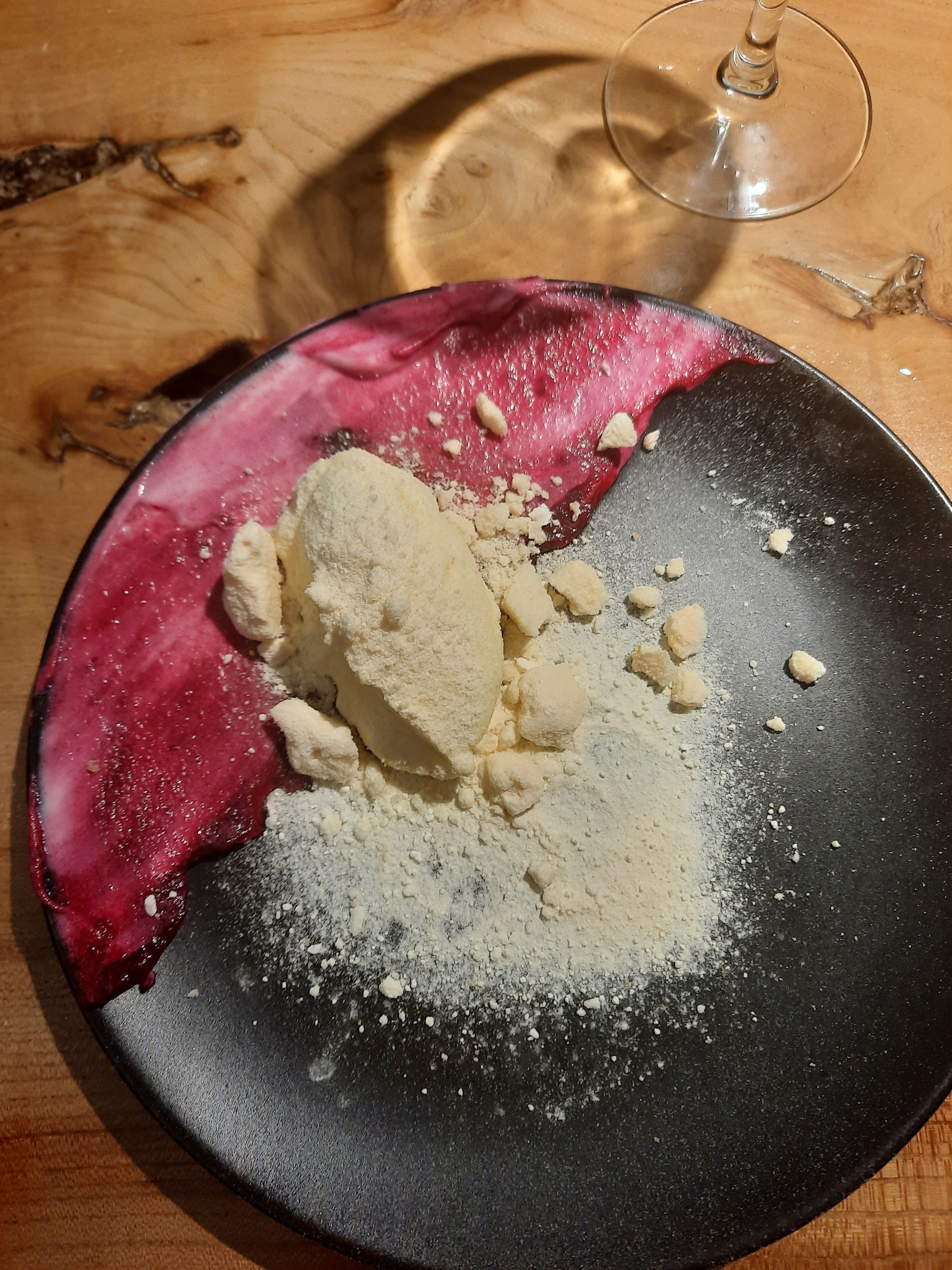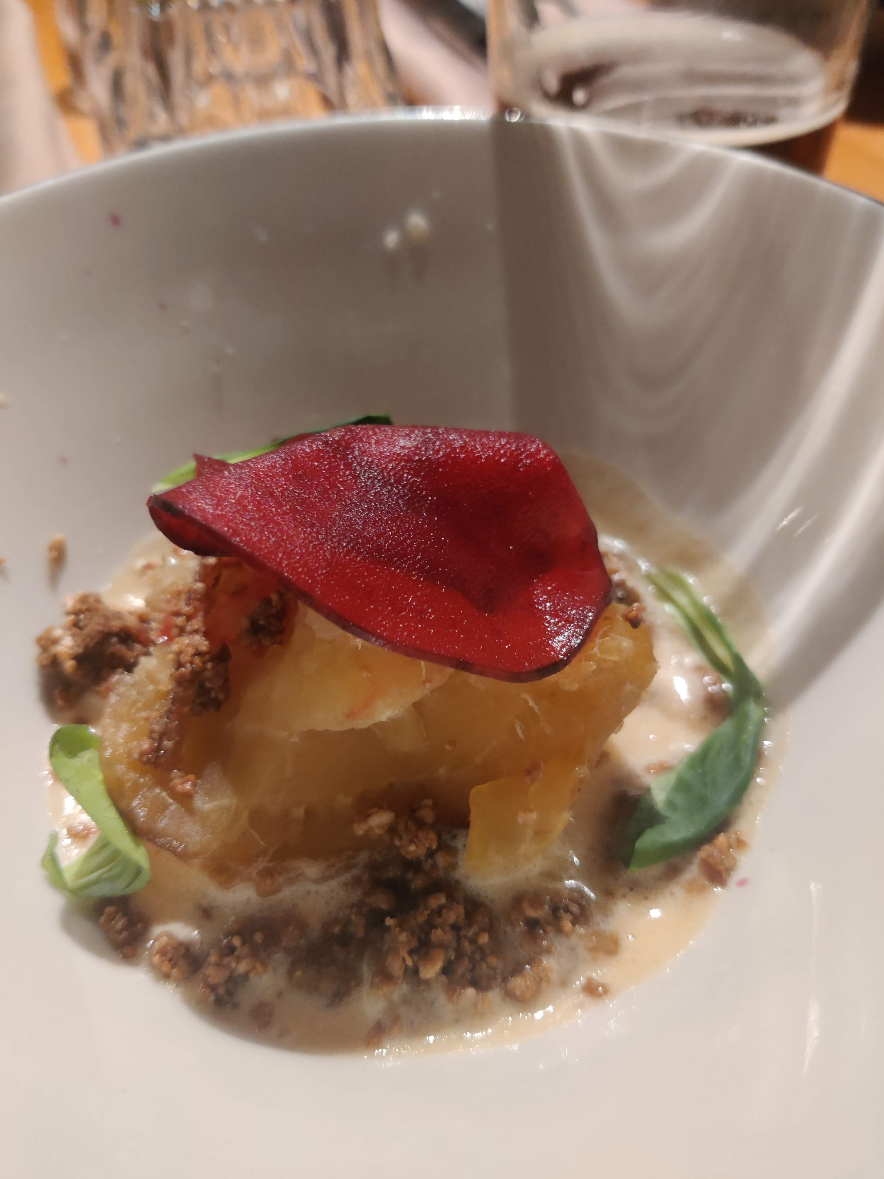 Repas surprise : c'est délicieux !!! Aujourd'hui en entrée: Feuille de choux farcie au chou rouge fermenté avec sauce au chou et branche de cerfeuil frais. En plat : magret de canard grillé au feu de bois avec betteraves et champignons rôtis sauce aux mûres . En dessert : mousse pomme/sureau, sorbet poire et meringue à la mangue... Bière aux piment / poivron et au lieu du café : chicorée ! Je vous recommande ce restaurant ++++ fabuleux !