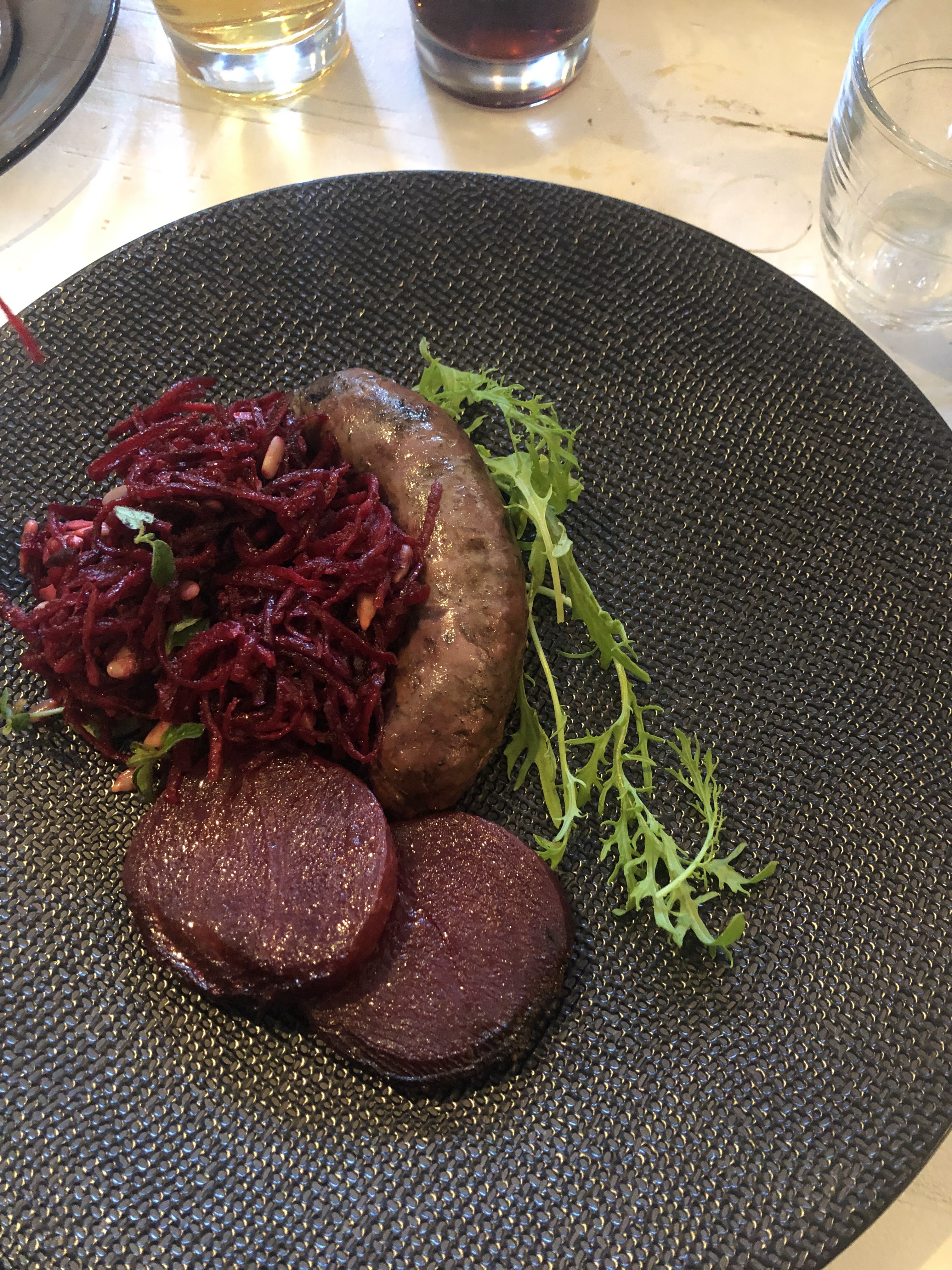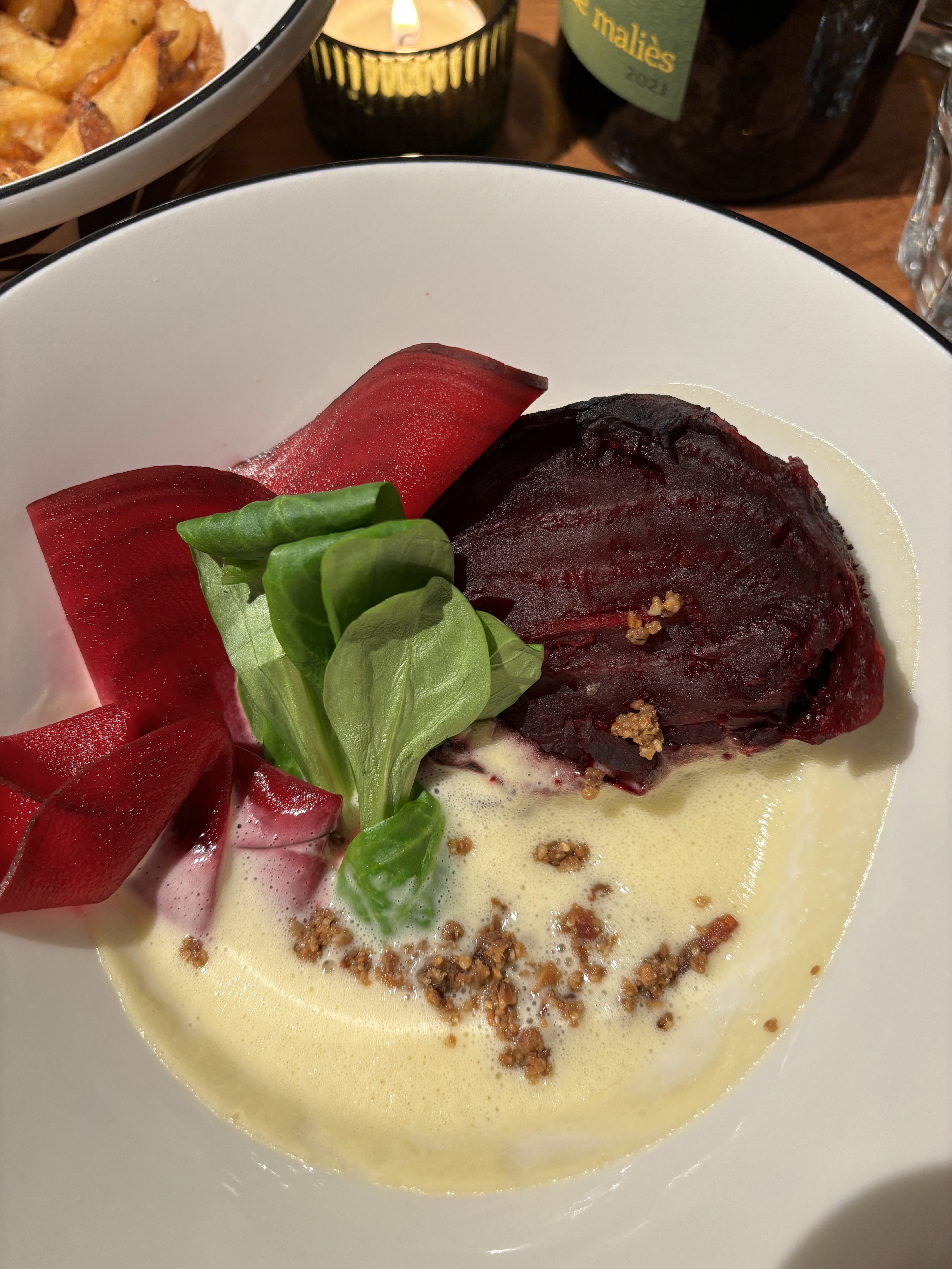 Nous avons dîné côté restaurant. Très beau lieu et service impeccable, mais déception pour ce qui est de l'assiette. L’entrée à base de chou fleur et canard gravlax était (très) bonne mais en (trop) petite quantité. Le plat, palets de betterave cuits au beurre + salade de betterave crue/graines de tournesol (betterave+betterave...?) et saucisse d’agneau (un peu sec) n’était vraiment pas gourmand. Pas emballée par le dessert gâteau au yaourt, glace au foin et poire. Rien de transcendant mais on donnera sûrement une seconde chance. Bonne continuation à toute l’équipe !