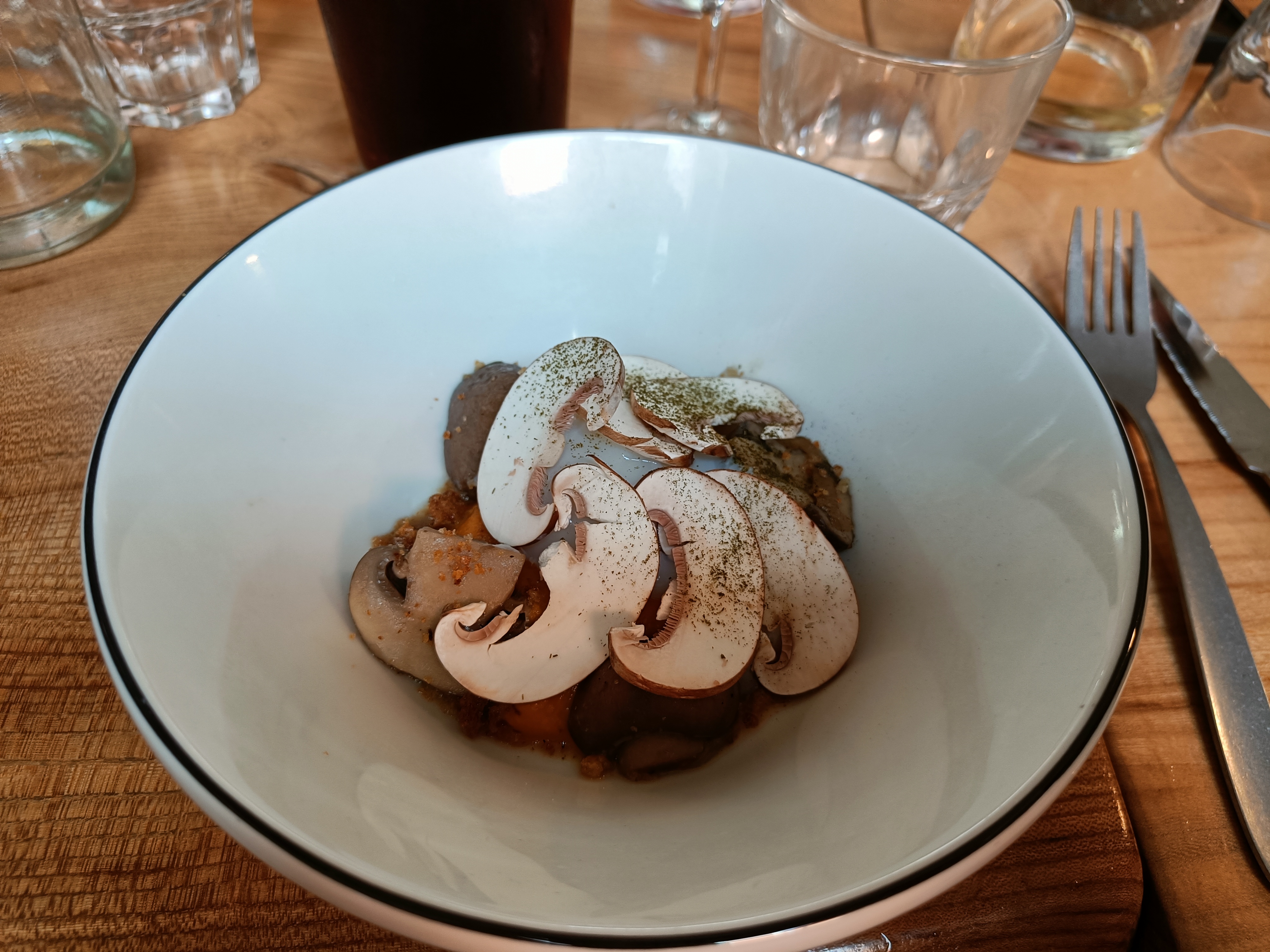 Menu surprise à 25€ : une cuisine à la fois simple et savante. De très beaux produits locaux associés avec goût. Tomates légèrement braisées au feu de bois avec une huile de persil et des graines de sarrasin torréfiées : parfait ! Une araignée de cochon cuite à la perfection : osons la rosée ! Des bières brassées sur place réellement originales et subtiles. Des vins natures. Je crois qu'on ne peut rien demander de plus !