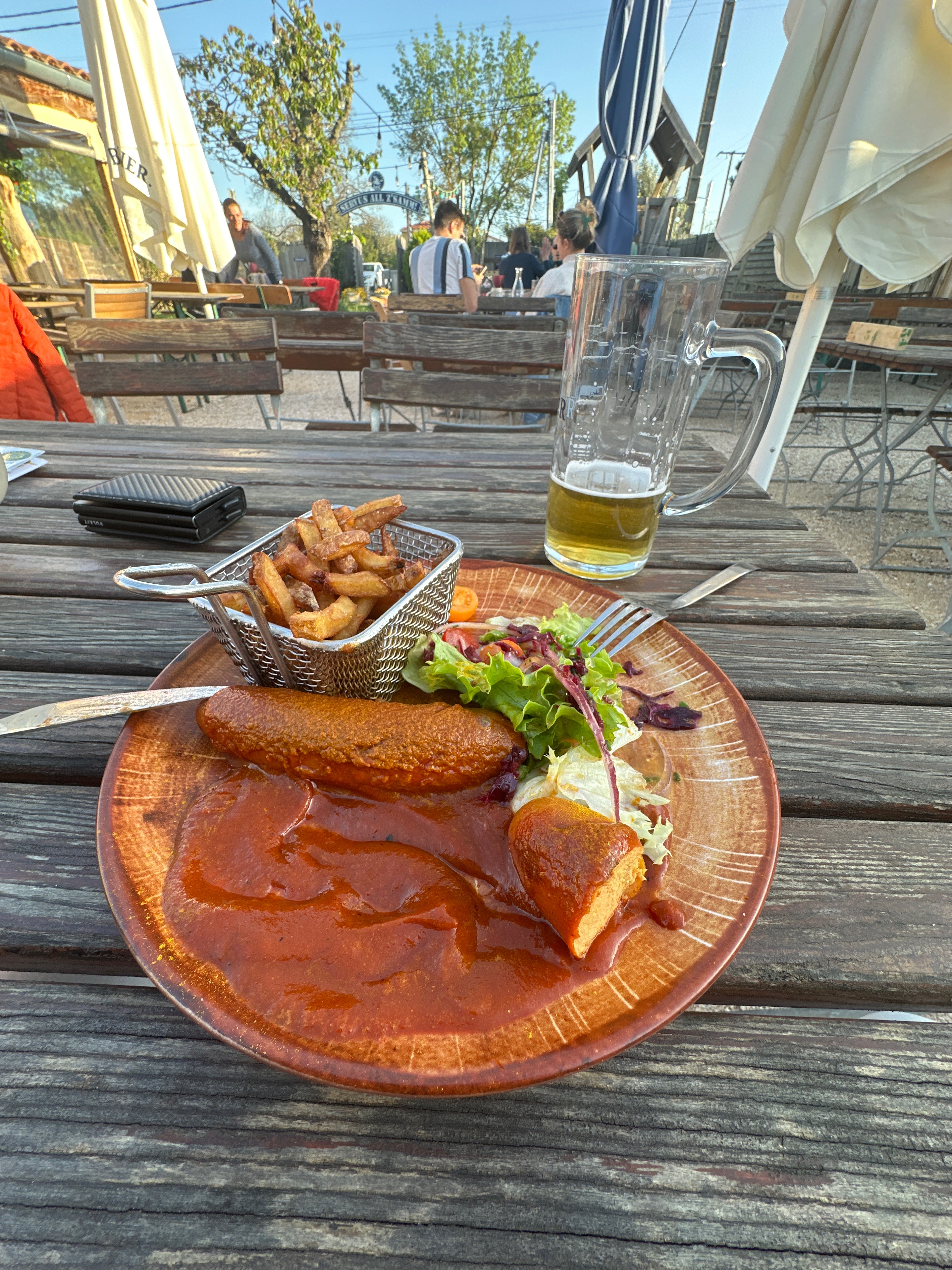 Manger en extérieur est sympa quand il fait beau au menu saucisse allemande et frite.