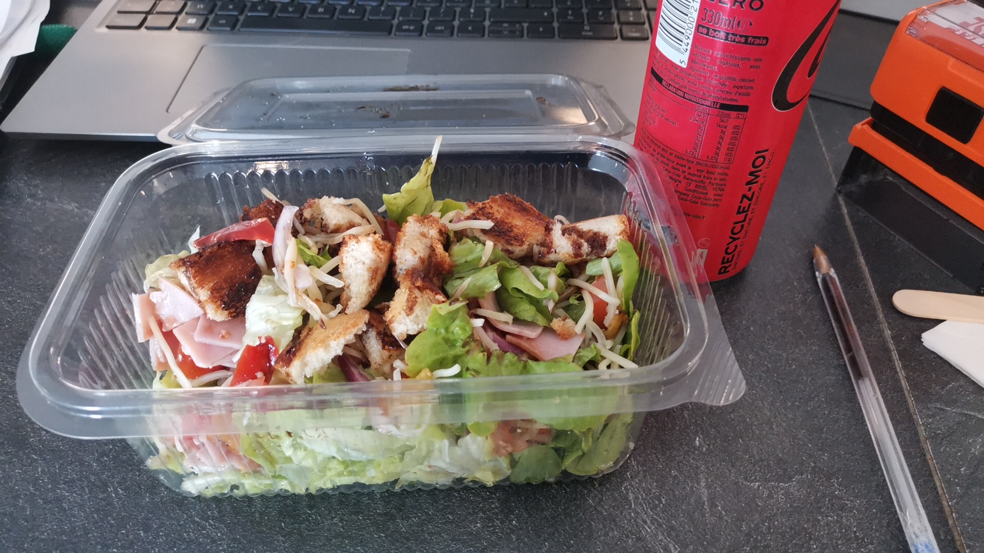 Cher pour une salade à 10,90 avec boisson, salade soit disant copieuse. Salade parisienne quelque morceaux de jambon en tranche découpé en petit carré du gruyère râpé et du pain de mie grillé avec quelque feuille de salade.