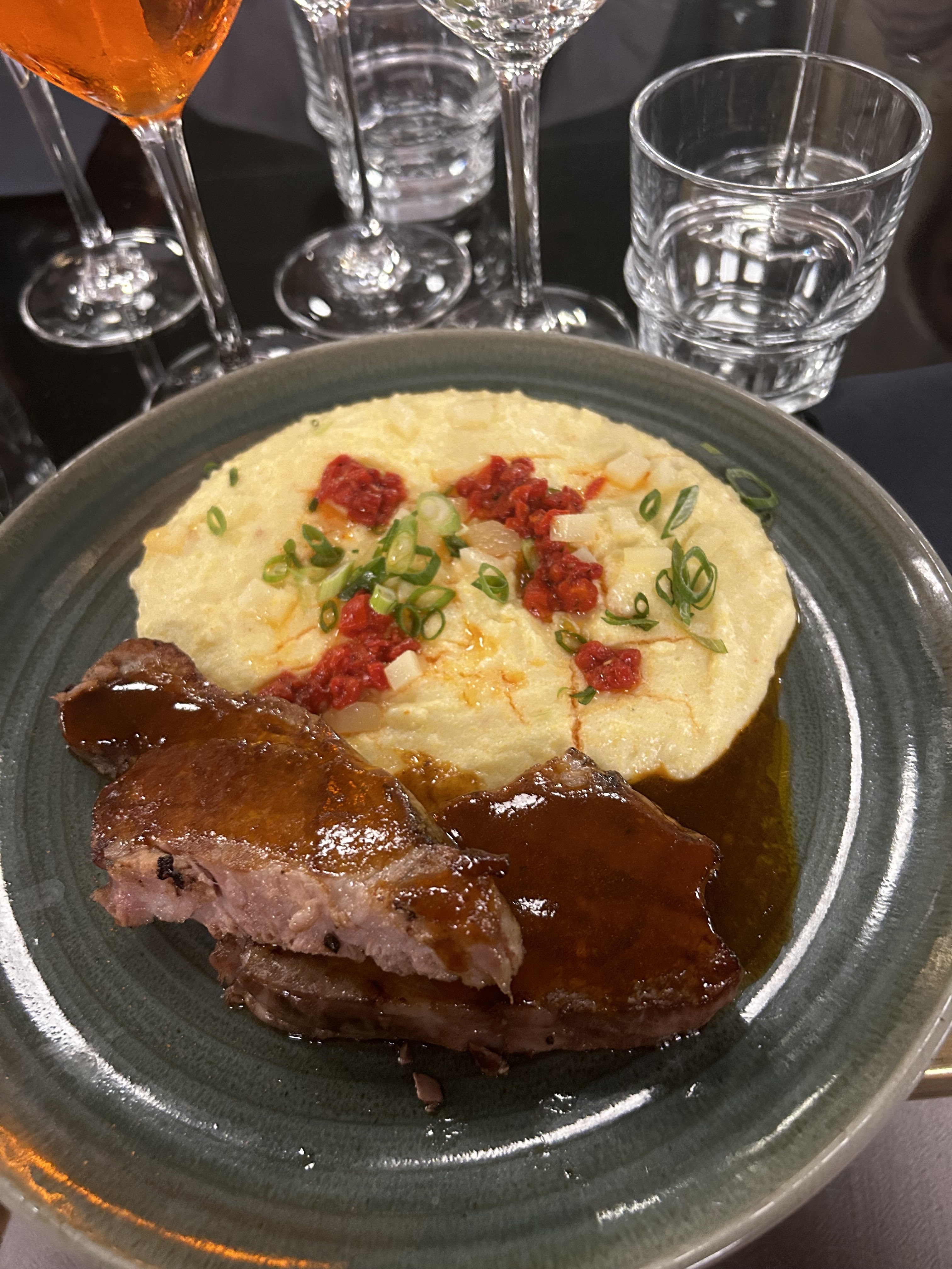 Nous sommes venus dans le cadre d'un déplacement professionnel avec une quinzaine de personnes. Excellente cuisine, j'ai pris de l'échine de porc avec une polenta crémeuse et j'ai adoré. Les desserts sont également très bon mais assez copieux. En seul point négatif je noterai seulement que dans une autre table, des clients ont commandé un plat qui a été flambé devant eux, ce qui a produit pas mal de fumée avec une odeur très désagréable qui a gâché une partie du dîner. Merci malgré tout pour la qualité du service, du cadre et de l'ambiance !