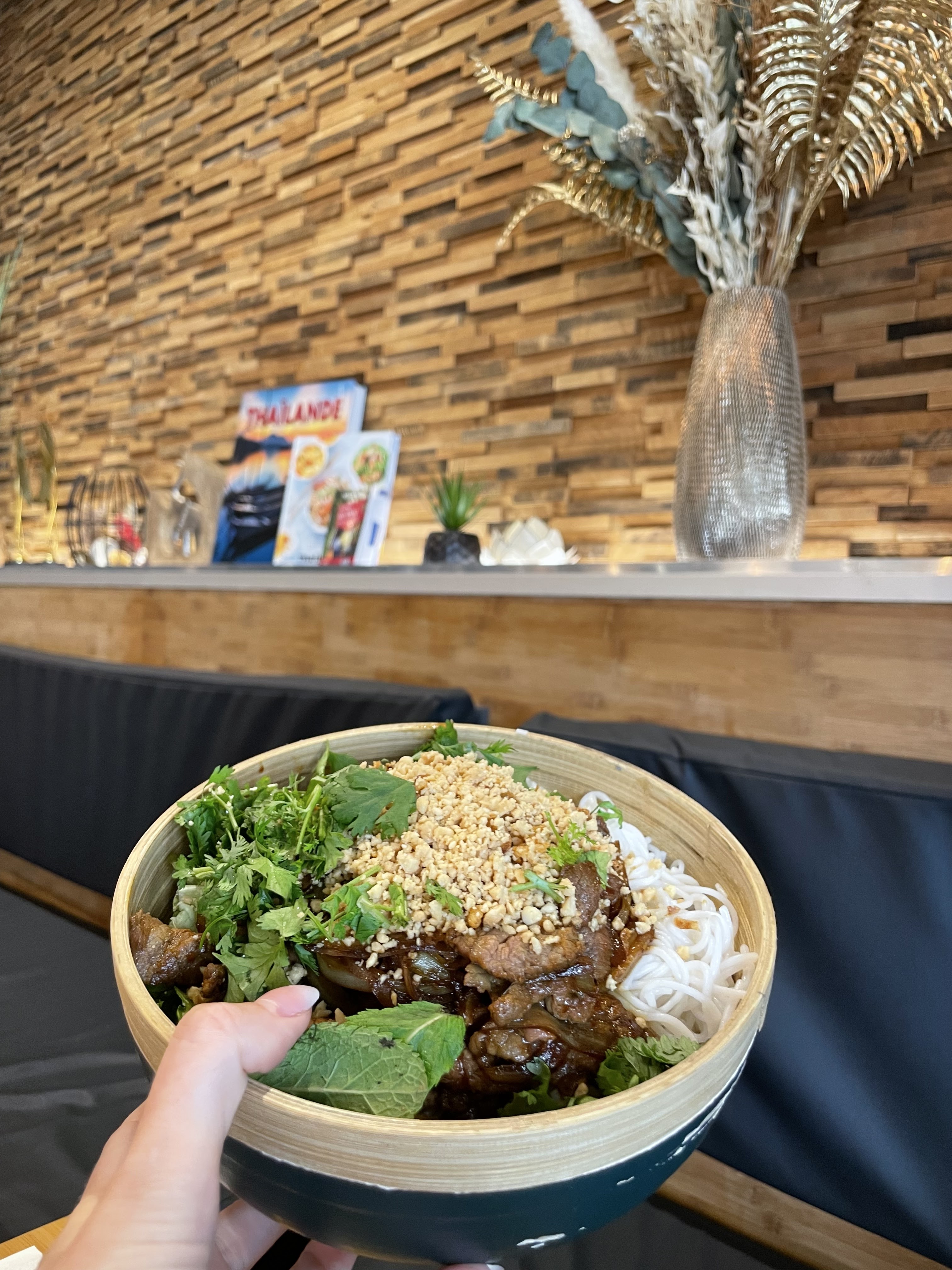 Très bien situé , facile d’accès , avec une belle salle à l’intérieur , joliment décoré ! Très belle accueil ! Plat frais parfaitement bien cuisiner ! Bobun délicieux merci ! Il y a une borne pour prendre les commandes ! Mention spéciale pour la coconuts fraîche en entière ! Un régal ! Super combo avec le Bobun ! Les deux photos celle avec le riz c’est le plat Yam ! Et le Bobun thaï ! Bravo Merci