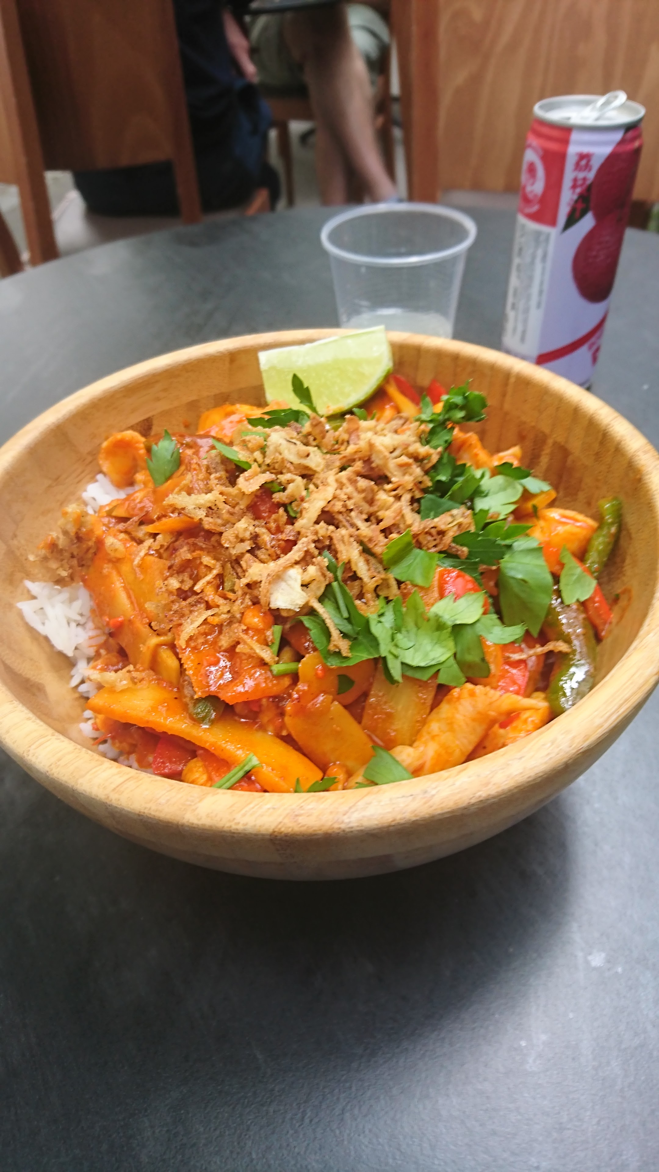 I got a red curry take away. It was too spicy , so much so that I could not taste any other ingredients in the curry. Plus, the curry was poured over rice in a box and by the time I got home (10m) the rice had absorbed all the curry and turned into a mushy melange that looked like porridge. Disappointing. Une expérience décevante. Le curry rouge était trop épicé (on ne pouvait même pas sentir les autres ingrédients du curry), et c’était mélangé avec du riz dans une petite boîte à emporter. La mélange est devenu un porridge après seulement 10m. Un porridge!