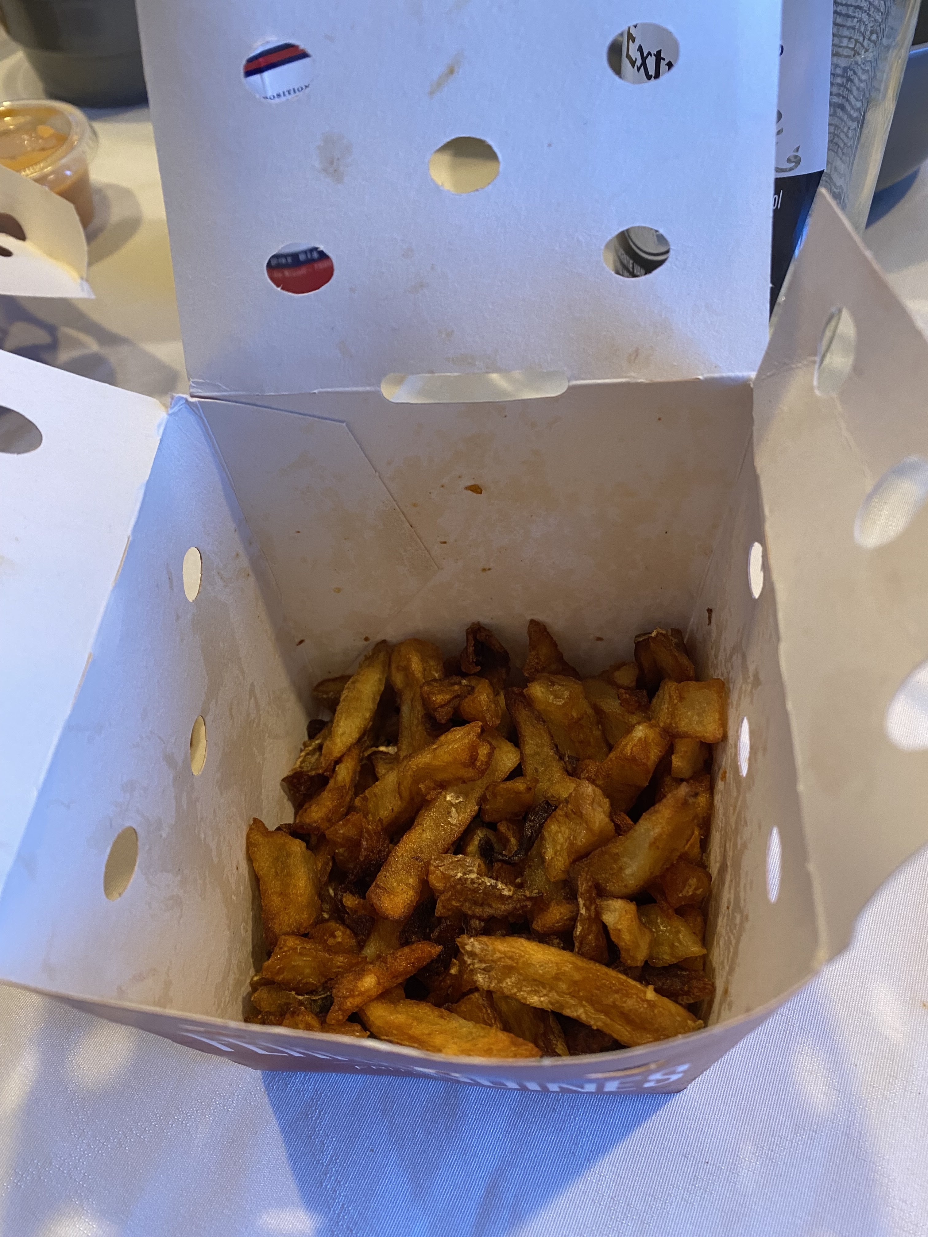 Commande passée sur l’application Uber eat comme déjà fait plusieurs fois auparavant. Toujours contente de ma commande malgré le prix élevé mais cette fois-ci j’ai vraiment été extrêmement dessus. Le burger ça allait mais j’ai reçu des frites « normales » même pas salées et très très mauvaises, et non des fernandines. Le dessert est maintenant servit dans un petit gobelet en carton avec une quantité très faible … alors 5e le dessert pour cette quantité, je dis non ! Très déçue, je ne sais pas si je recommanderai.