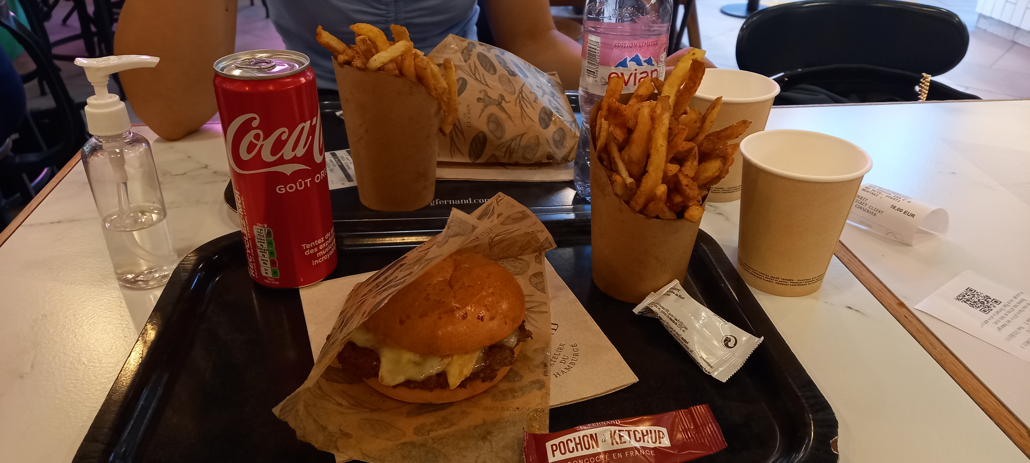 Nous sommes arrivé à 20h15 … du monde en cuisine mais nous snob commande prise 15 min après , en boisson plus d’eau minéral, cuisine ouverte sur du personnel qui travail avec des bijoux moyen … on s’installe et la table sale, sol collant … nous avons pris le produit et nous avons nettoyé nous même la table … la table assise à côté de nous avait commandé la même chose mais n avait pas les mêmes ingrédients,,, C’est dommage car les autres big Fernand etait bien mieux !!!
