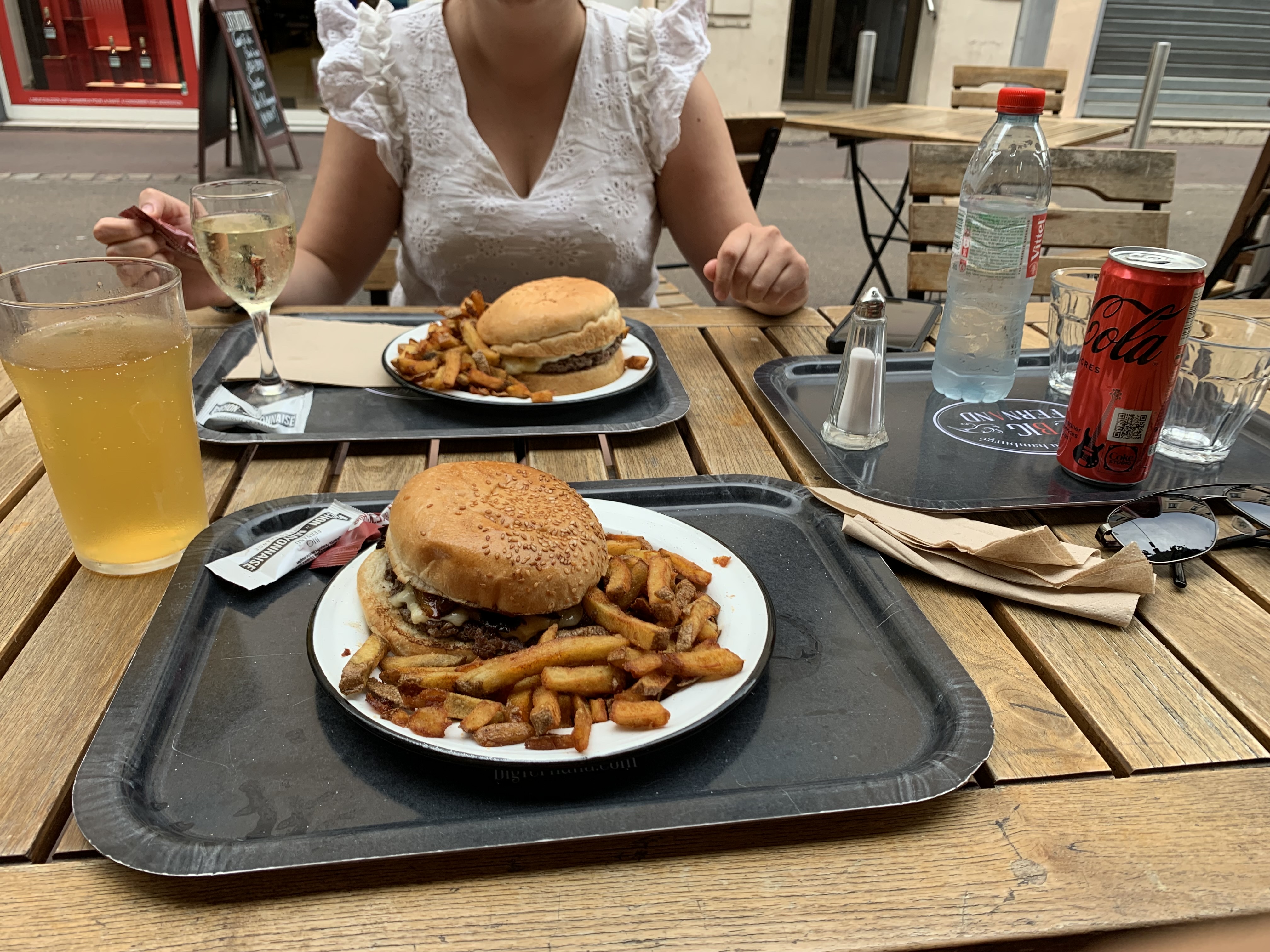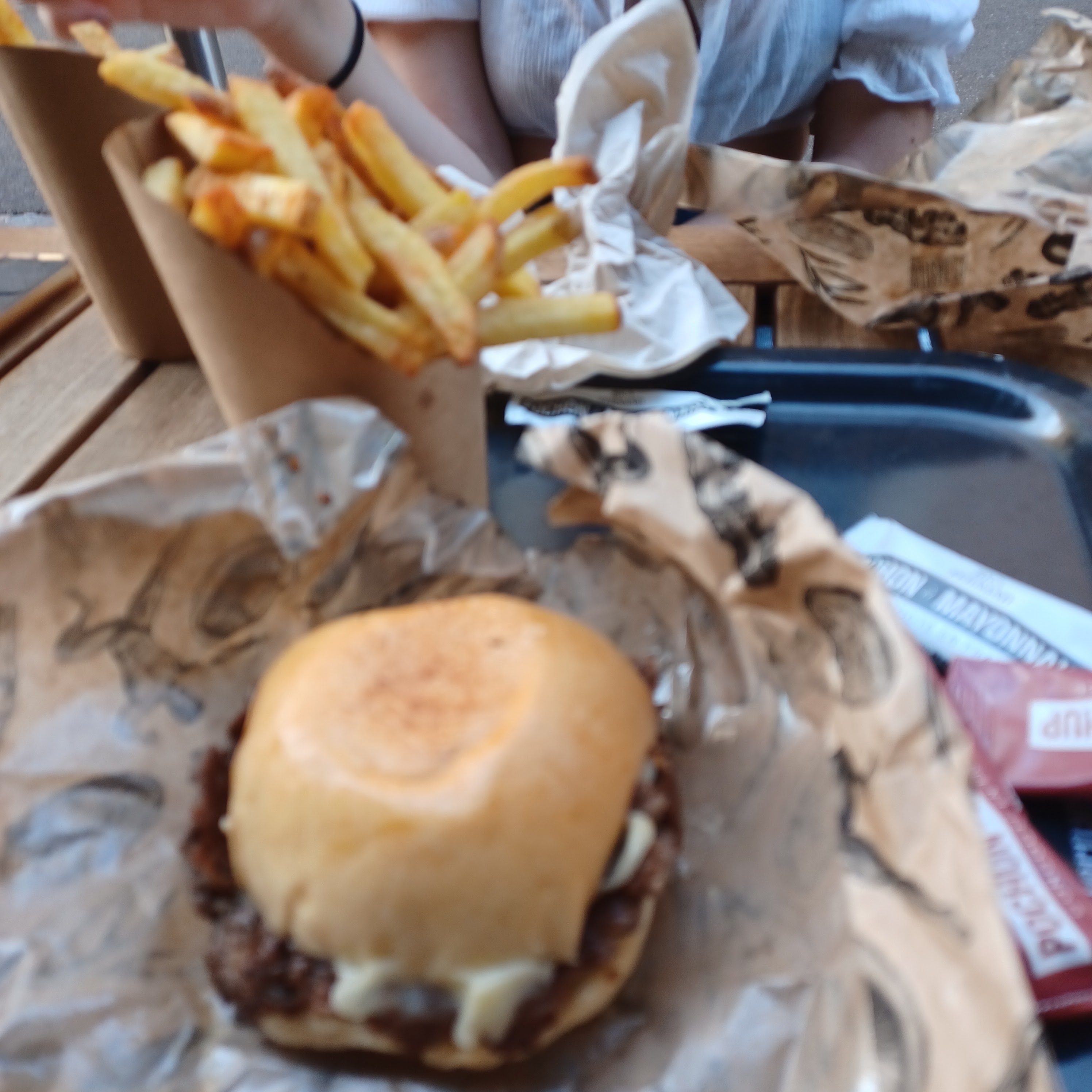 Serveuse extérieure vraiment désagréable, heureusement que ceux au comptoir était très gentil et souriant sinon nous serions parti ! J'ai rarement vu une serveuse aussi désagréable, elle a fait tout son service en tirant la gueule et en parlant mal aux gens, elle est même venu balayé sous nos pieds pendant qu'on mangeait. Sinon leurs burgers sont très bon et la mayo maison est excellente.