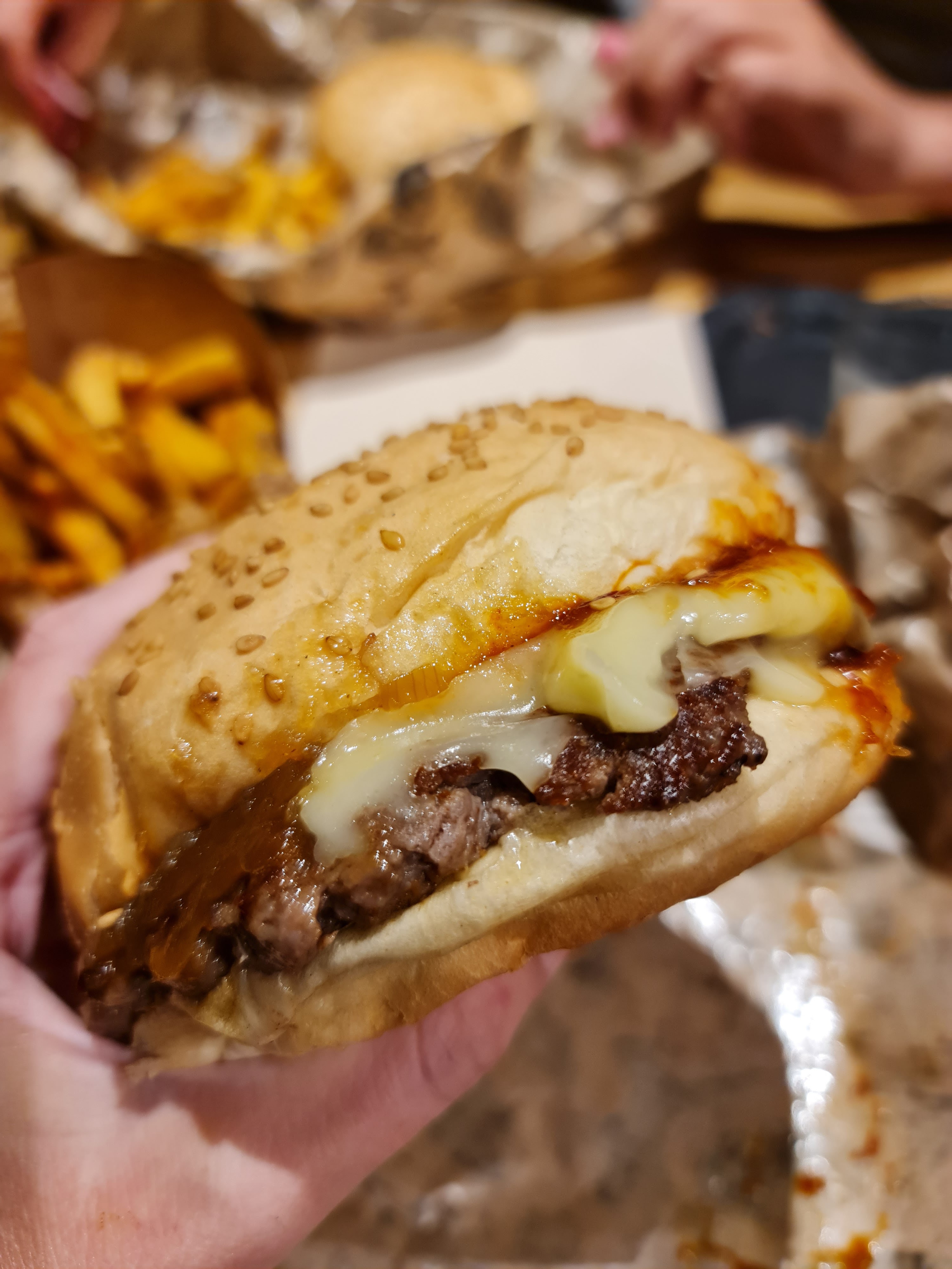 2 grandes menues mais le contenu est minable escalope de poulet très fine quelques ognons confits avec une sauce et fromage trop chauffés granulés pas agréable de tout. un smash, ( heureusement qu’il était offert) un burger pourrie de chez pourrie. Des frites blanchis mais pas replongés donc résultats moles et pas croustillants. Notre facture était de 50€ + franchement j’ai c’était du gâchis. Dommage