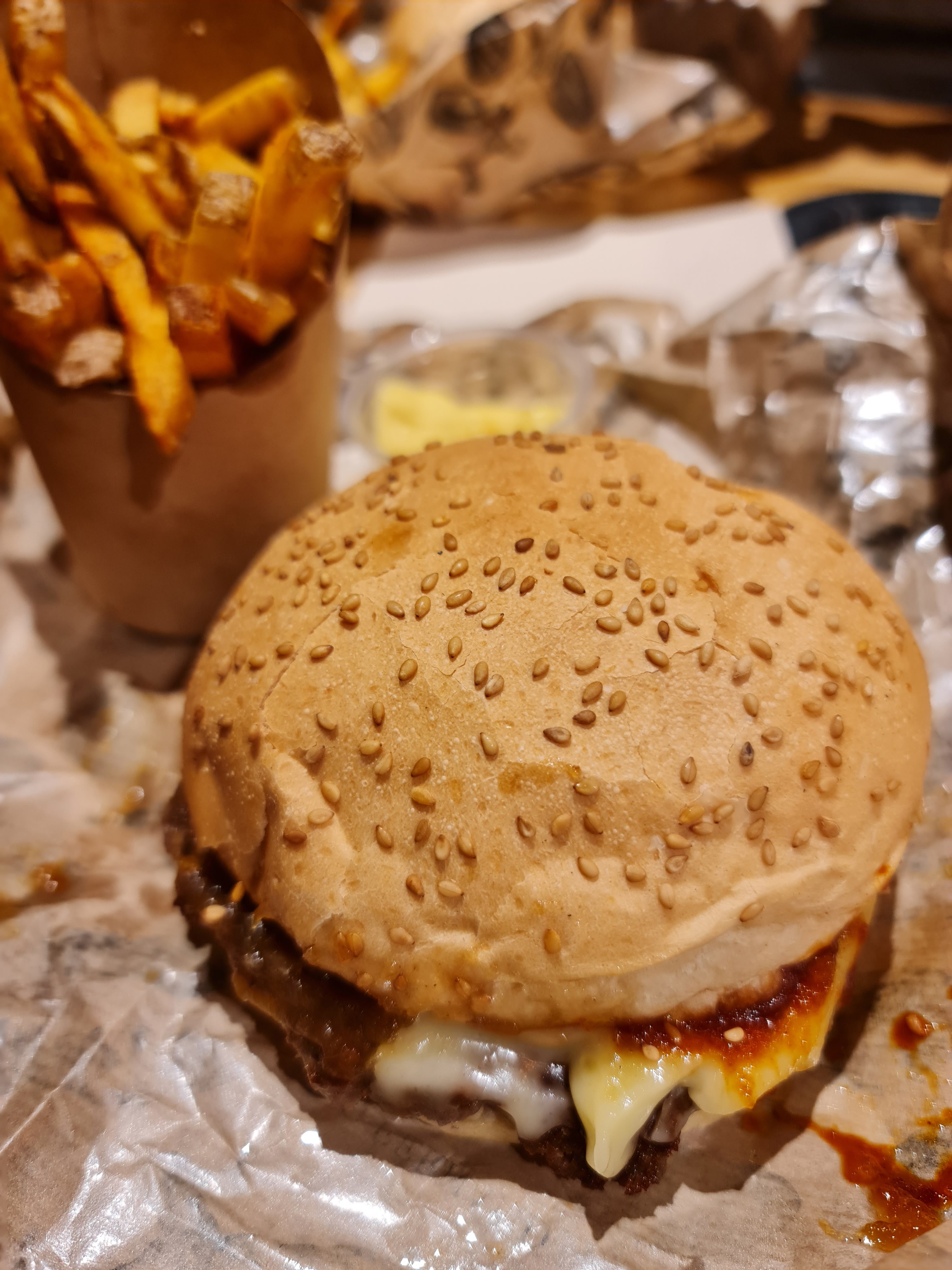 L’endroit est très agréable et fait assez vintage, tout ce qu’on aime chez un burger. Cependant, l’espace est assez petit, mais ça n’empêche pas de passer un bon moment en famille ou entre amis. Pour ma part, je voulais un burger végétarien, avec un steak végétal, mais j’ai trouvé ça assez dommage qu’il n’en mette pas et qu’il remplace cela par du fromage et quelques légumes… Pour être franchement honnête, les frites n’étaient pas excellentes, loin de là, mais disons qu’elles sont mangeable. Malgré cela, je recommande si l’on doit prendre un repas à emporter vite fait bien fait !!!🍔