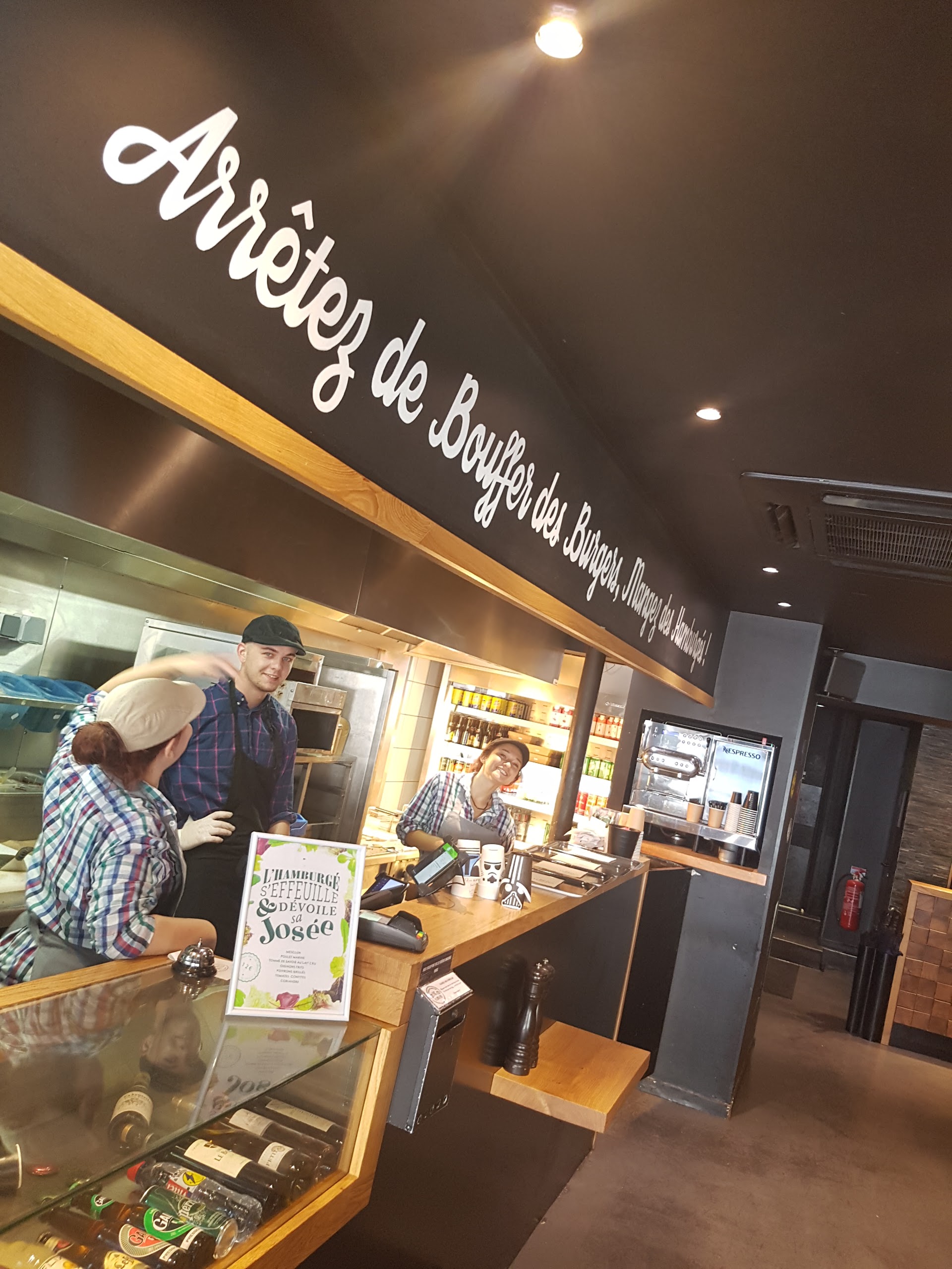 Excellent accueil des serveurs-cuisiniers, qui sont vraiment sympas. J’ai particulièrement aimé le fait que les « hamburgés » soient cuisinés devant mes yeux. En plus de cela ils excellents et généreux. Les frites sont les meilleures que je n’ai jamais mangé dans une chaîne de fast-food. Je vous conseille d’aller à l’étage où vous pourrez manger dans un canapé, ce qui renforce le côté convivial du restaurant.