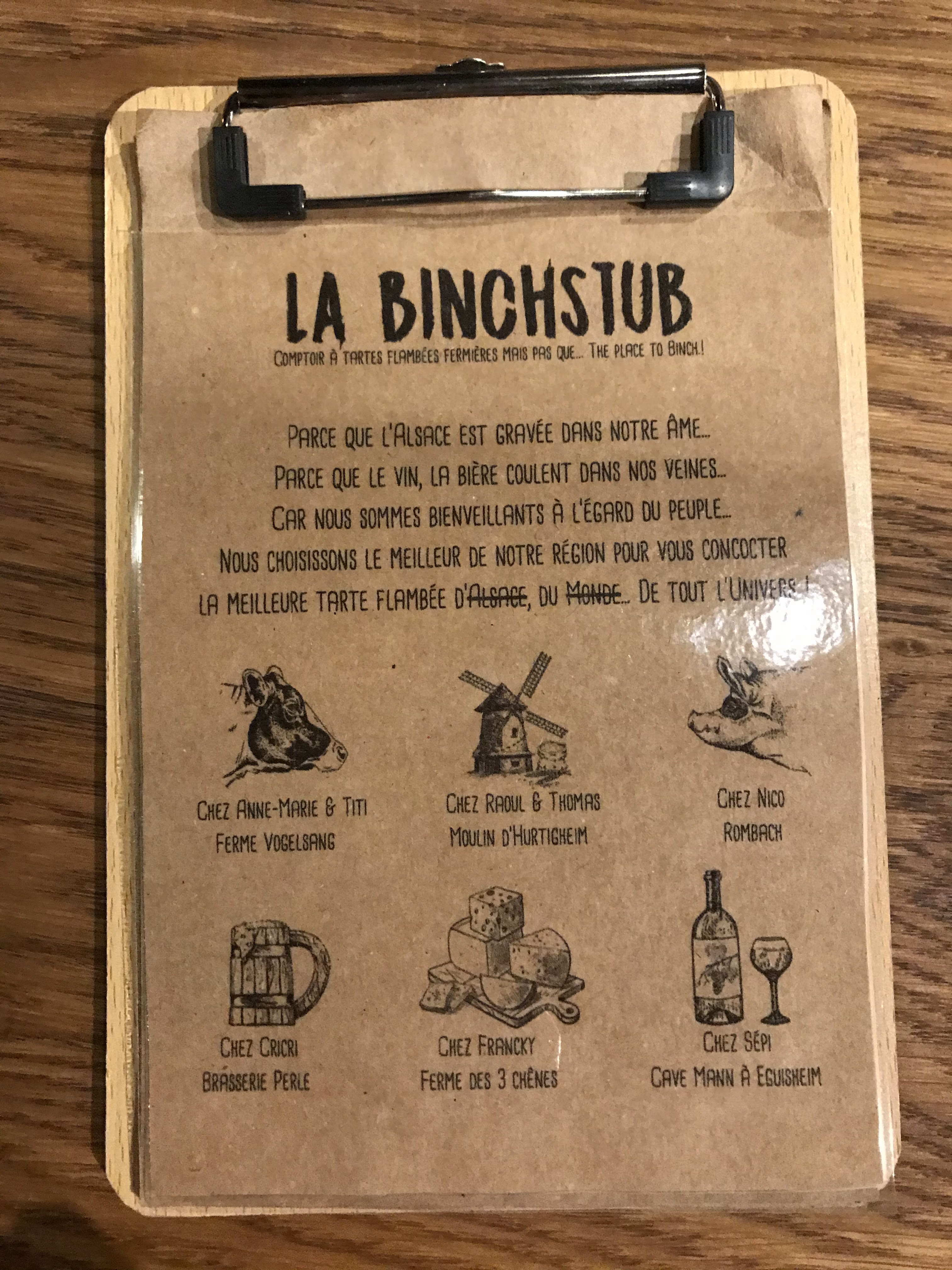 Située à côté de la Place Broglie au centre-ville de Strasbourg, la Binchstub propose en spécialité des tartes flambées (Flammekueche) à une tablée traditionnelle (Stammtisch) le tout accompagné d’une bière alsacienne ou d’un verre de vin. Une ambiance garantie et un service sympathique font le succès de cet établissement au cadre chaleureux pour lequel il faut réserver à l’avance, ou alors prendre à emporter... Mille mercis et bonnes fêtes de fin d’année à Régis et toute son équipe !
