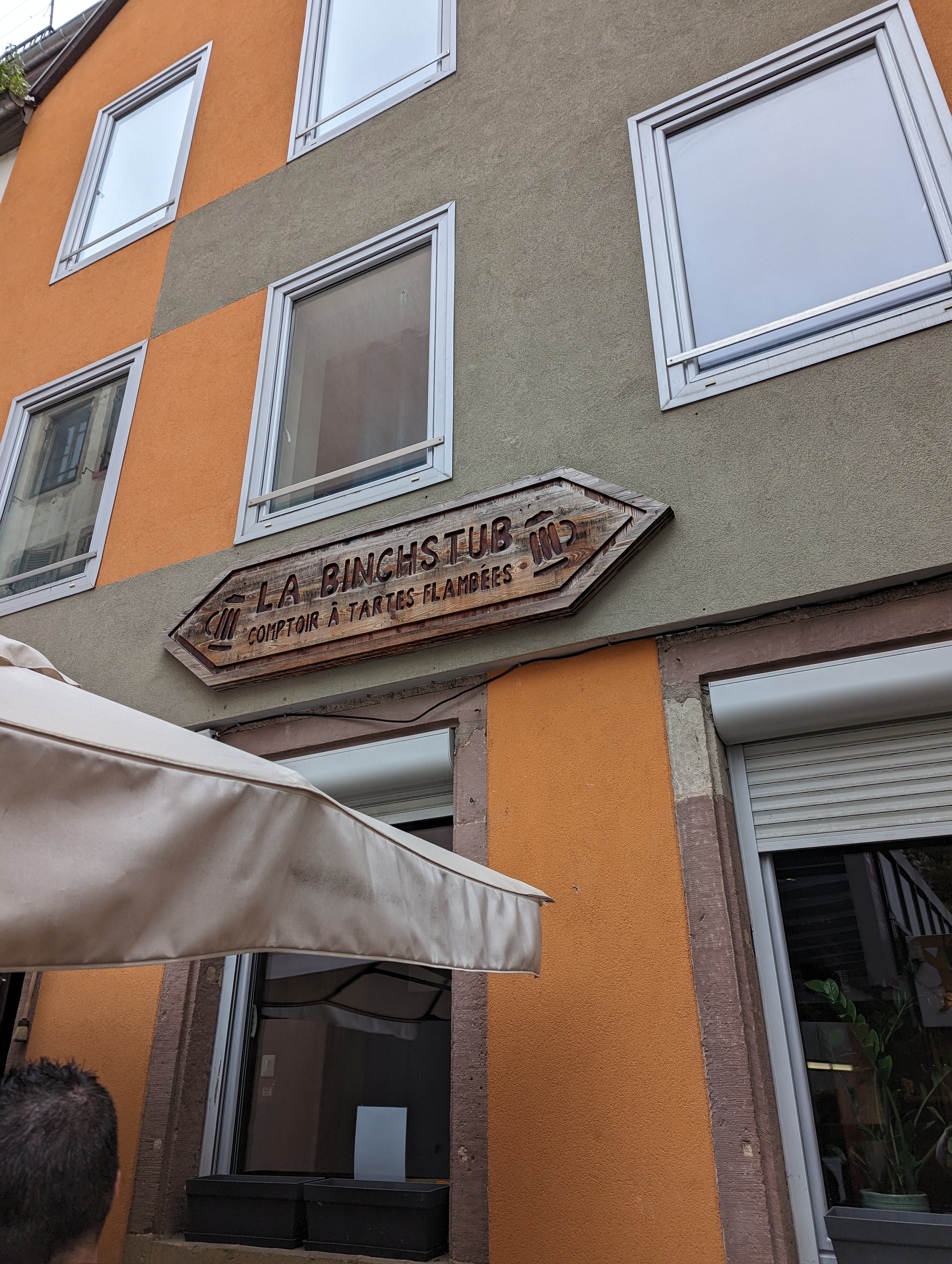 Retour à la Binchstub que je connais depuis 2018 pour déjeuner. La localisation à l’écart de la cohue dans une impasse est un des atouts de ce restaurant. La carte a changé, feu ma tarte flambée préférée aux orties, mais la tarte flambée du moment (avec abricots et romarin) que j’ai choisie était bien garnie, la pâte croustillante et les ingrédients de qualité. La tarte en dessert -une classique pomme cannelle flambée au Calvados- était également très bonne. Pour moi c’est une bonne adresse pour sortir des sentiers battus de la tarte flambée par rapport à d’autres établissements strasbourgeois. Service convivial et correct mais perfectible.
