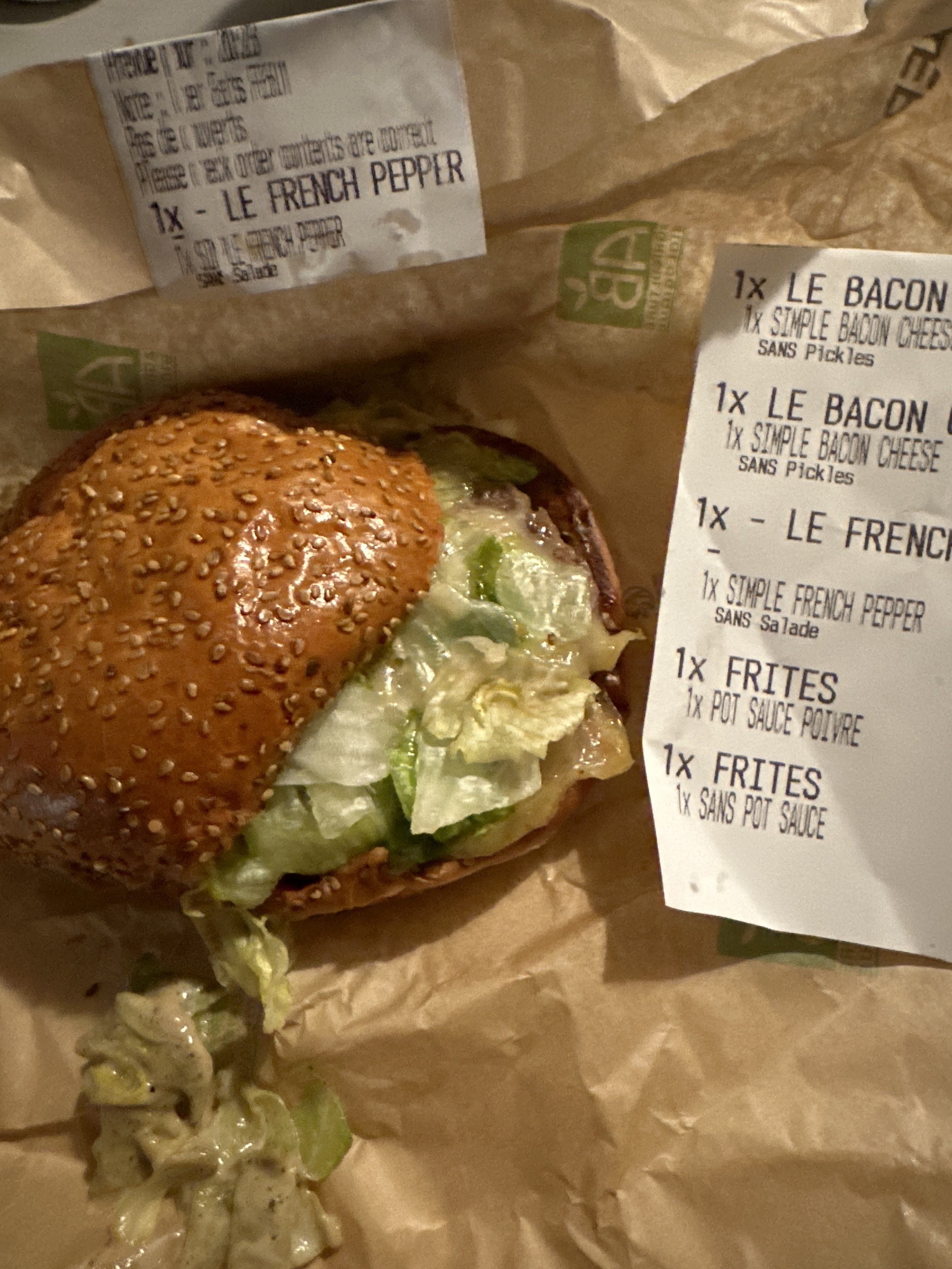 Burger poivre gouda commendé sur uber (1 acheté 1 offert), surpris par sa petite taille! Un peu trop salé! Mais on reconnaît des produits frais et de bonne qualité ! C'est bien quand c'est bio et frais mais c'est meilleur quand on est rassasié!