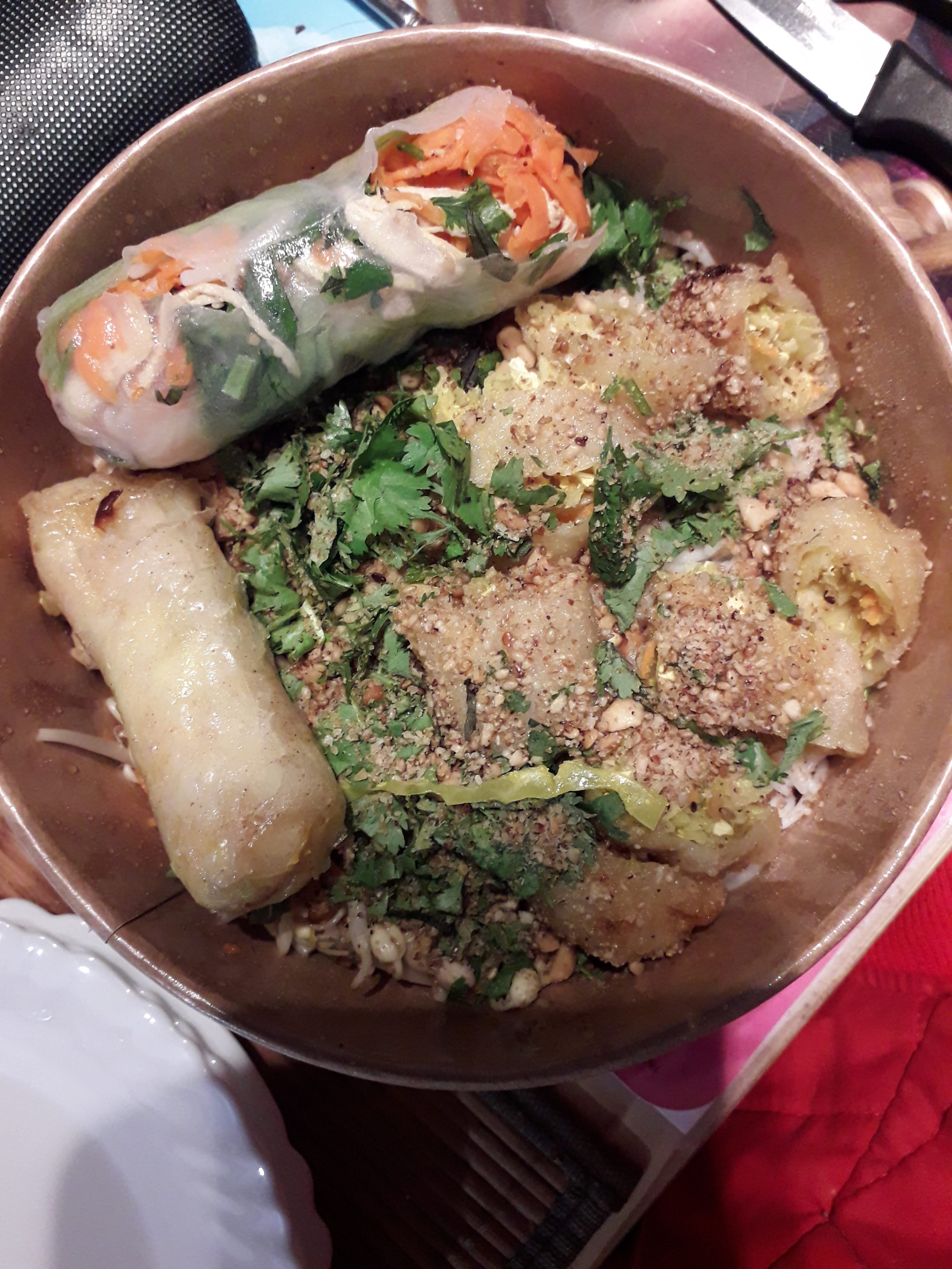 Excellent bo bun végétarien avec tofu et nems aux légumes.