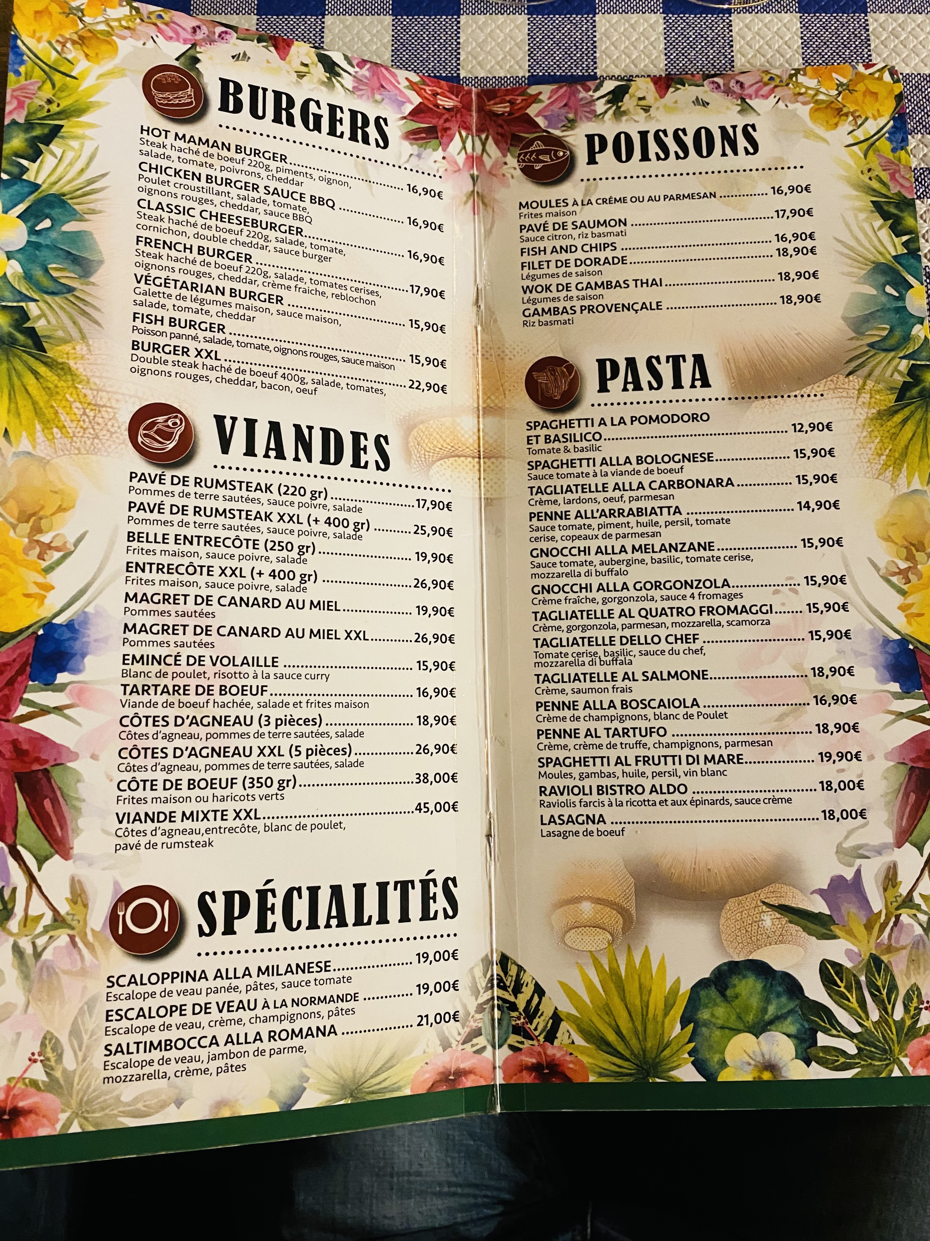 Beaucoup de plat variés (viande , poissons, pizza et pâtes ,.on dirai la carte des restaurants qui passe dans cauchemars en cuisine.) . Prix un peu cher (en moyenne 16e le plat, et 4.8e le coca).