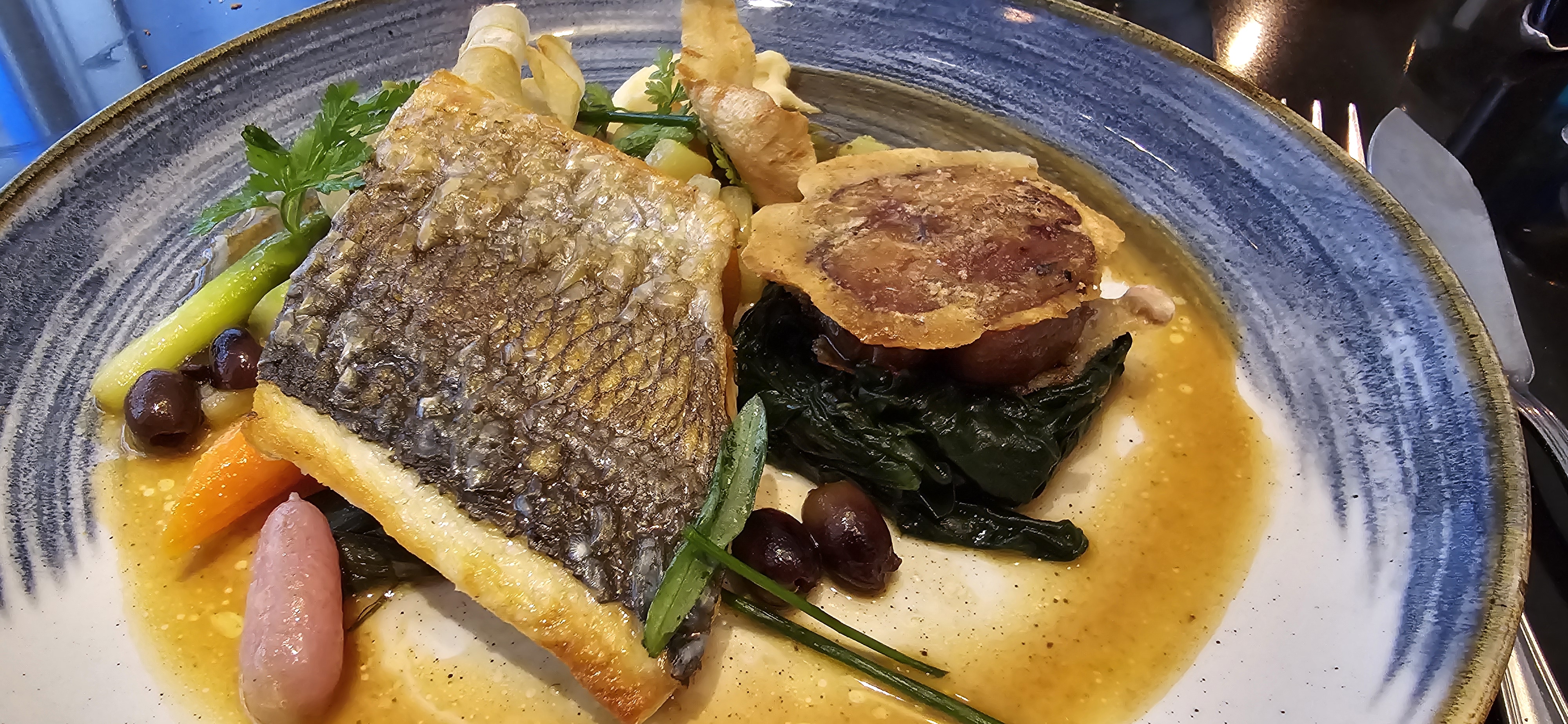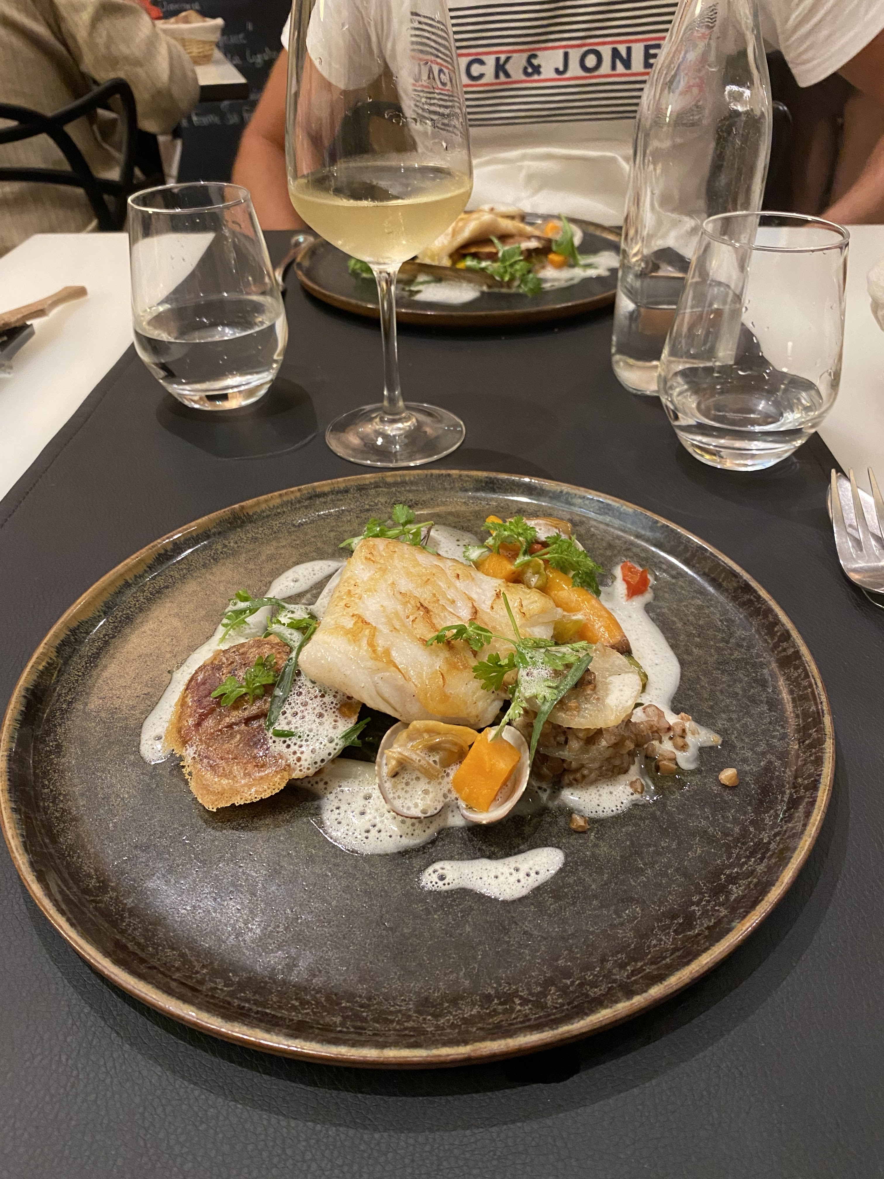 Lotte beaucoup trop cuite et accompagnements rares et sans saveurs. Heureusement que nous avions du beurre pour nous remplir l’estomac ! A noter les commentaires désagréables d’une serveuse lorsque nous avons remonté le problème de cuisson.