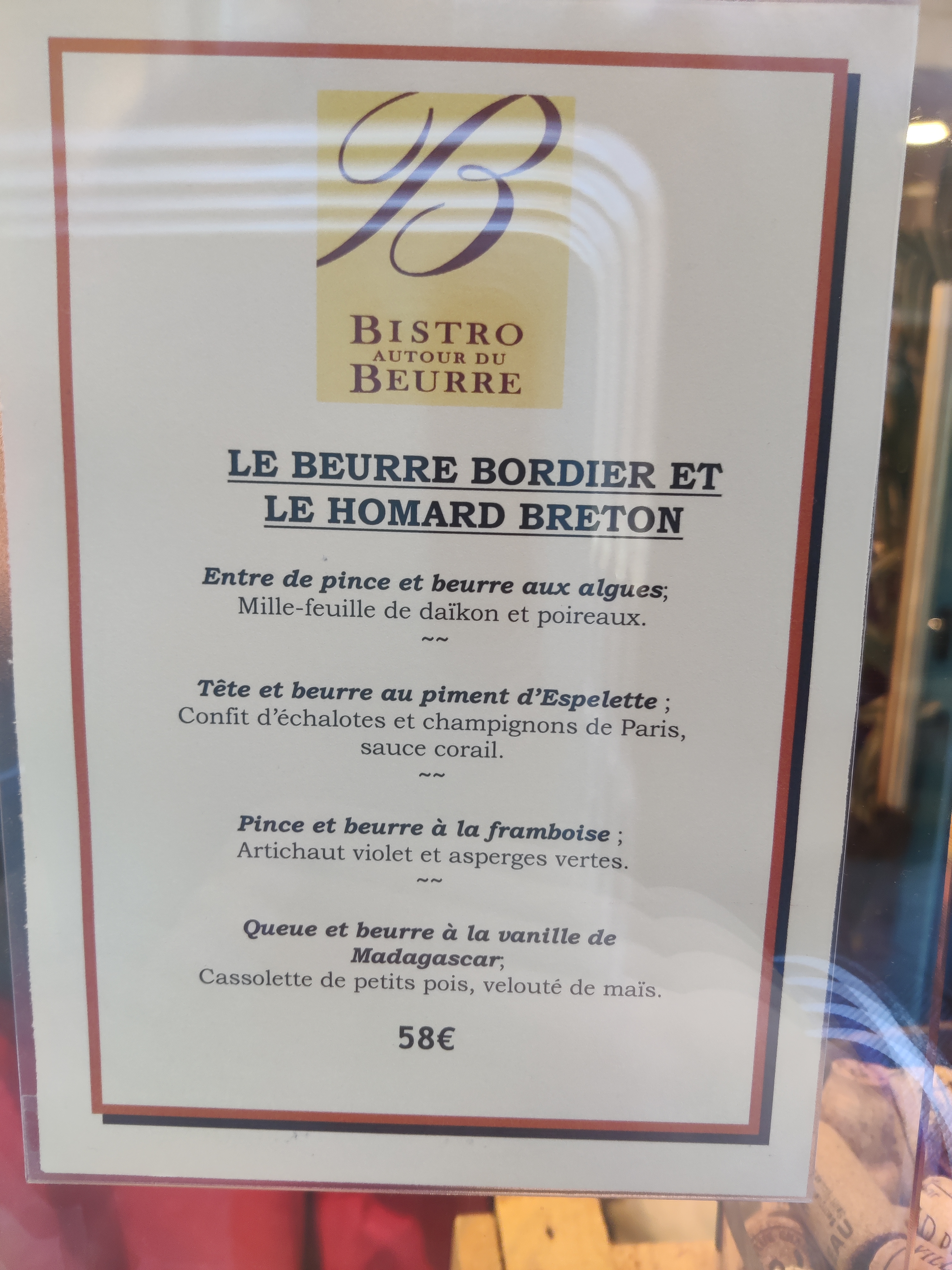 Nous avons choisi le menu du jour à 28 euros servi le midi du lundi au vendredi. Des saveurs extraordinaires pour nous papilles, un régal pour les yeux et un service de très haute qualité. Je ne peux que vous conseiller très fortement cet établissement. Une dégustation de leur fabrication de différents beurres vous est proposée avec des goûts originaux et bons. Réservation obligatoire si vous voulez profiter de leur cuisine de qualité. Bravo.
