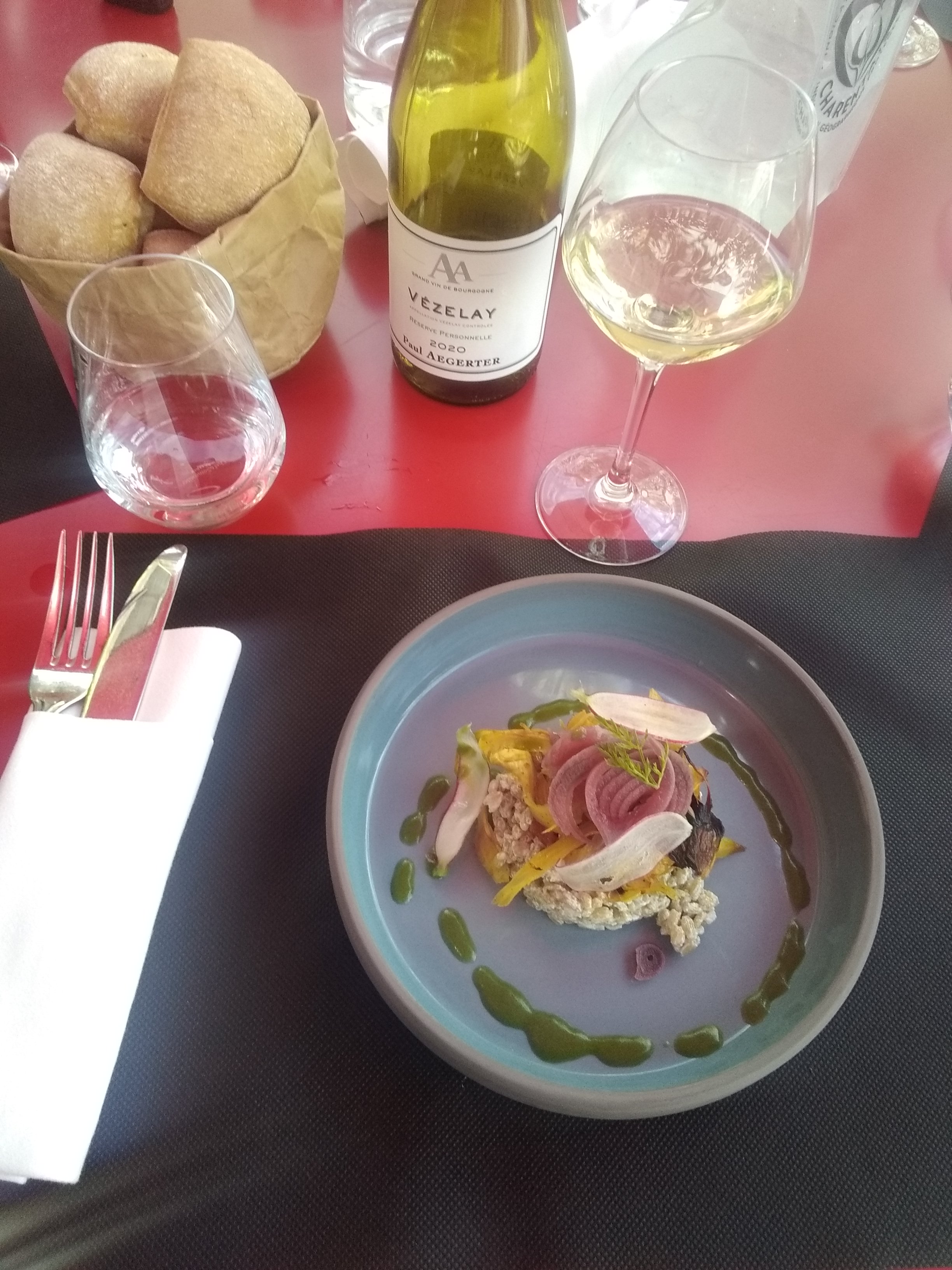 LE RESTAURANT : Nourriture : délicieuse. La carte est variée, originale, et pourtant chaque plat est maîtrisé. L'équipe en cuisine fait du super travail. Les plats sont bien présentés. À part pour la quantité (pour certains plats), j'estime que le prix vaut bien cette qualité. Service : assez bien. J'avais réservé, j'attendais à l'entrée, un serveur m'est passé devant plusieurs fois sans même me dire bonjour. Certes, ils étaient tous occupés, mais un bonjour ça se fait en passant. J'ai attendu un moment en croisant le regard de plusieurs membres de l'équipe avant que l'un m'apercevoir et vienne pour m'accueillir. D'ailleurs, celui-ci était vraiment attentif avec les clients, agréable et de bon conseil pour le vin.