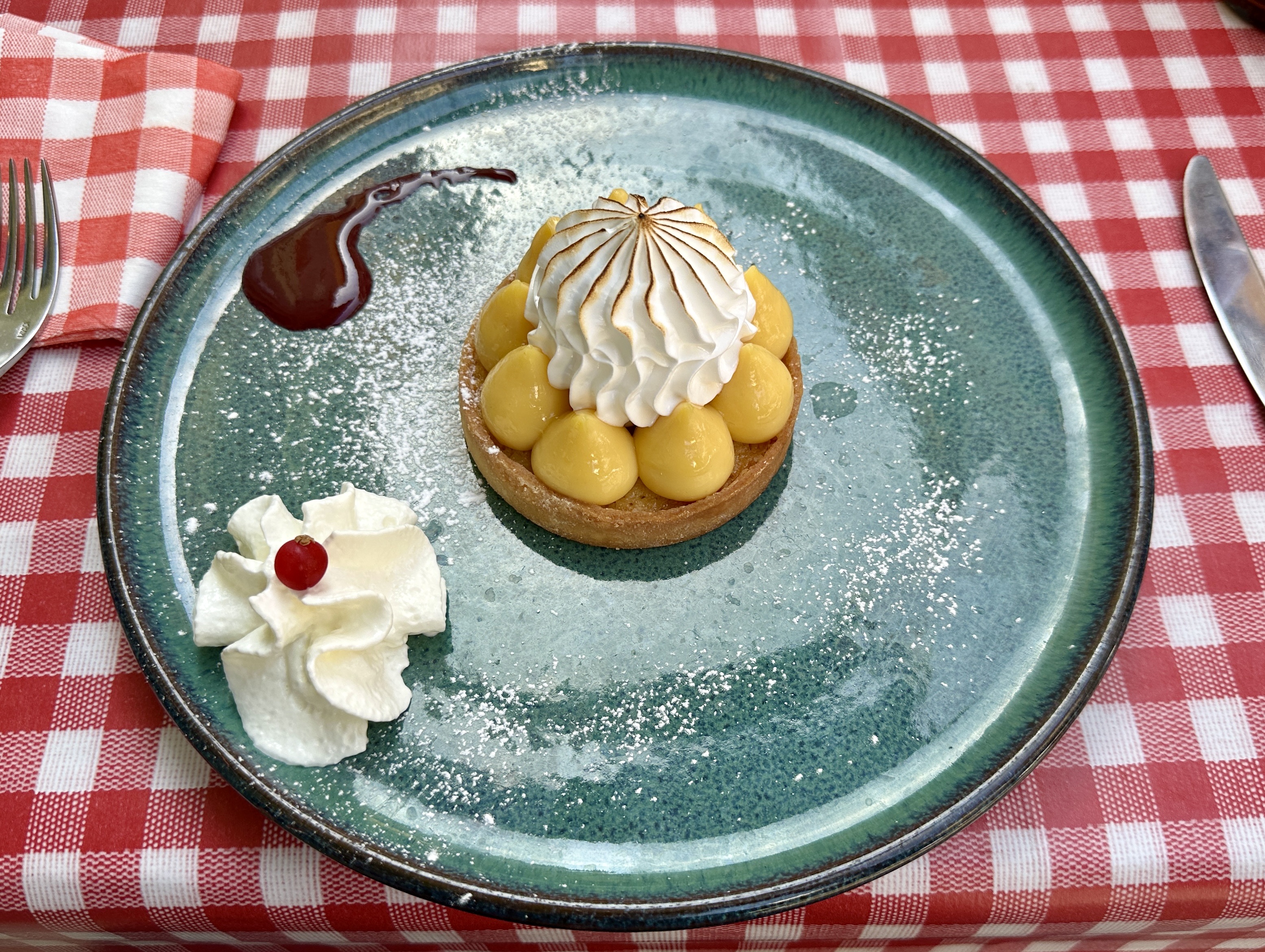 Nous avons déjeuné en terrasse lors d'une journée agréable et ensoleillée qui s'est rapidement transformée en une averse avec une petite rivière coulant devant notre table et des grêlons partout ! Le personnel était super et nous a fait emménager rapidement à l'intérieur. La nourriture était très bonne. Nous avons eu leur aimant de canard et l'aïoli provençal (poisson blanc et légumes vapeur avec, bien sûr, un accompagnement d'aïoli). Oh oui, il y avait aussi un dessert délicieux et léger composé de mousse passion. 😋Merci !