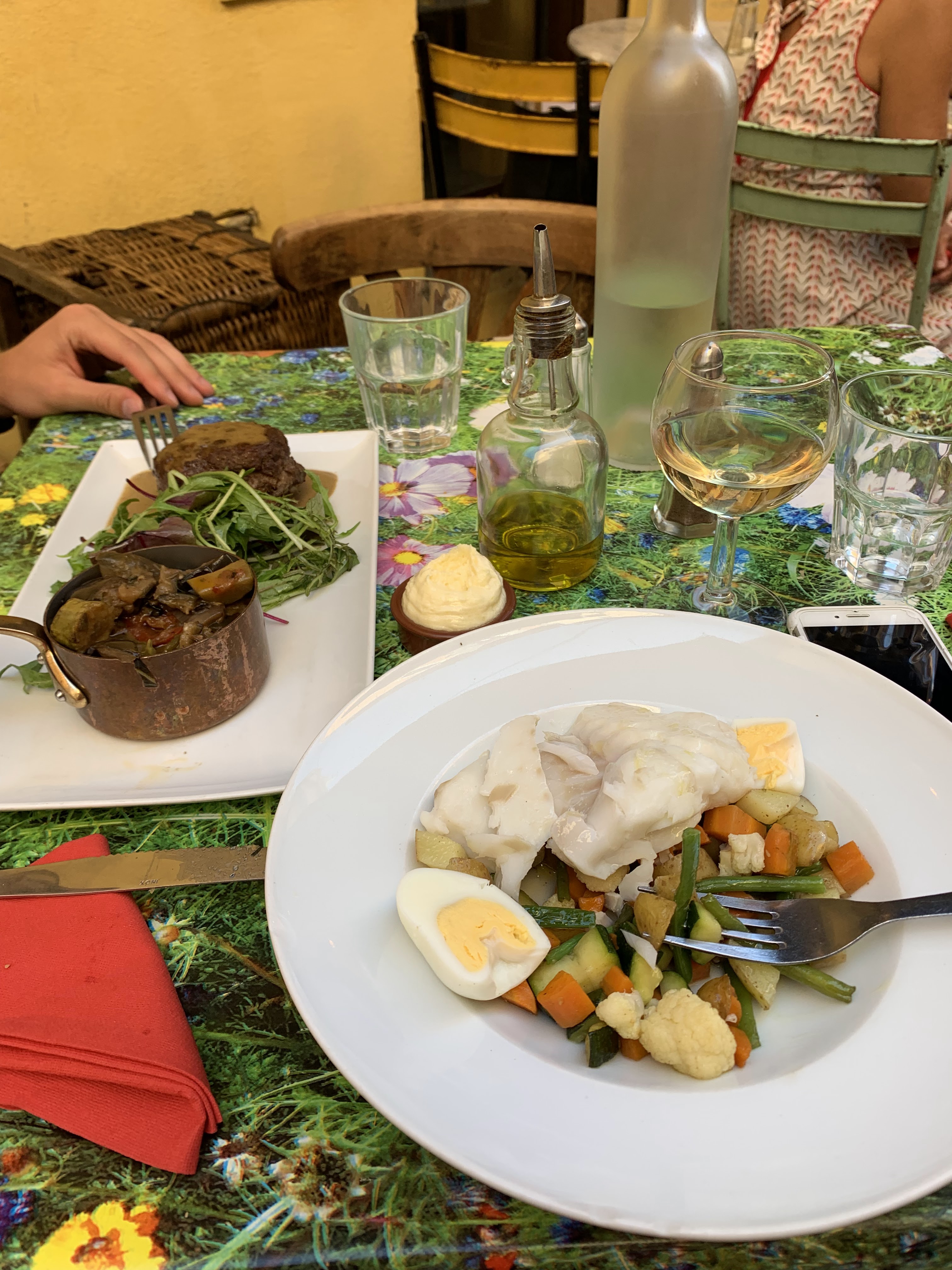 Restaurant vraiment occupé. Je ne me sentais pas à l'aise assis si près des autres tables. De plus, le personnel avait son masque sur le menton et parlait sans masque. Burrata et tomate : rien de spécial. Morue aïoli : savoureuse. Steak : le bœuf était tellement dur !!!!! Je suis sûr qu'il y a de meilleurs restaurants dans les environs.