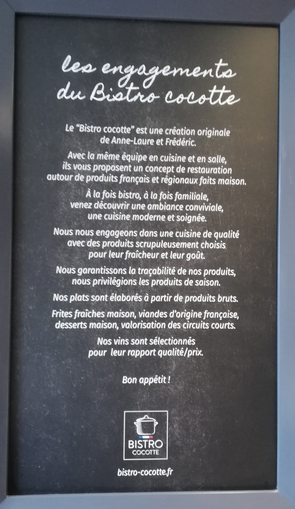 Nous nous sommes rendu ce soir à bistrot cocotte avec une réservation de notre part dans la journée, hors des l'arrivée notre appel n'avait pas été pris en compte. Une fois à table, lors de la prise de commande des boissons nous avons fait face à une serveuse très désagréable que nous avons eu l'impression de déranger ... 10 min plus tard un autre serveur s'est occupé de notre commande. Un peu plus aimable pour sa part. Les serveuses en nous apportant nos plats se sont trompées 2 fois... nous avions également demandé des suppléments de sauce lors de la prise de commande des plats, nous avons été obligé de les redemander, la serveuse nous les a balancé sur la table sans même nous souhaiter un bon appétit. Les plats et desserts restent corrects mais l'accueil est à fuir absolument !!!