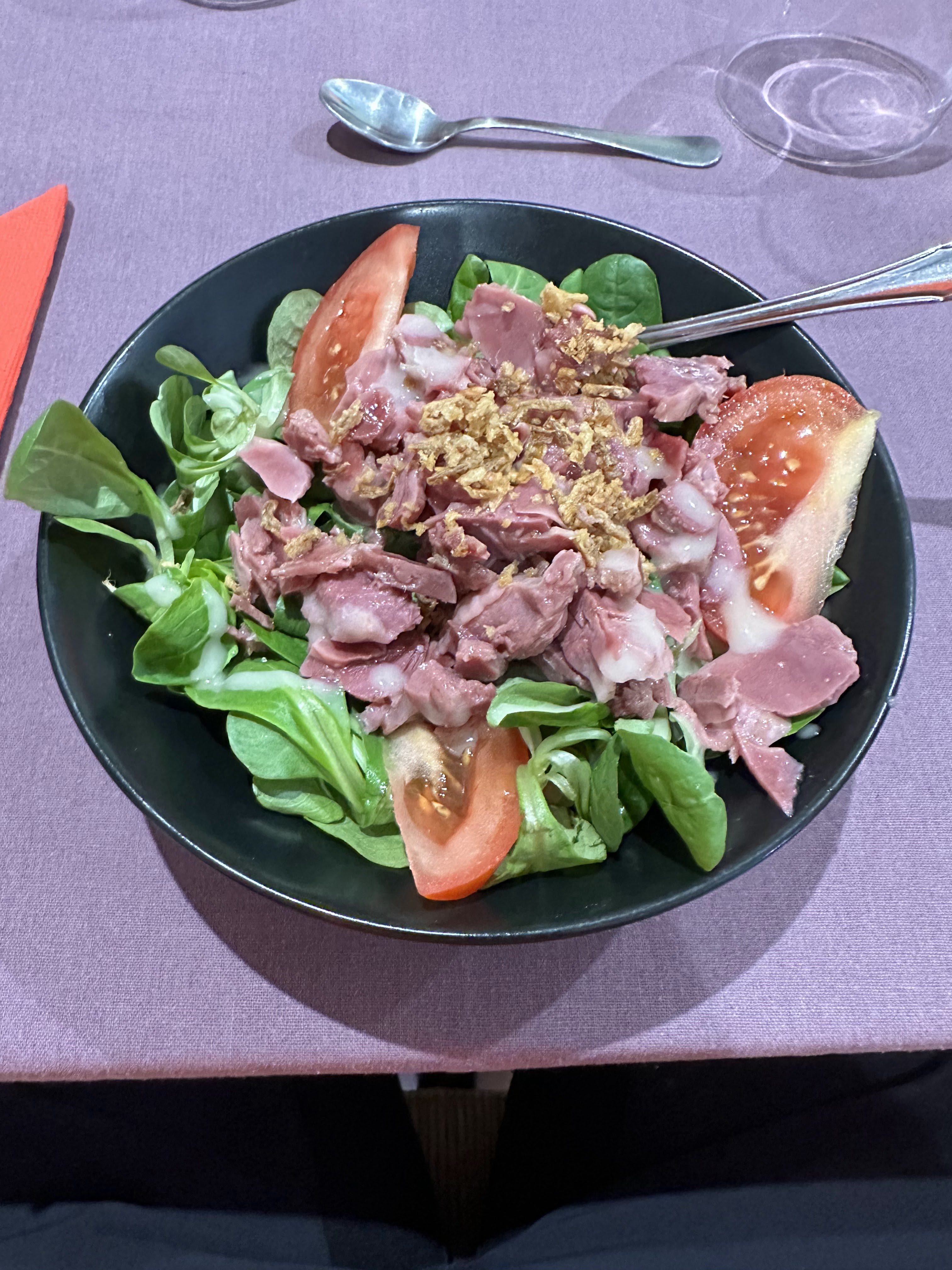Repas après une assemblée générale d'association. Nous étions 27 adultes. Très très bien mangé ! Menu établi avec le chef entrée salade de gésiers confits ou salade de calamars, en plat queue de lotte à l'armoricaine ou joue de bœuf ail et persil. Fromage et dessert. Compris le kir, le vin rouge et le café pour un prix bloqué à 30 euros. Au vu de la qualité du repas et la quantité servi je peux vraiment dire un très très bon rapport qualité/prix. Patron et patronne bien sympathiques....