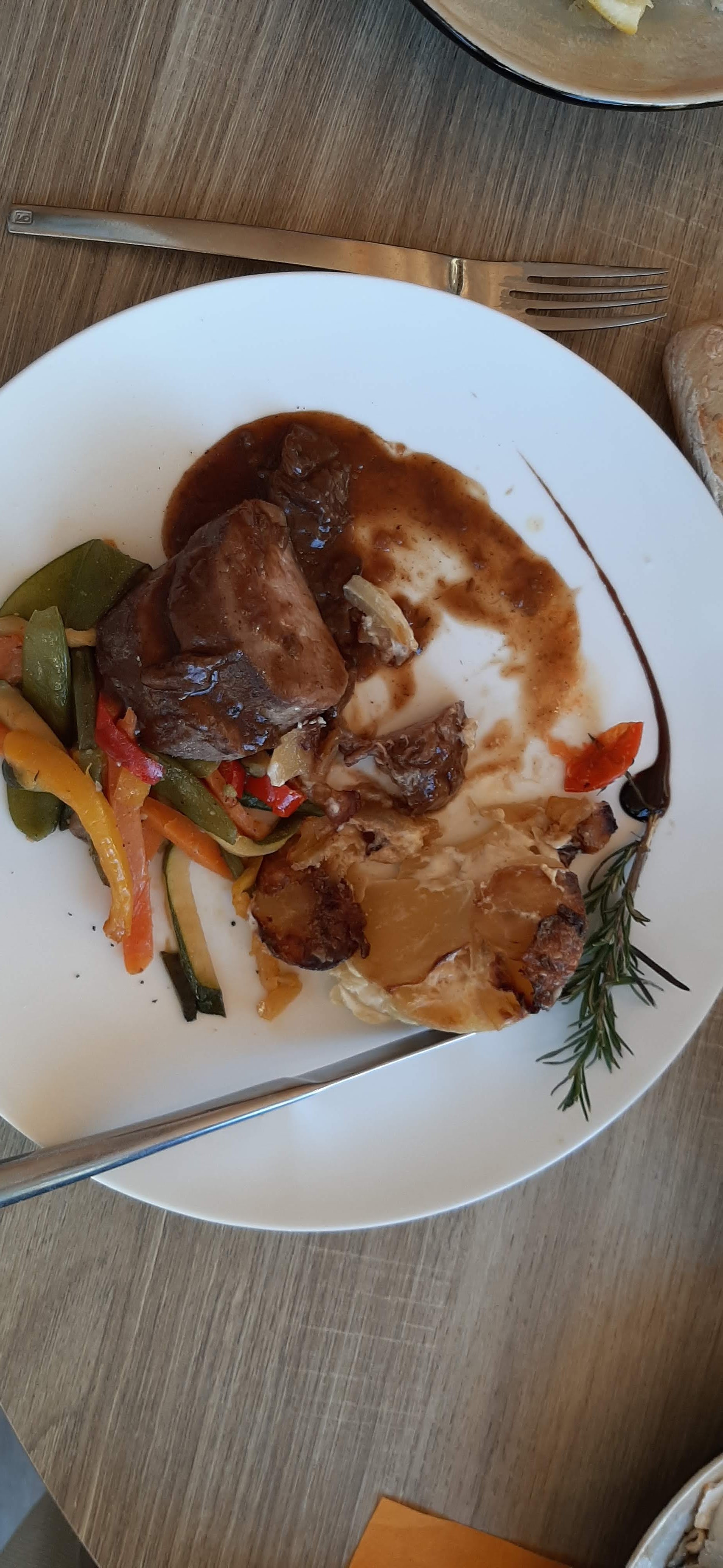 Je me suis régalée avec le farci tomates et petite courgette. Ce n'était pas farci avec de la chair à saucisse, c'était vraiment très bien. Bravo au cuisiner, bon en plus il n'y a pas d'attente, le service est correct.