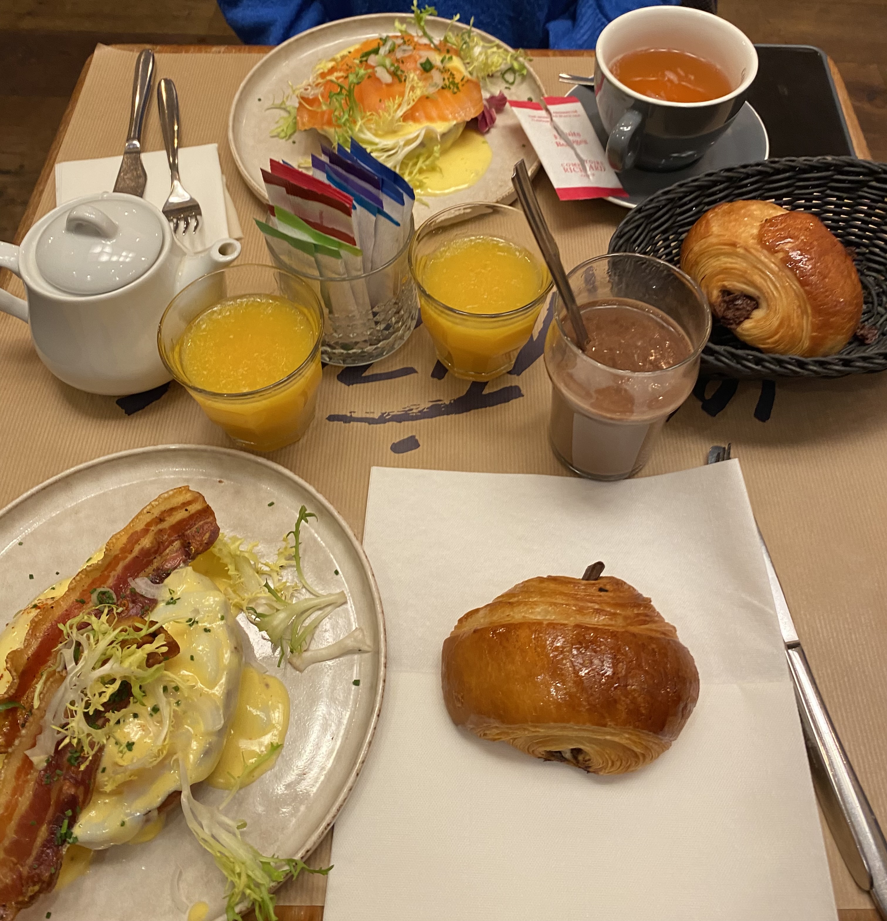Points positifs: la variété/Le buffet à volonté/Le style/L'emplacement/Le chocolat/L'ambiance/Le croissant et le pain Points à revoir: L' attente pour le service à l'assiette/Le froid au fond de la salle/L'oeuf pas assez chaud sur un pain pas assez grillé/La différence sur le contenu des panières en fonction des tables