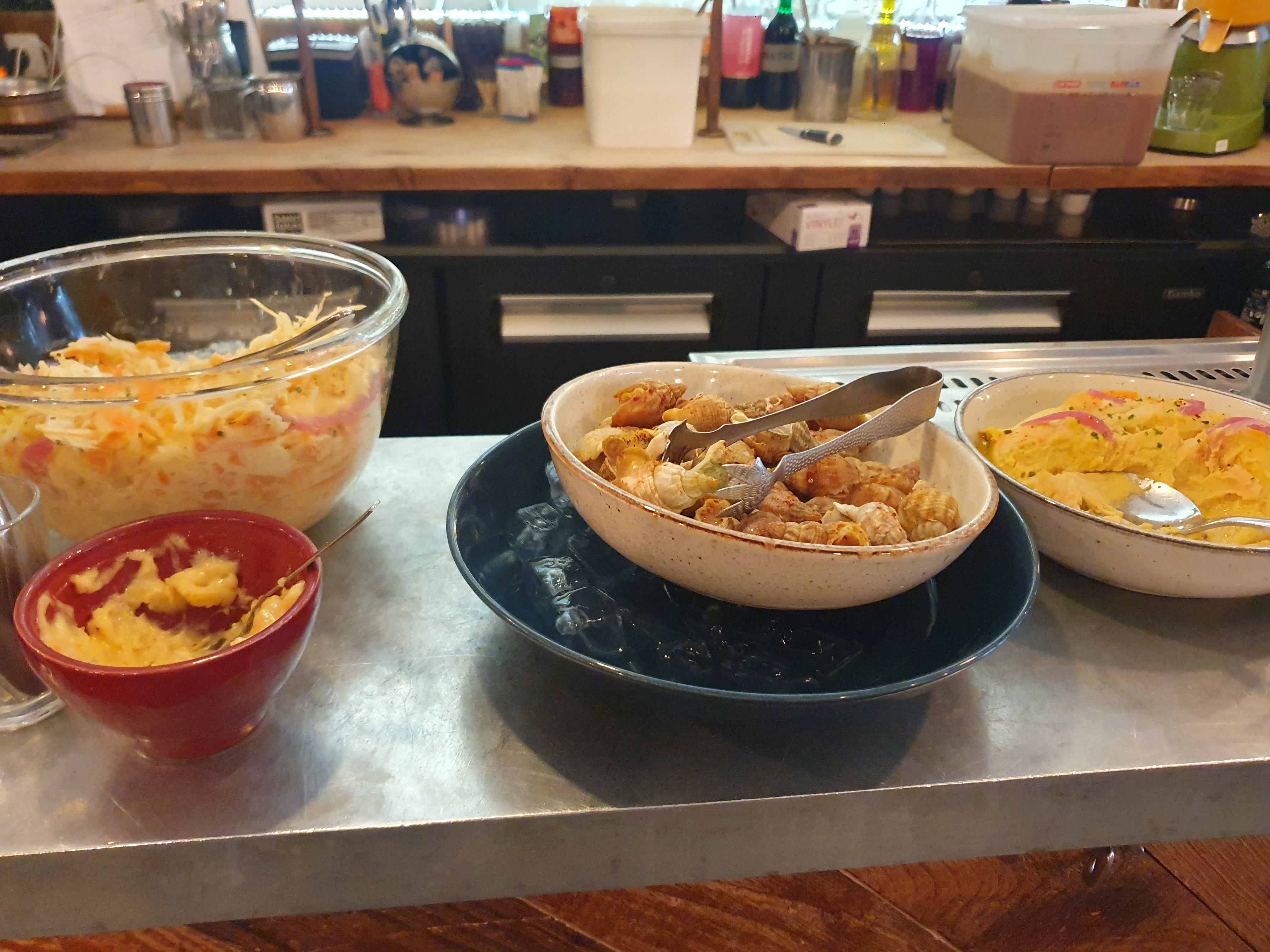 Brunch très orienté fruits de mer: crevettes, bulots, saumon... Choix intéressant sur le sucré. Un seul jus de fruits proposé: aujourd'hui, fruits de la passion avec de la glace pilée dedans... Organisation trop hermétique: ordre dans la prise des plats imposé: d'abord les boissons chaudes, le plat et uniquement après accès au buffet. Le prix reste honnête sur la qualité des produits proposés.