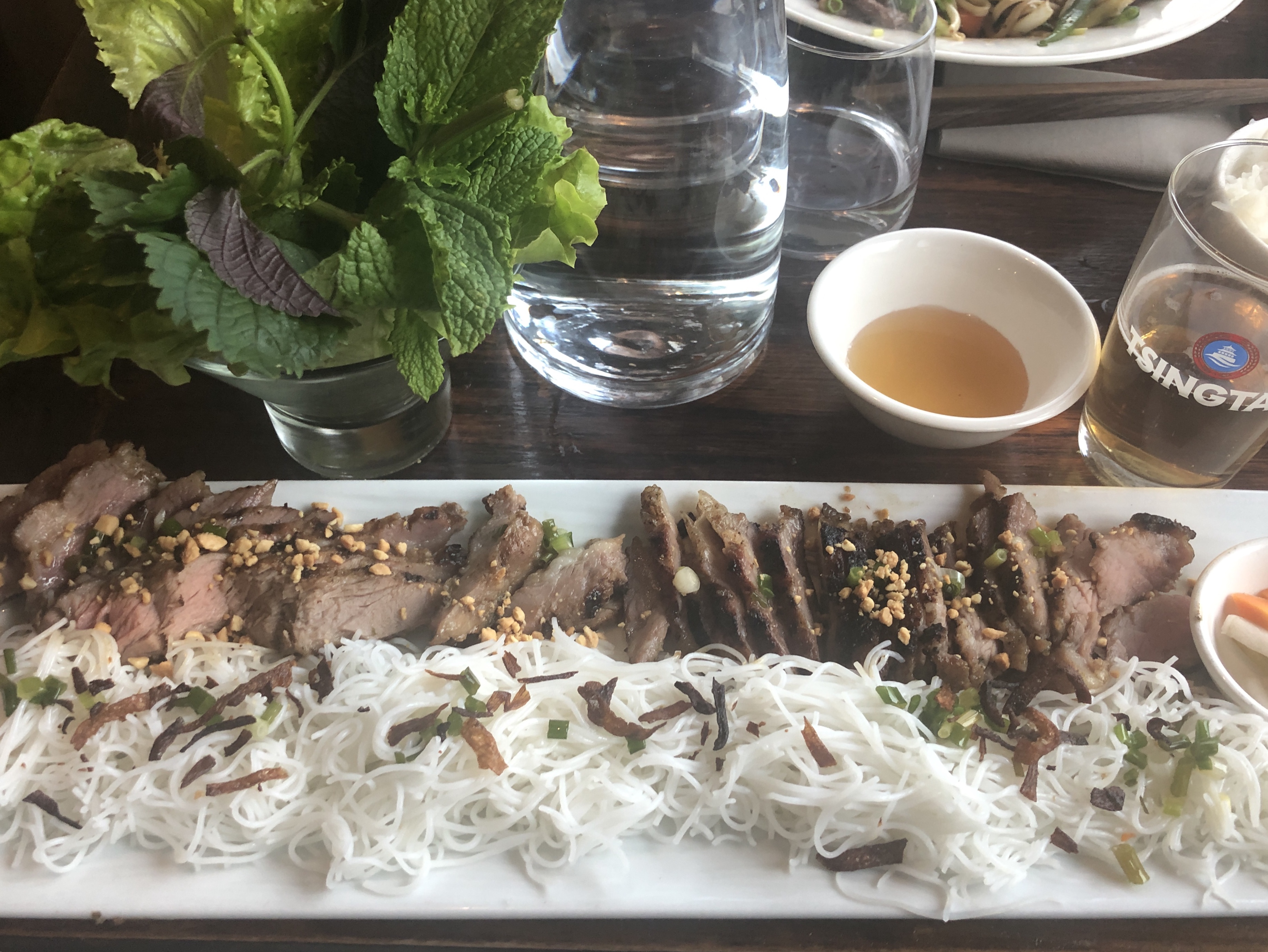 Très bon accueil, les plats du jour étaient tous appétissants et nous avons pu manger rouleaux de printemps, raviolis au porc..., tout était très bon. L'entrecôte était délicieuse, sa sauce aussi. Le poisson était excellent, avec la peau bien grillée et les aubergines très fondantes. Je conseille de manger (comme recommandé) la poitrine de porc avec la salade, herbes et vermicelles, c'est top. Attente un peu longue.
