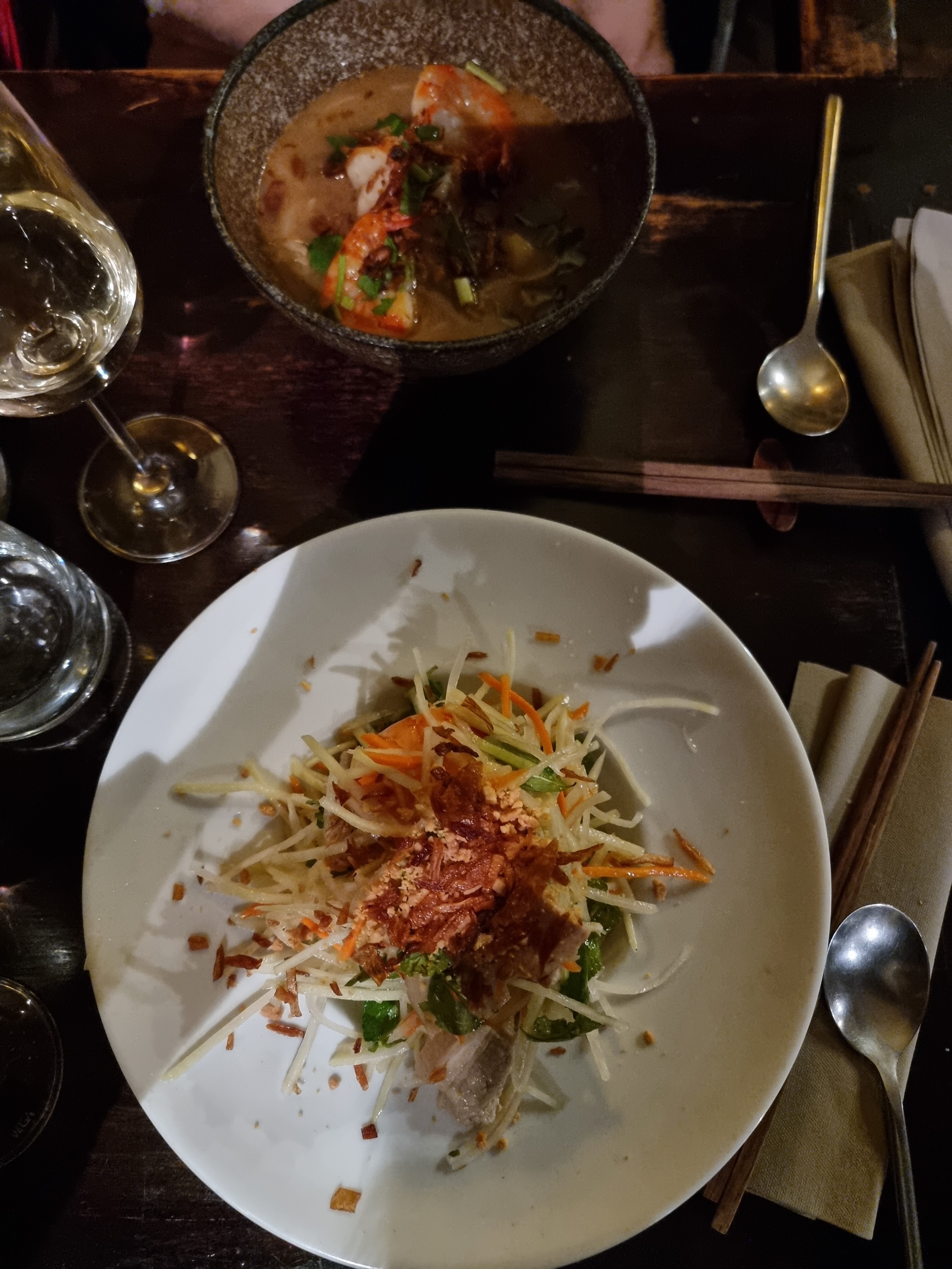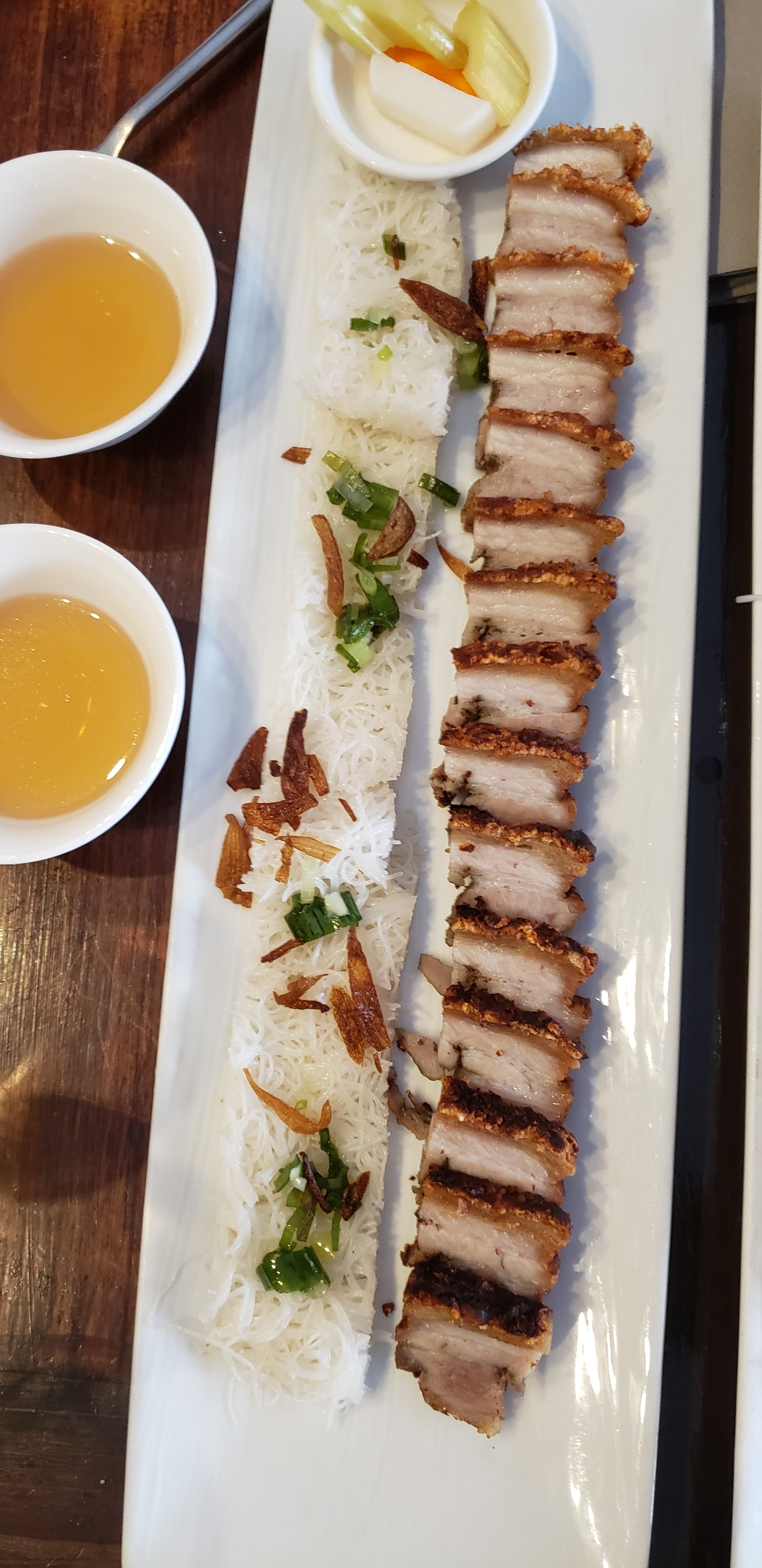 Bonne nourriture, excellent service. Petite carte des vins, mais avec des vins qui s'accordent bien avec la cuisine. La salade de papaye verte et de carottes au porc et aux crevettes était délicieuse. La poitrine de porc croustillante et les vermicelles étaient parfaites. Très bon service.