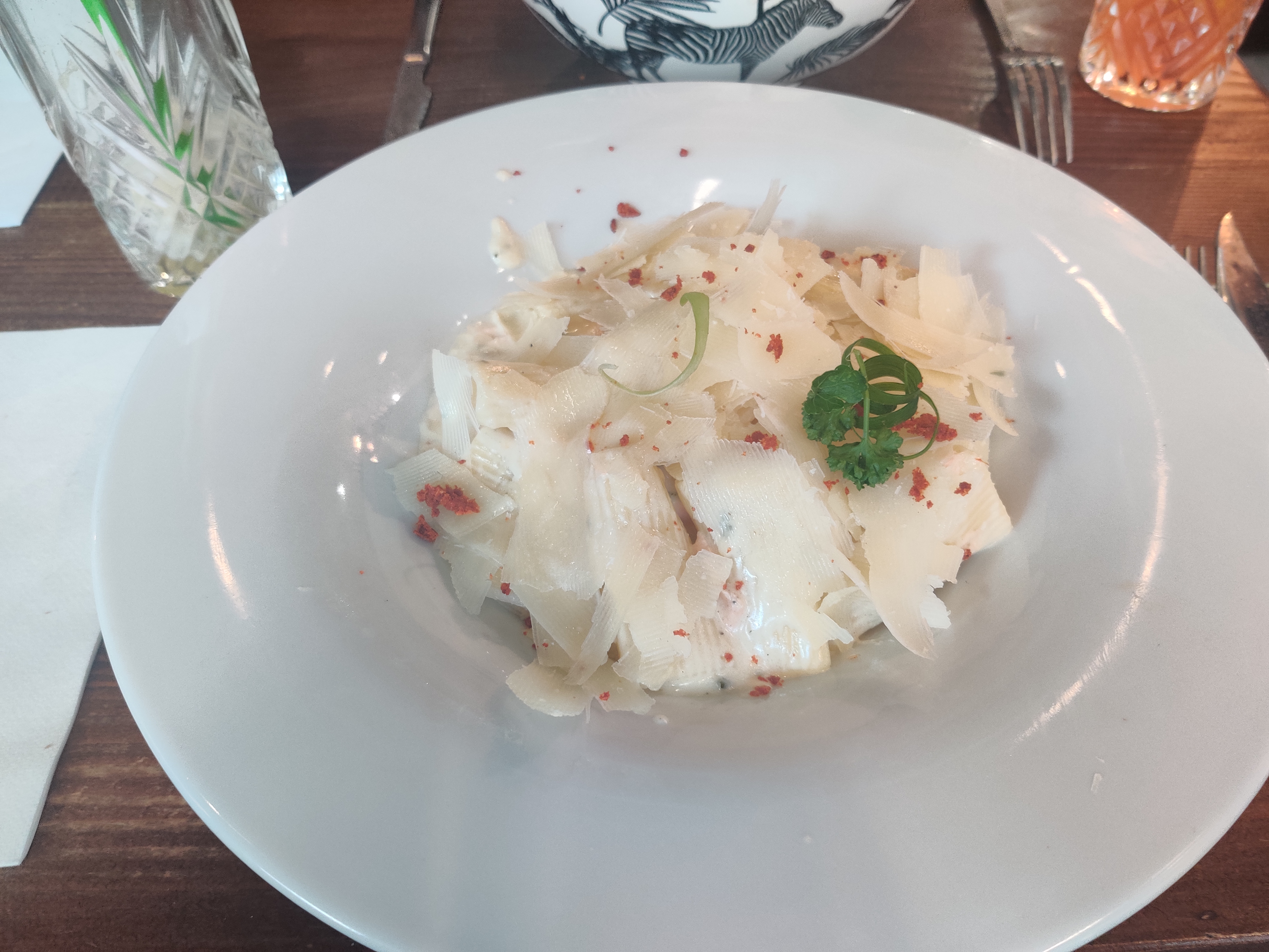 Le cadre était beau du coup je vais pour dinner : - le serveur ultra sec - nous avons pris deux pâtes aux truffes et c’était degeulasse voir immangeable. Les pâtes était pas cuite et la sauce on aurait dit de l’eau. Les pâtes n’avait aucun goût on aurait dit les soupes maggi en boîte ou on verse de l’eau et on mange. - le seul point positif c’était le cocktail qui était plutôt bon. En tout cas très déçu par le plat ne vous fiez pas aux apparences.